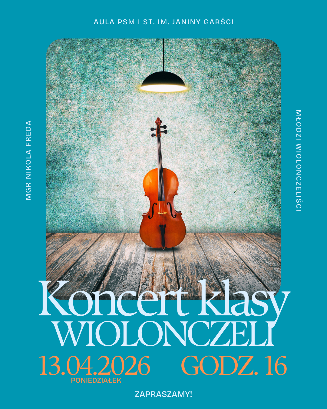 13 kwietnia 2026, w poniedziałek, na godzinę 16:00, zapraszamy do sali koncertowej Szkoły Muzycznej w Tczewie na KONCERT klasy WIOLONCZELI mgr Nikoli Fredy.