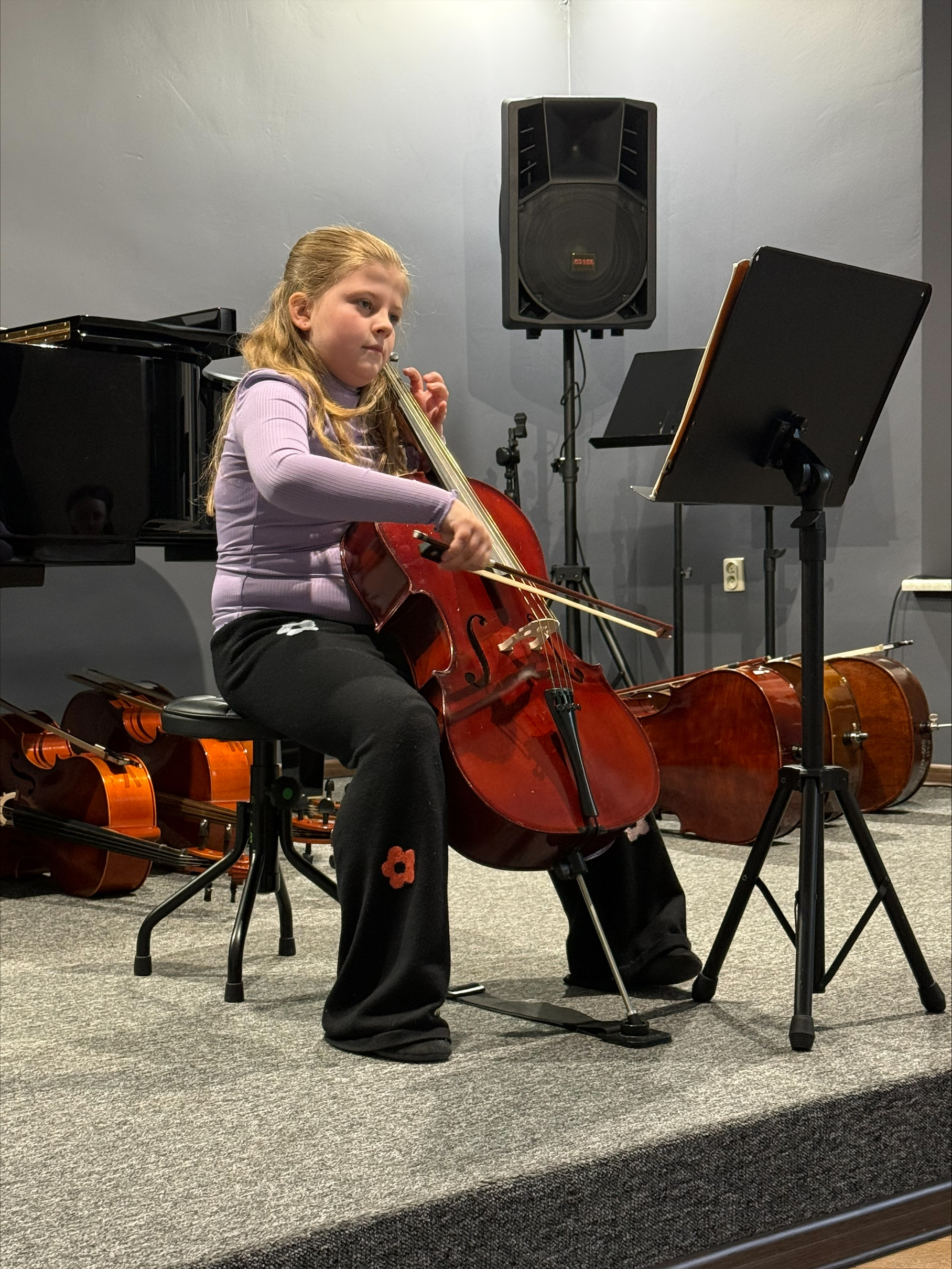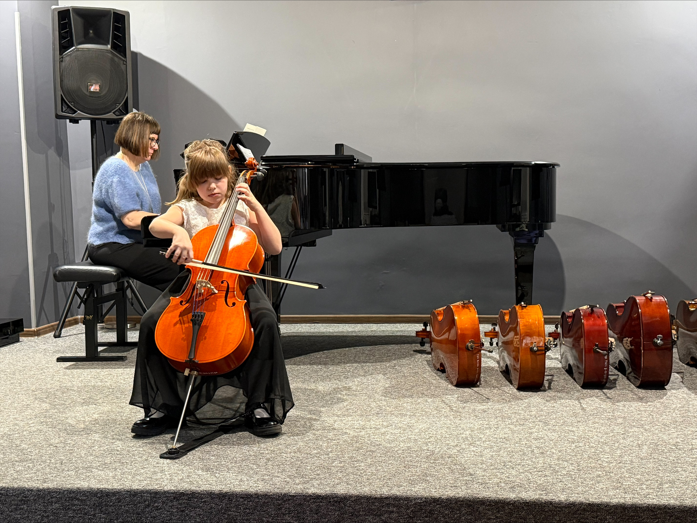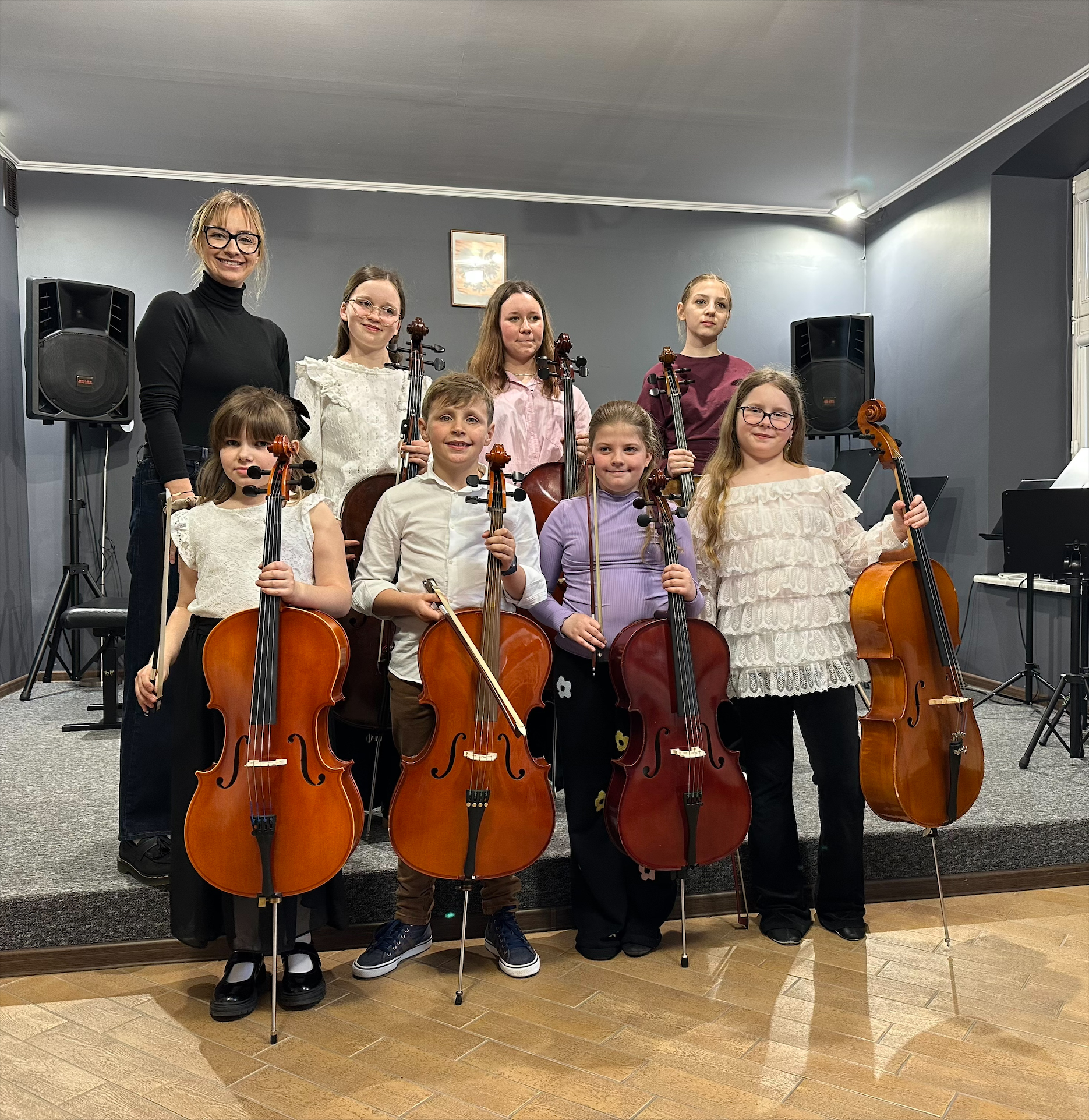 Oto klasa wiolonczeli p. Nikoli Fredy. Podczas koncertu, który odbył się 13 kwietnia 2026 r. w sali koncertowej naszej szkoły, w wykonaniu uczniów usłyszeliśmy najpiękniejsze utwory wiolonczelowe i Concertino Brevala. Uczniom przy fortepianie towarzyszyła p. Monika Madej-Strukiel.