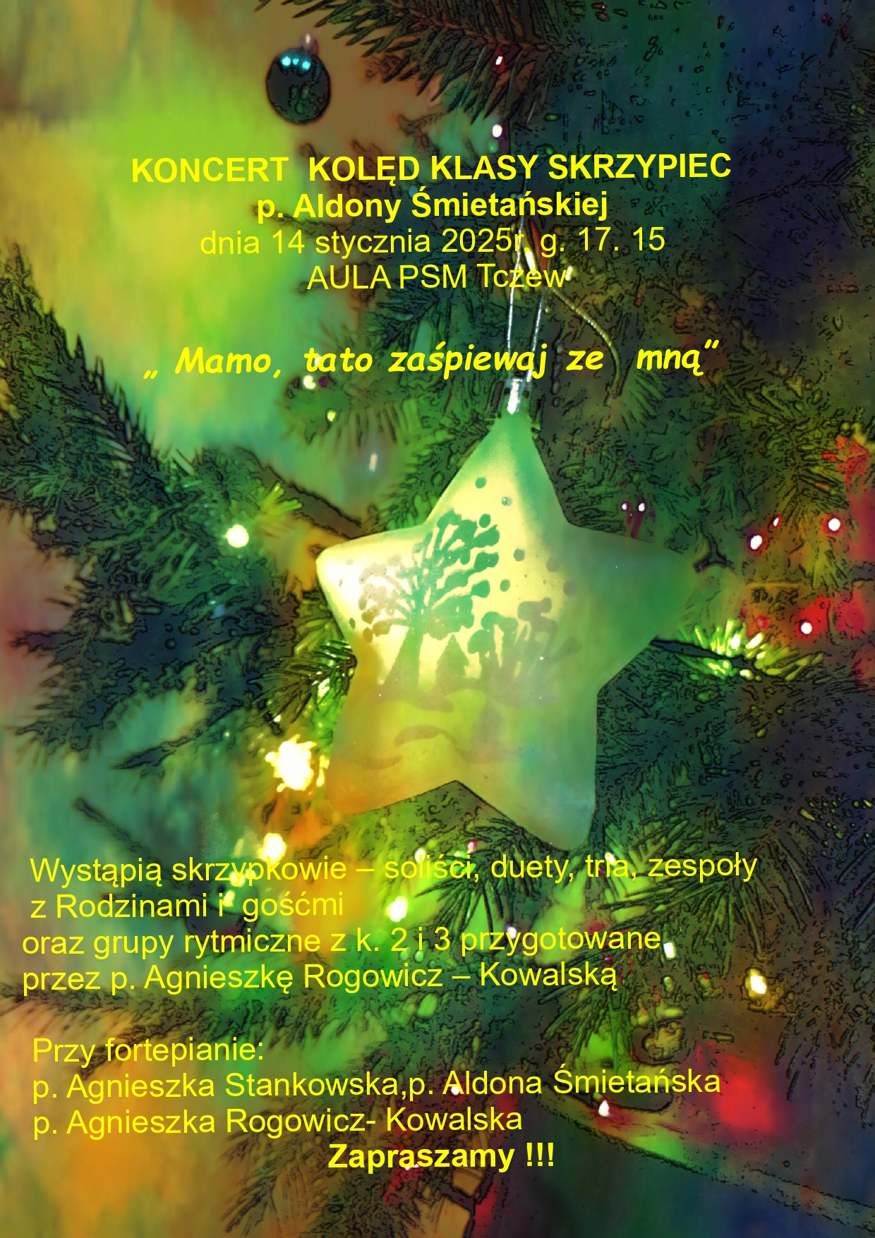 14 stycznia 2025 r. na godzinę 17:15 do Auli PSM Tczew zapraszamy na Koncert kolęd klasy skrzypiec p. Aldony Śmietańskiej - "Mamo, tato zaśpiewaj ze mną".