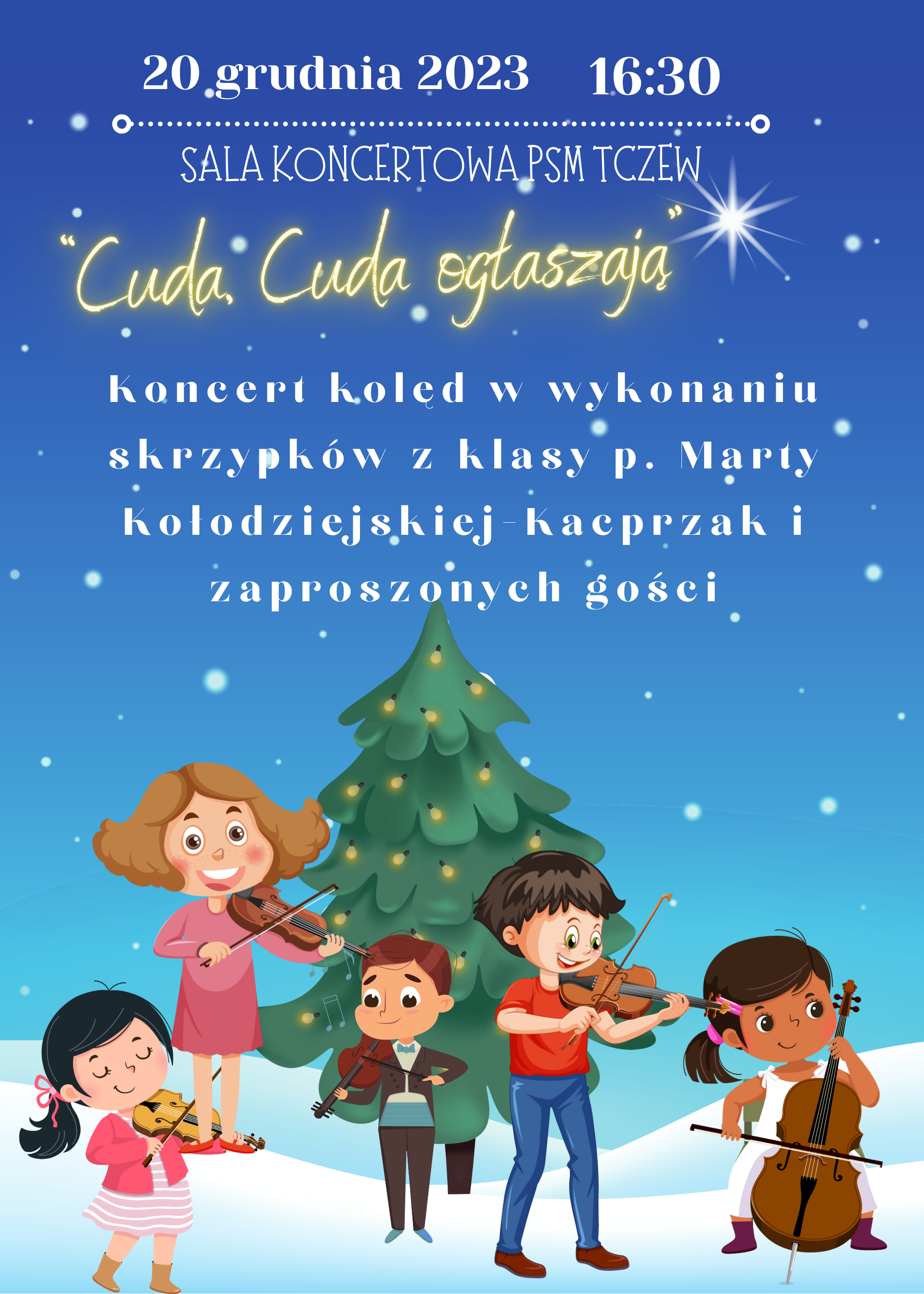 Serdecznie zapraszamy na "Cuda, cuda ogłaszają" - Koncert w wykonaniu uczniów p. Marty Kołodziejskiej-Kacprzak i zaproszonych gości. Koncert odbędzie się 20 grudnia 2023 r. (środa) o godzinie 16:30 w sali koncertowej PSM w Tczewie.