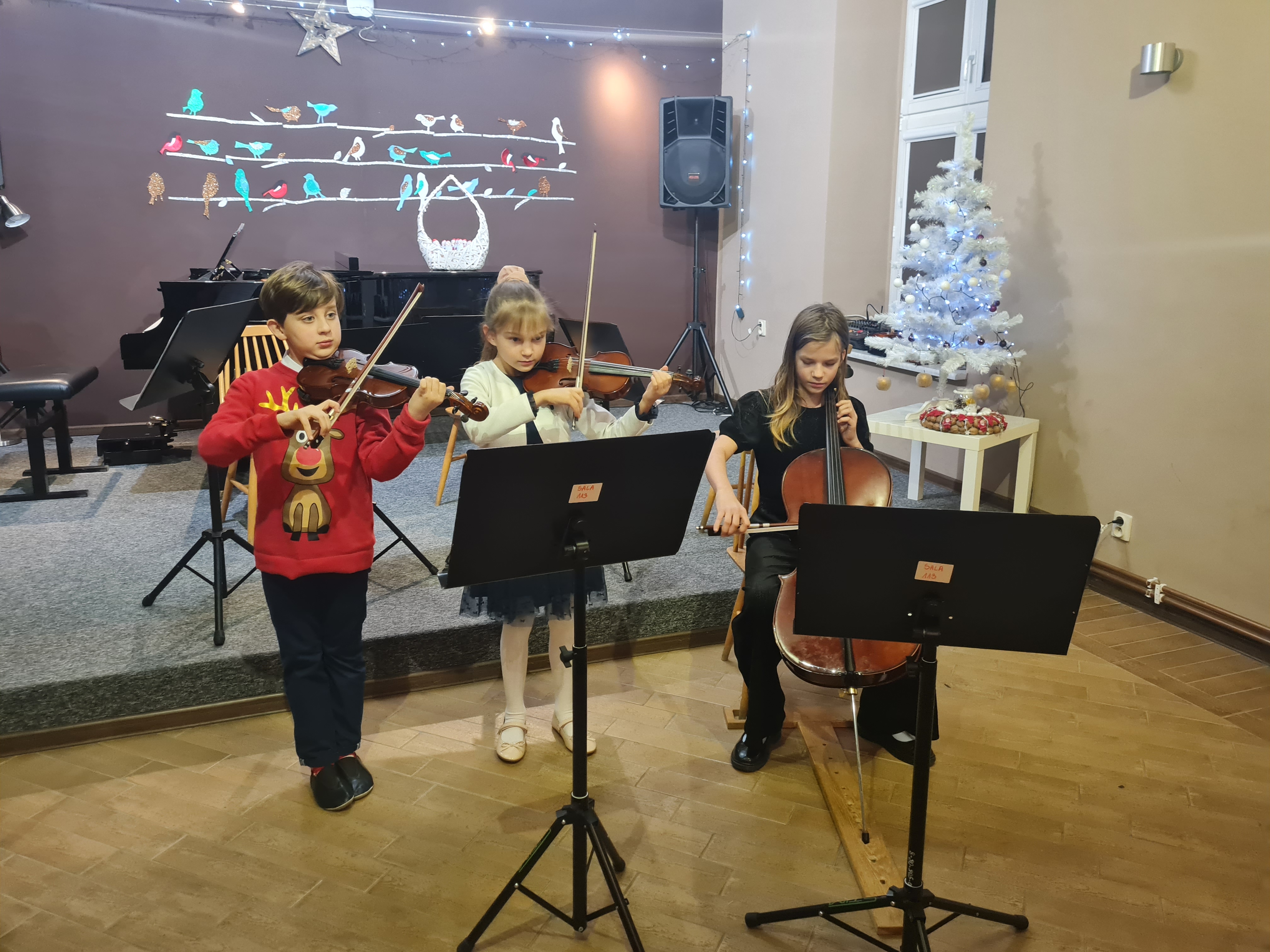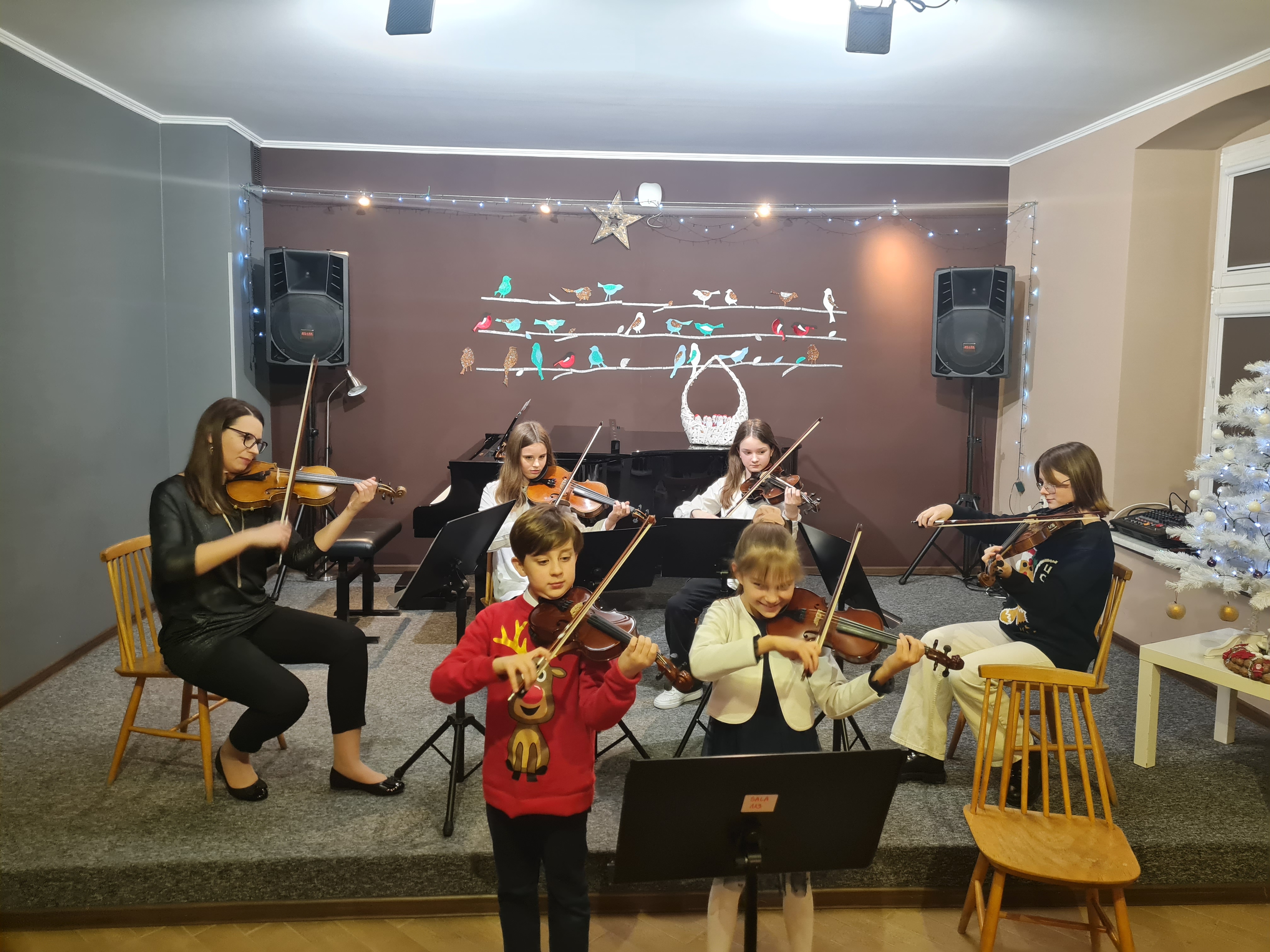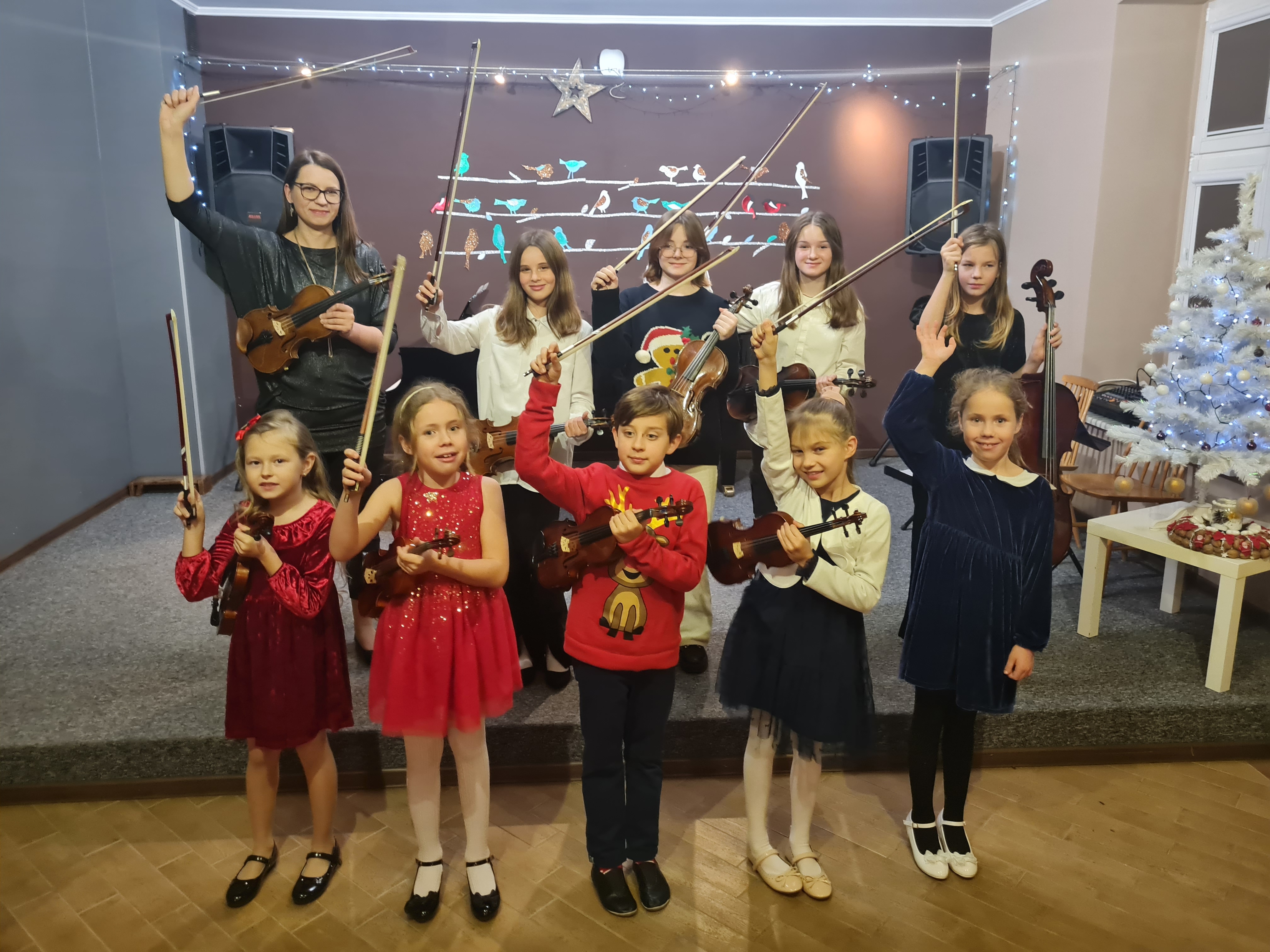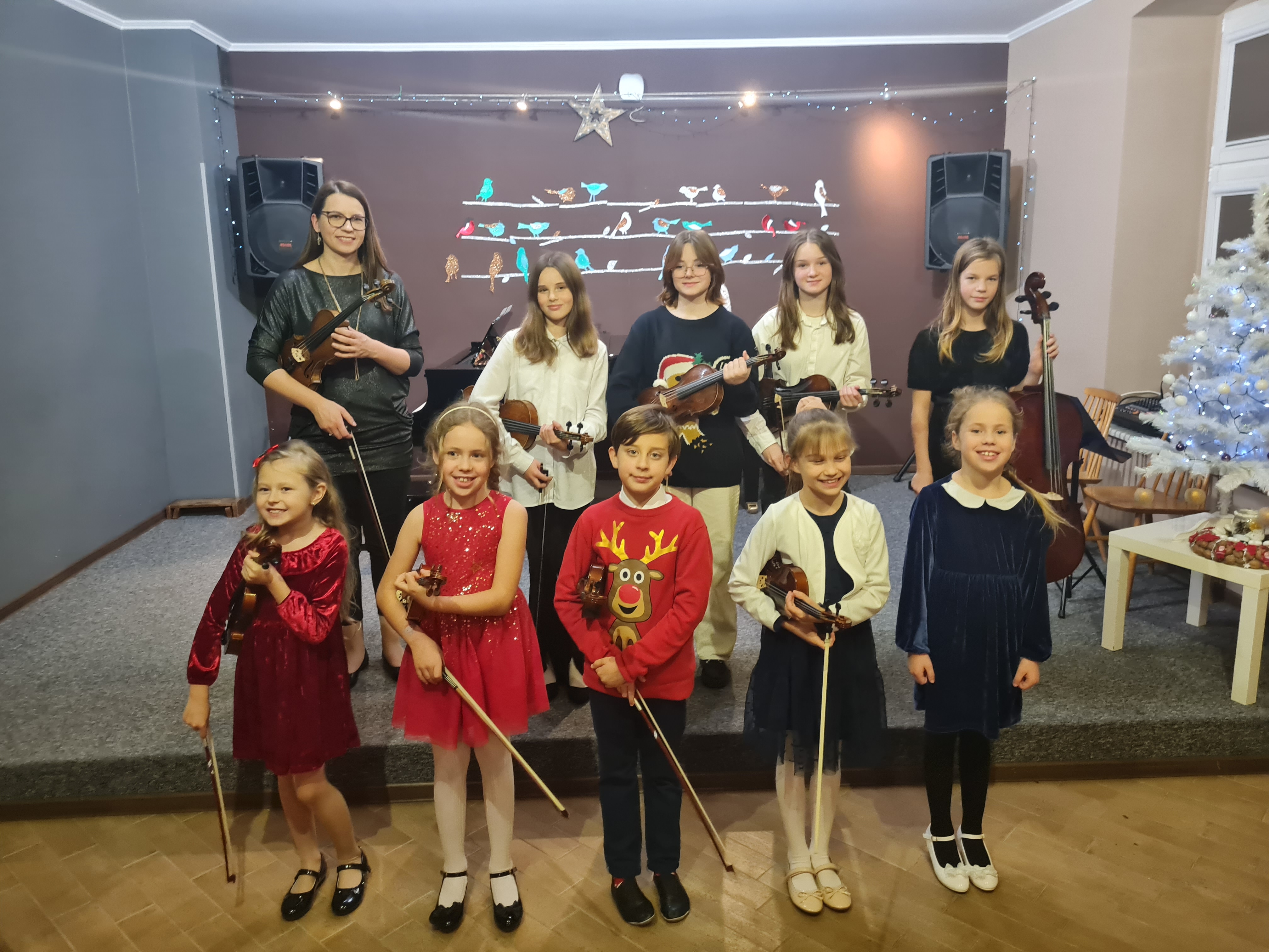 20 grudnia 2023 kolędy zagrali (i zaśpiewali) skrzypkowie - uczniowie p. Marty Kołodziejskiej-Kacprzak oraz zaproszeni goście. Polskie kolędy i piosenki świąteczne w różnych składach i ciekawych aranżacjach wykonali: Iga i Lena Hencel, Nicole Gołucka, Kajetan Woźniak, Liwia Cendal, Pola Piernicka, Martyna Gorlikowska, Agata Sikorska, Iga Bakuła oraz p. Marta Kołodziejska-Kacprzak. Jak zawsze nie zabrakło wspólnego śpiewu z publicznością. Koncert odbył się w sali koncertowej szkoły. Gratulujemy udanych występów.
