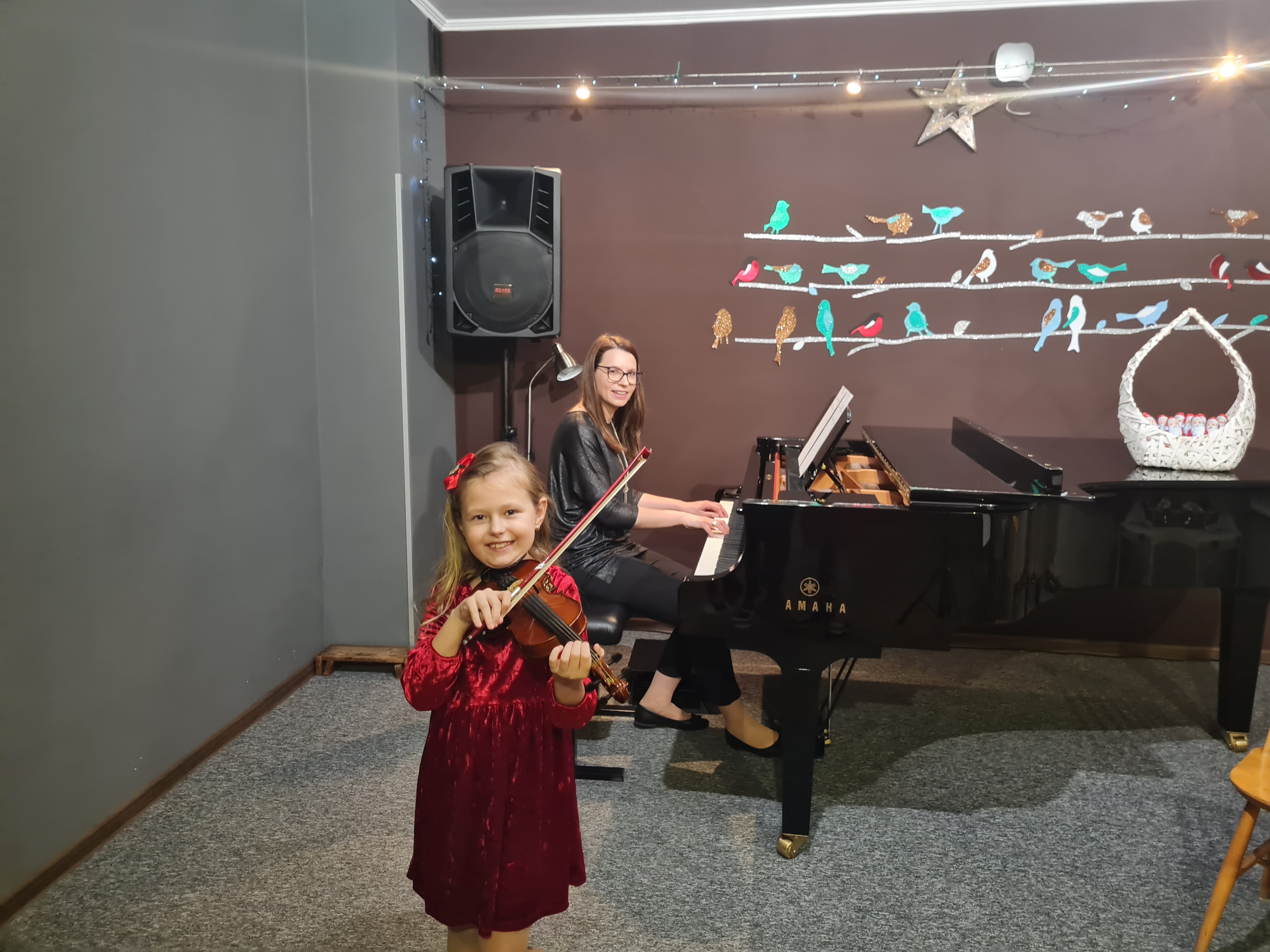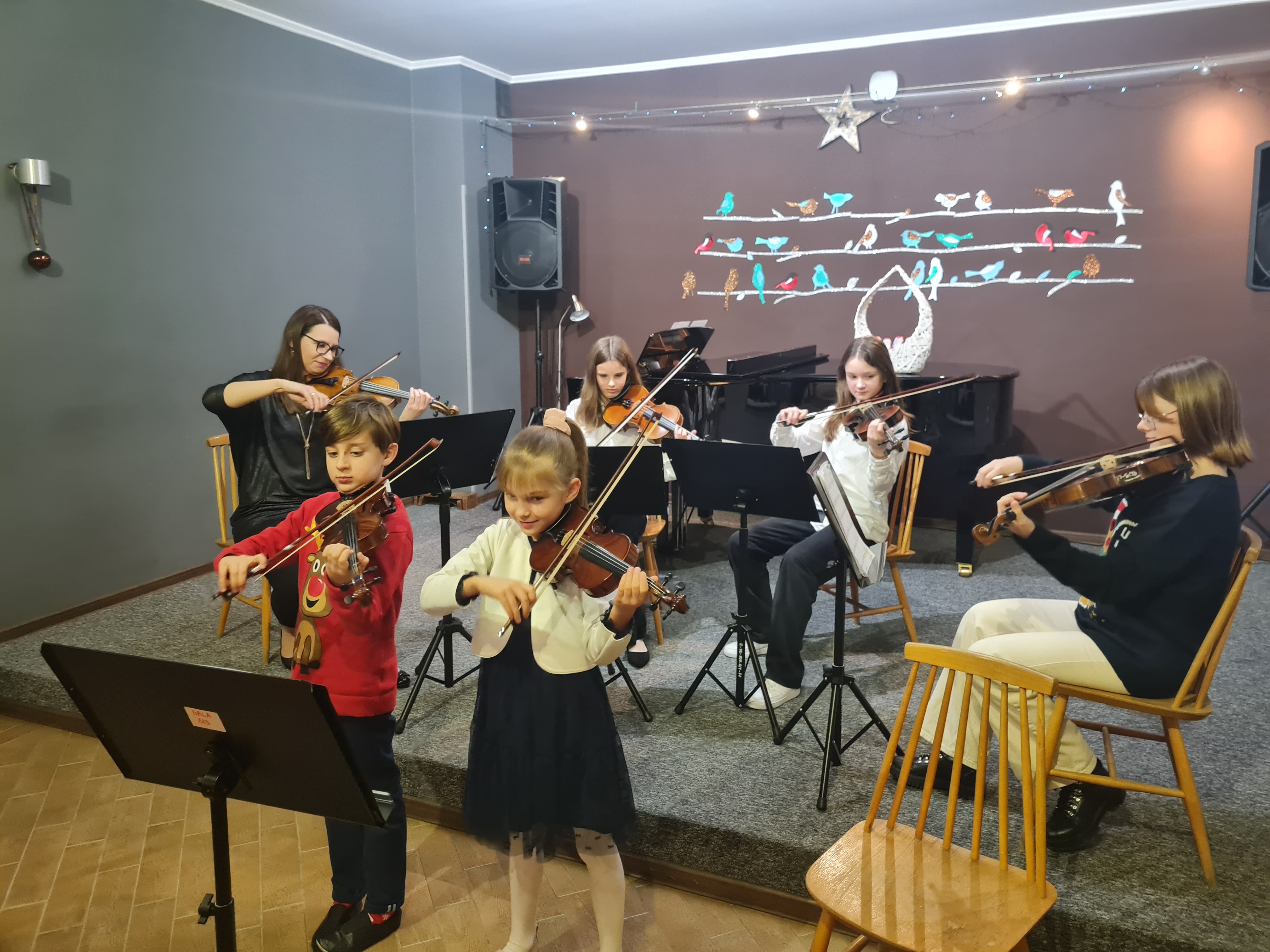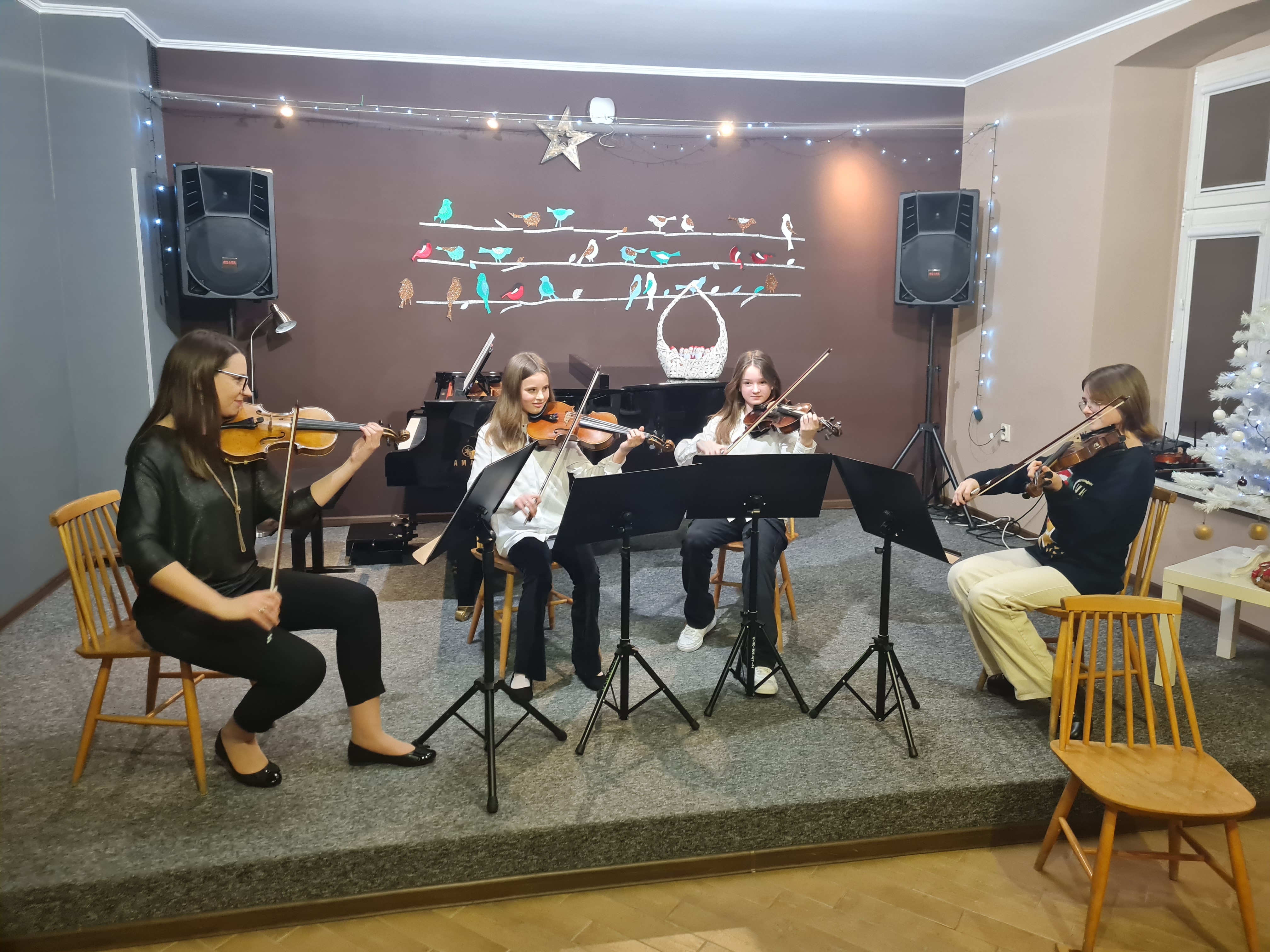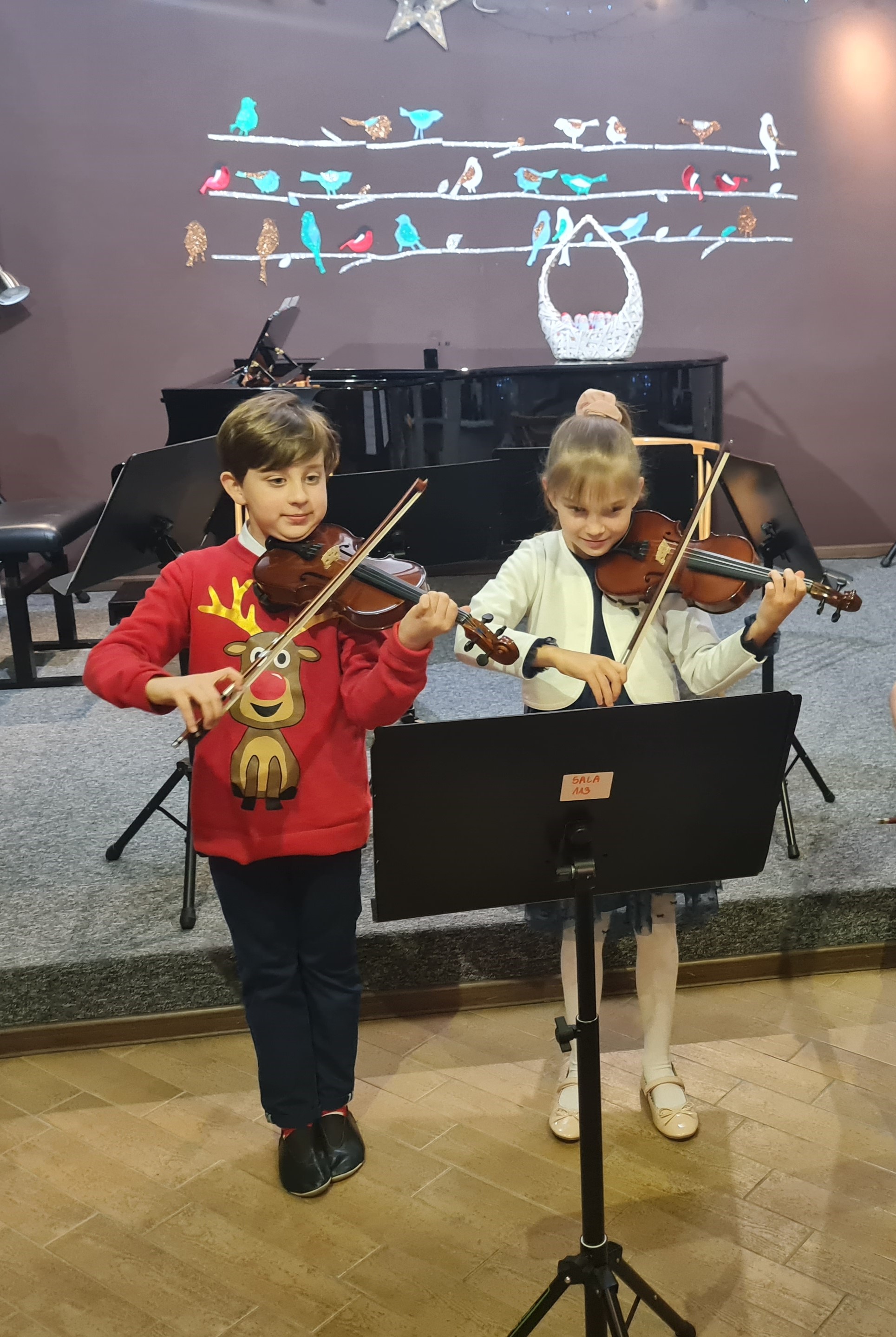 20 grudnia 2023 kolędy zagrali (i zaśpiewali) skrzypkowie - uczniowie p. Marty Kołodziejskiej-Kacprzak oraz zaproszeni goście. Polskie kolędy i piosenki świąteczne w różnych składach i ciekawych aranżacjach wykonali: Iga i Lena Hencel, Nicole Gołucka, Kajetan Woźniak, Liwia Cendal, Pola Piernicka, Martyna Gorlikowska, Agata Sikorska, Iga Bakuła oraz p. Marta Kołodziejska-Kacprzak. Jak zawsze nie zabrakło wspólnego śpiewu z publicznością. Koncert odbył się w sali koncertowej szkoły. Gratulujemy udanych występów.