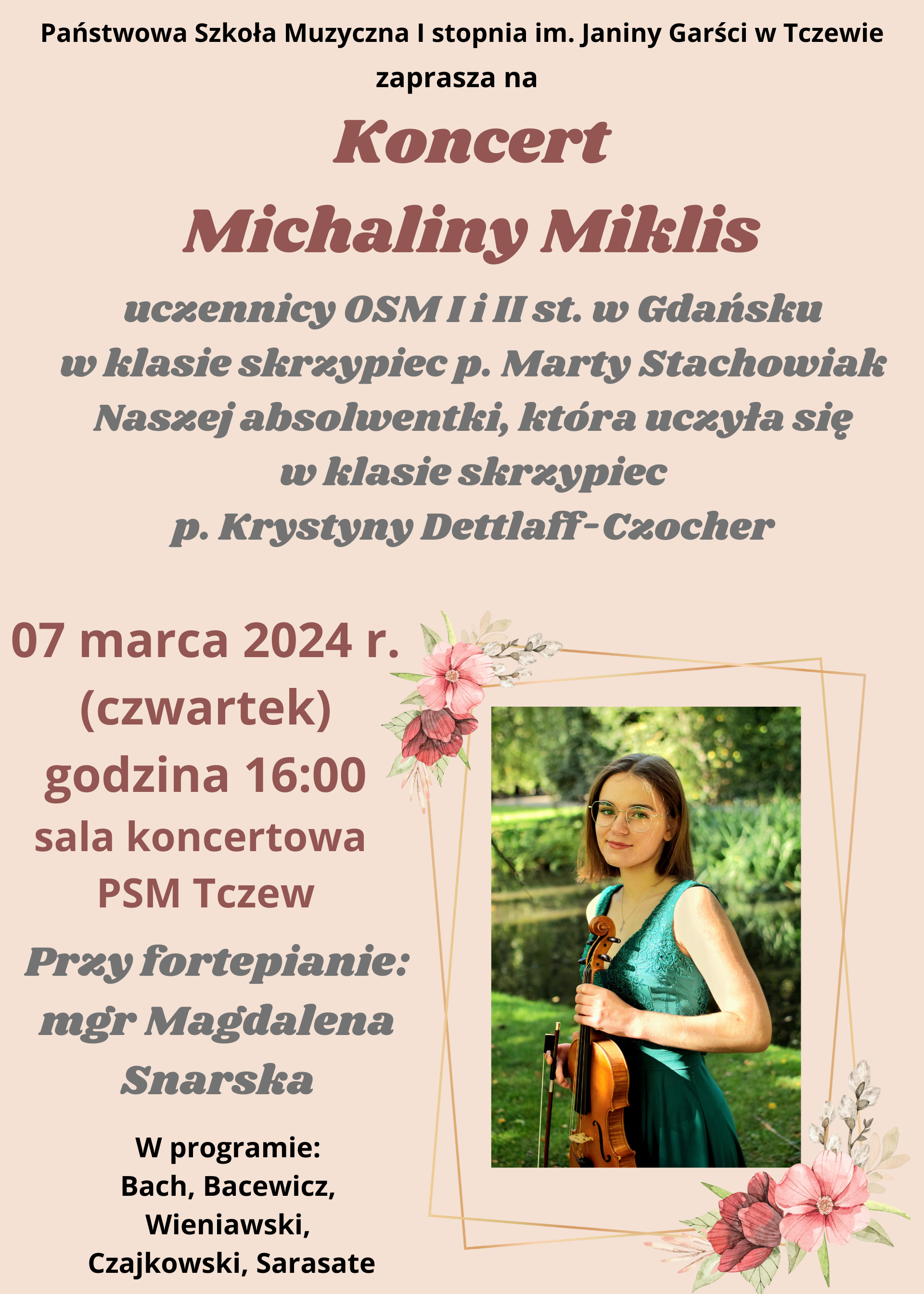 Zapraszamy na Koncert Michaliny Miklis, uczennicy OSM I i II st. w Gdańsku w klasie skrzypiec p. Marty Stachowiak, a naszej absolwentki w klasie skrzypiec p. Krystyny Dettlaff-Czocher. Koncert odbędzie się 07 marca 2024 r. (czwartek) o godzinie 16:00 w sali koncertowej szkoły. Razem z Michaliną na scenie przy fortepianie wystąpi mgr Magdalena Snarska. W programie usłyszymy kompozycje: Bacha, Bacewicz, Wieniawskiego, Czajkowskiego, Sarasate. Zapraszamy!