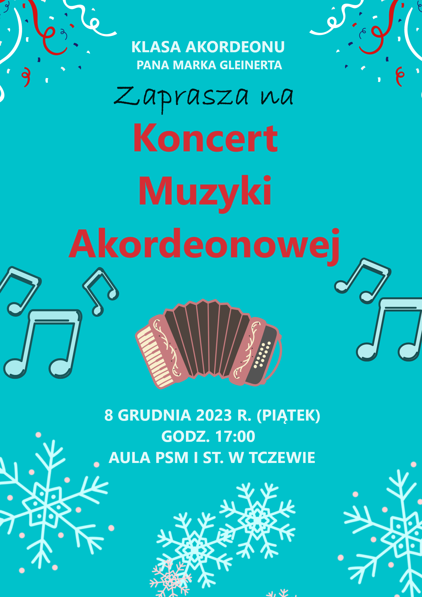 Serdecznie zapraszamy na Koncert klasy akordeonu p. Marka Gleinerta, który odbędzie się 08 grudnia 2023 r. o godzinie 17:00 w sali koncertowej PSM Tczew.