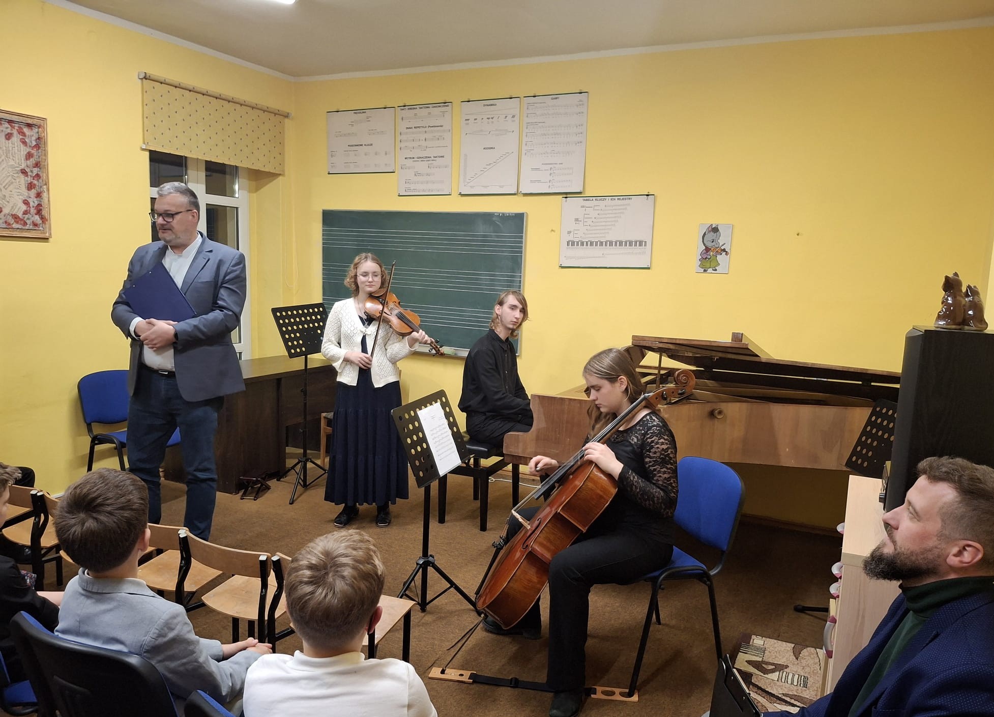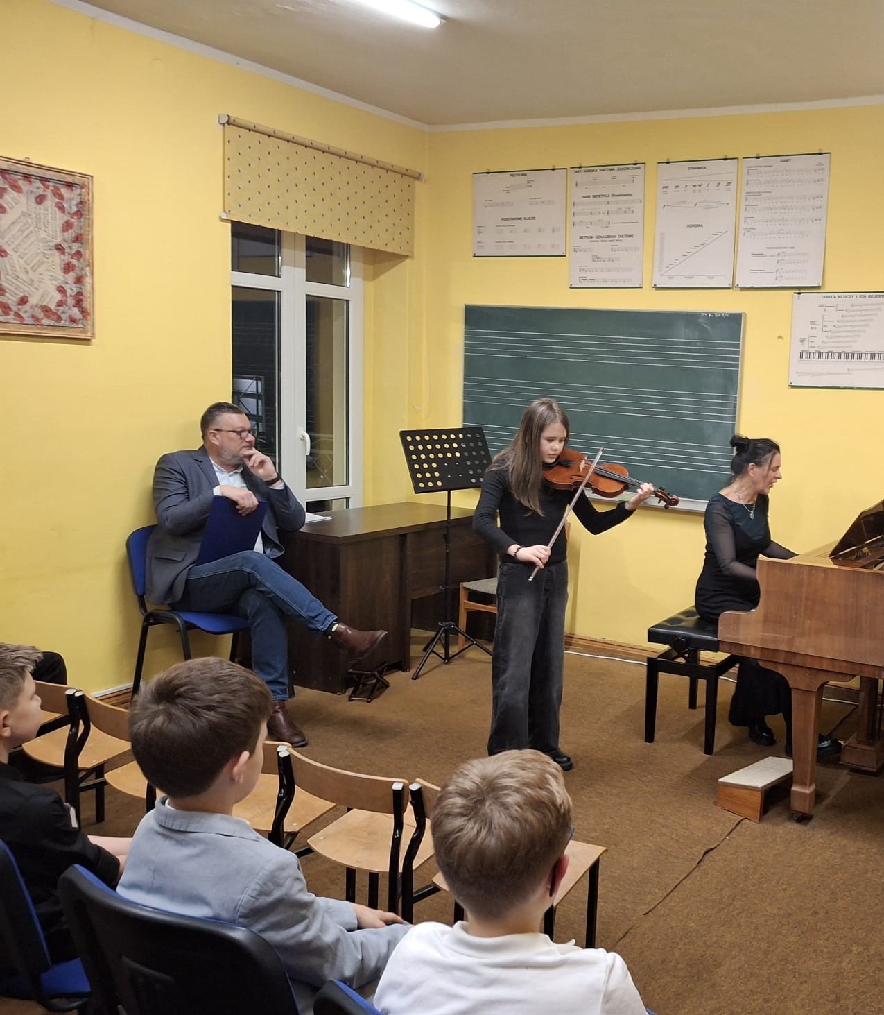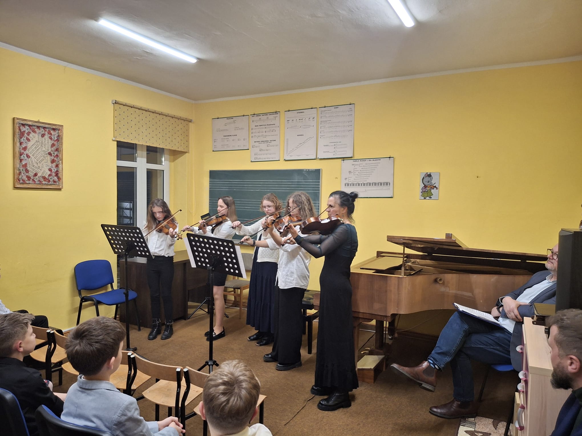 Wczoraj (12 listopada 2025 r.) w Filii Państwowej Szkoły Muzycznej I stopnia w Pelplinie odbył się koncert muzyki polskiej. Na scenie zaprezentowali się uczniowie szkoły, wykonując utwory wybitnych polskich kompozytorów – od klasyki Fryderyka Chopina po dzieła współczesnych twórców. Młodzi muzycy pokazali nie tylko swoje umiejętności techniczne, ale także wrażliwość interpretacyjną i radość wspólnego muzykowania. Miłym akcentem wieczoru był występ solowy pani Anety Karwowskiej-Bielak – mamy dwóch naszych uczniów – który spotkał się z ciepłym przyjęciem publiczności. Koncert poprowadził pan Tadeusz Negowski, który wprowadzał słuchaczy w świat muzyki pełen ciekawostek i anegdot, nadając spotkaniu wyjątkowy charakter.