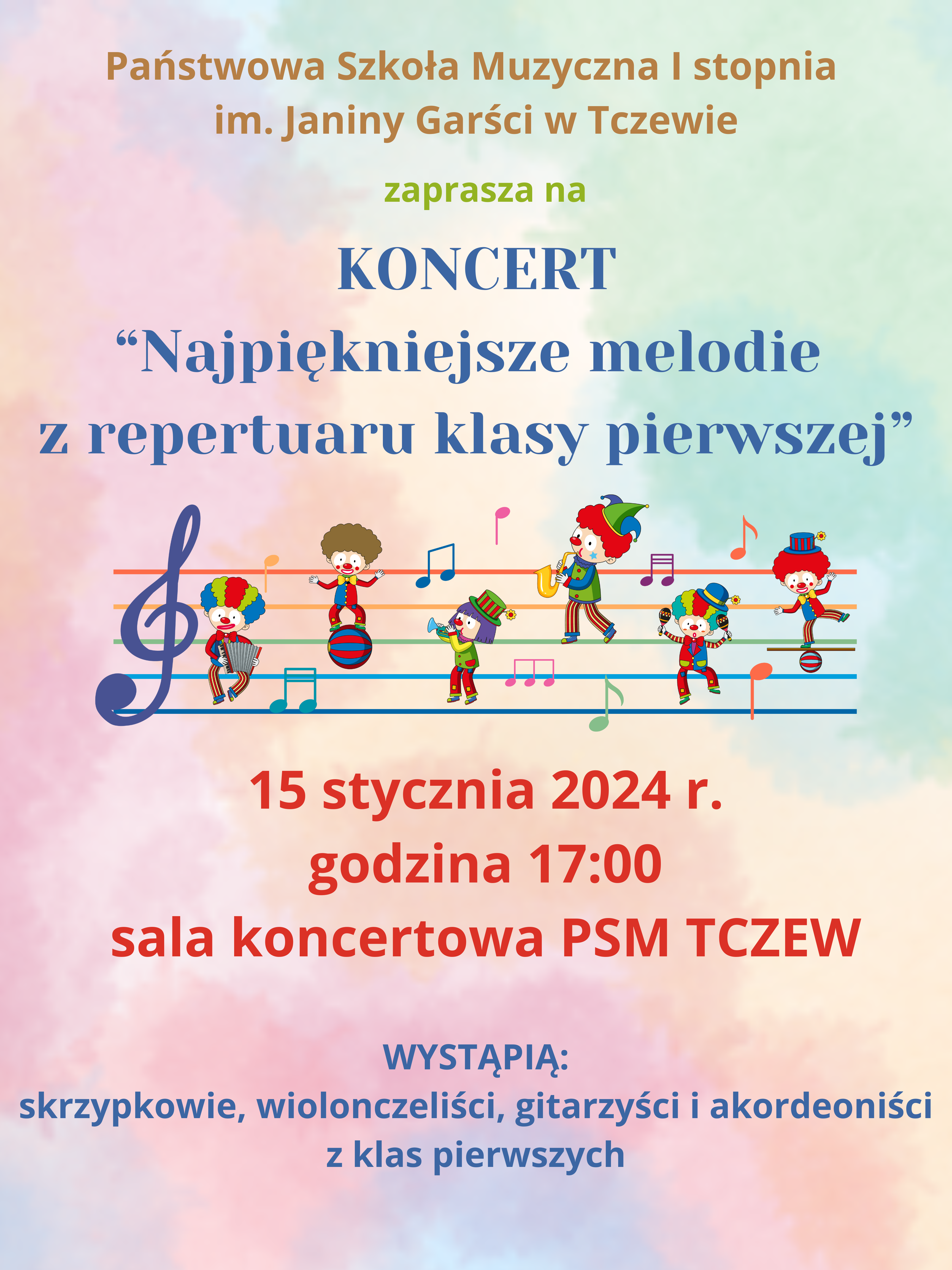 Zapraszamy na KONCERT "Najpiękniejsze melodie z repertuaru klasy pierwszej", który odbędzie się 15 stycznia 2024 r. o godzinie 17:00 w sali koncertowej PSM Tczew. Wykonawcami koncertu będą pierwszoklasiści grający na skrzypcach, wiolonczeli, gitarze i akordeonie. Wstęp wolny.