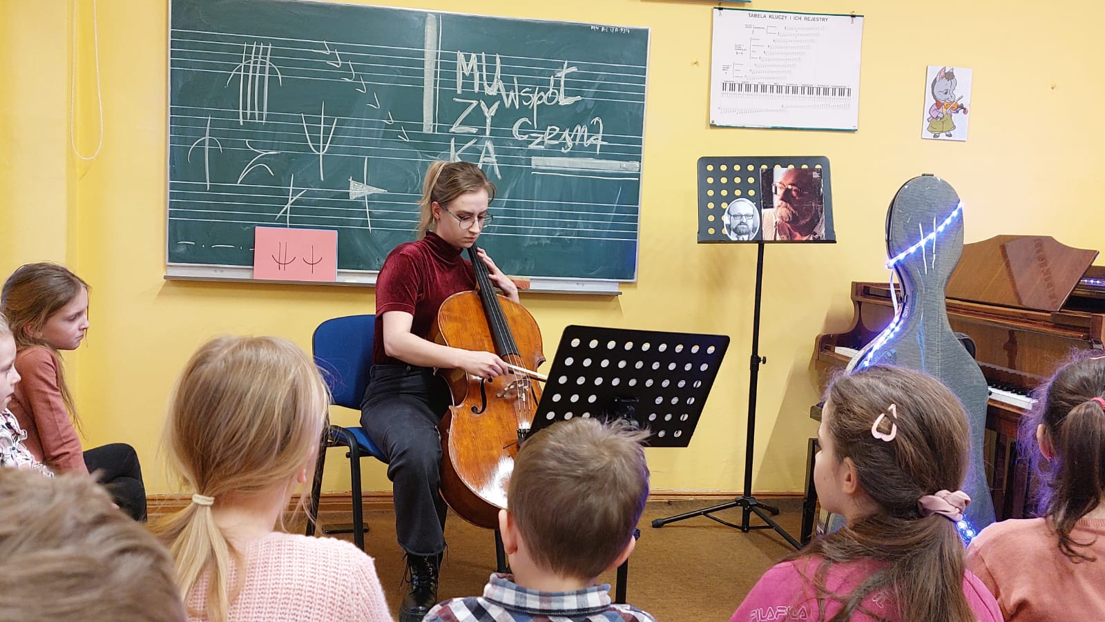 01.03.2023r. w filii w Pelplinie miał miejsce bardzo interesujący koncert wiolonczelowy. Wystąpiła pani Nikola Freda, nasza adsolwentka, obecnie studentka ostatniego roku Akademii Muzycznej w Gdańsku oraz pedagog PSM w Tczewie. Zagrała „Capriccio per Siegfried Palm” Krzysztofa Pendereckiego. Przed występem wprowadziła wraz z p. Krystyną Dettlaff-Czocher młodą widownię w pewne niuanse muzyki współczesnej, budując w ten sposób duże zainteresowanie młodzieży koncertem.