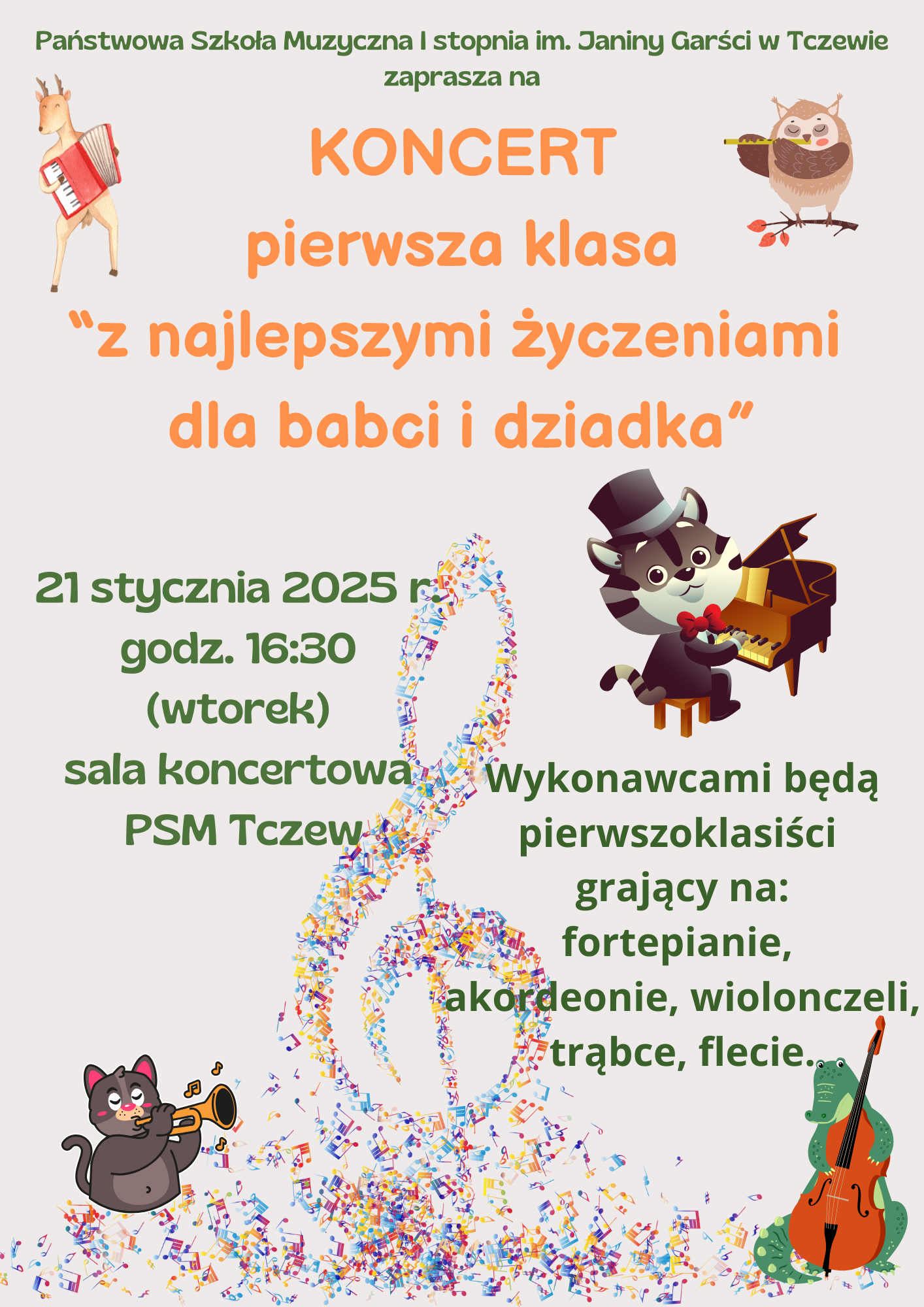 21 stycznia br. (wtorek) na godzinę 16:30 zapraszamy do sali koncertowej szkoły muzycznej na drugi koncert z cyklu "KONCERT PIERWSZA KLASA z najlepszymi życzeniami dla dziadka i babci". Wykonawcami będą uczniowie klas pierwszych z sekcji klawiszowej i dętej. Zapraszamy!