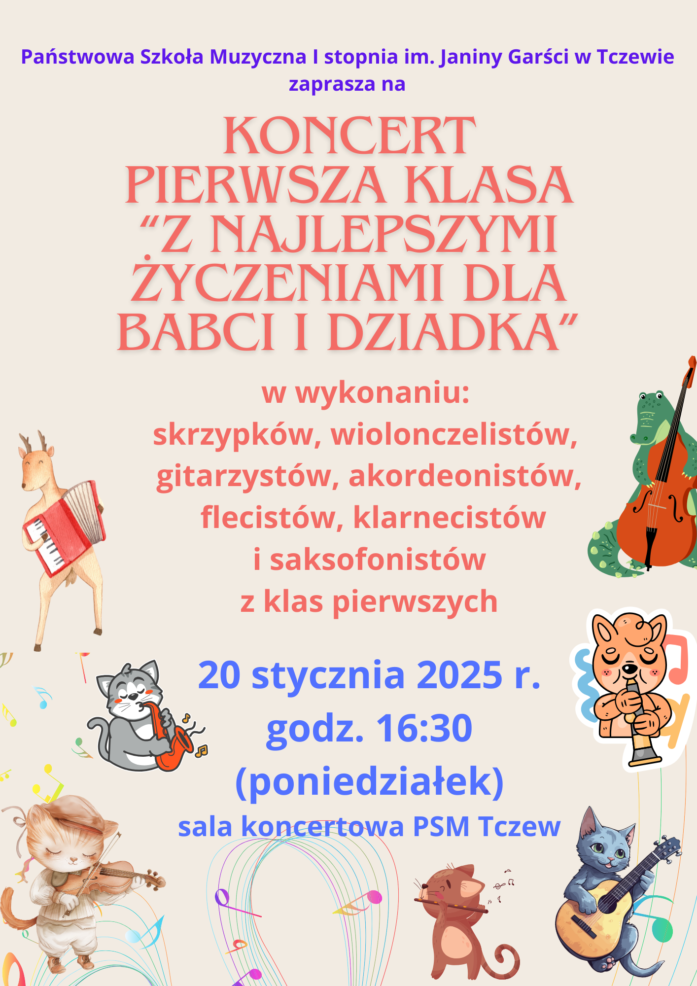 20 stycznia br. (poniedziałek) na godzinę 16:30 zapraszamy do sali koncertowej szkoły muzycznej na pierwszy koncert z cyklu "KONCERT PIERWSZA KLASA z najlepszymi życzeniami dla dziadka i babci". Wykonawcami będą uczniowie klas pierwszych grający na skrzypcach, wiolonczeli, gitarze, akordeonie, flecie, klarnecie, saksofonie. Zapraszamy!