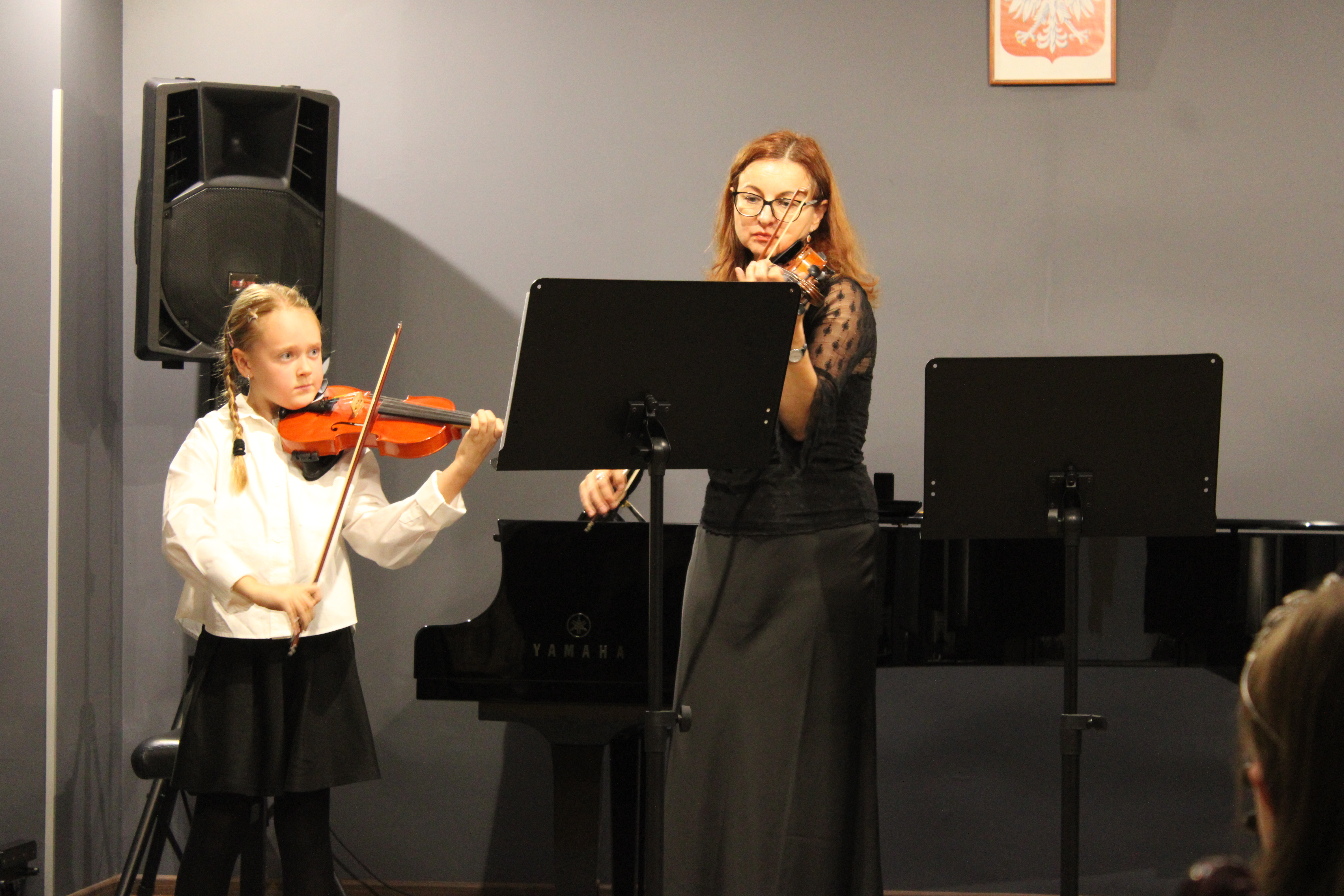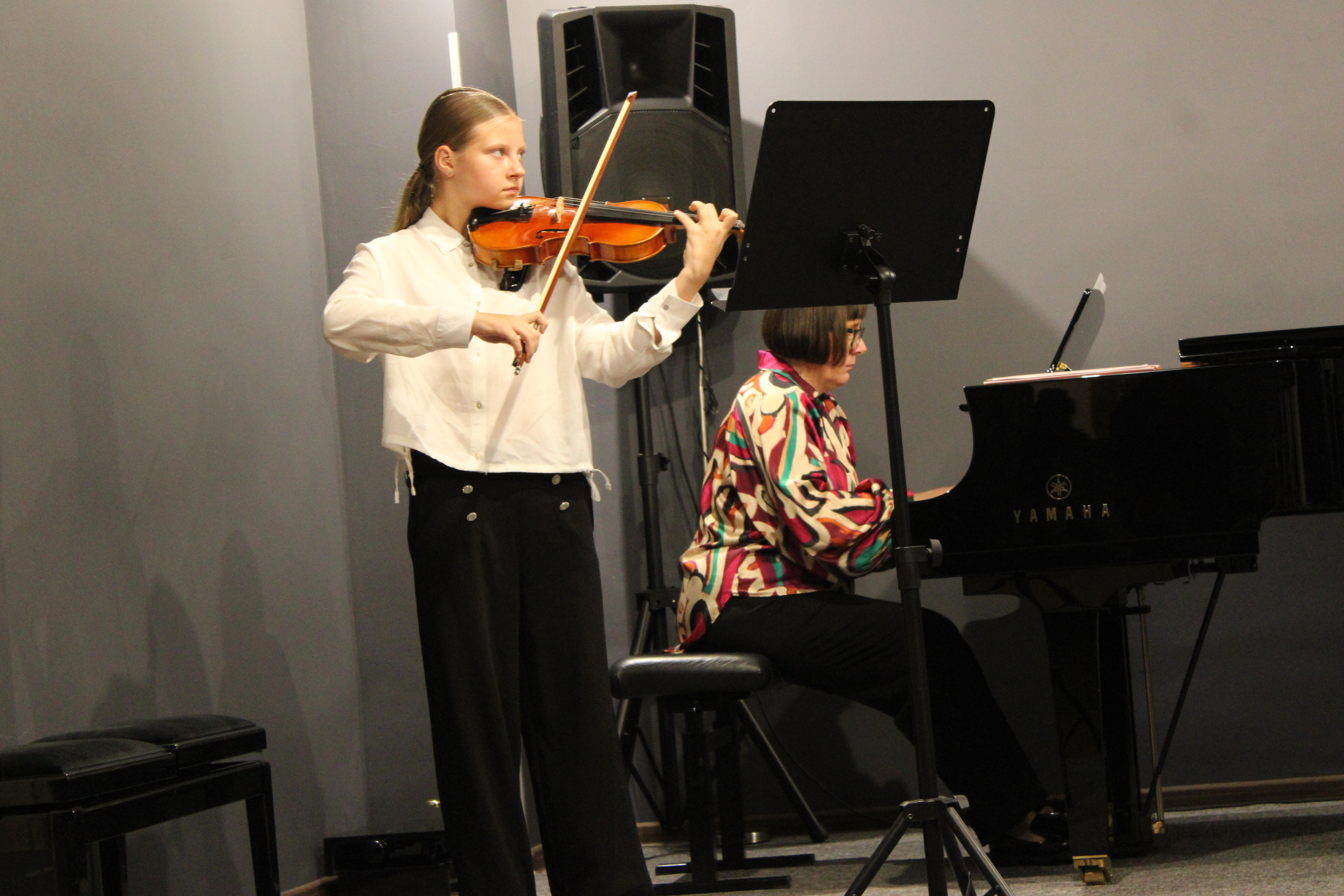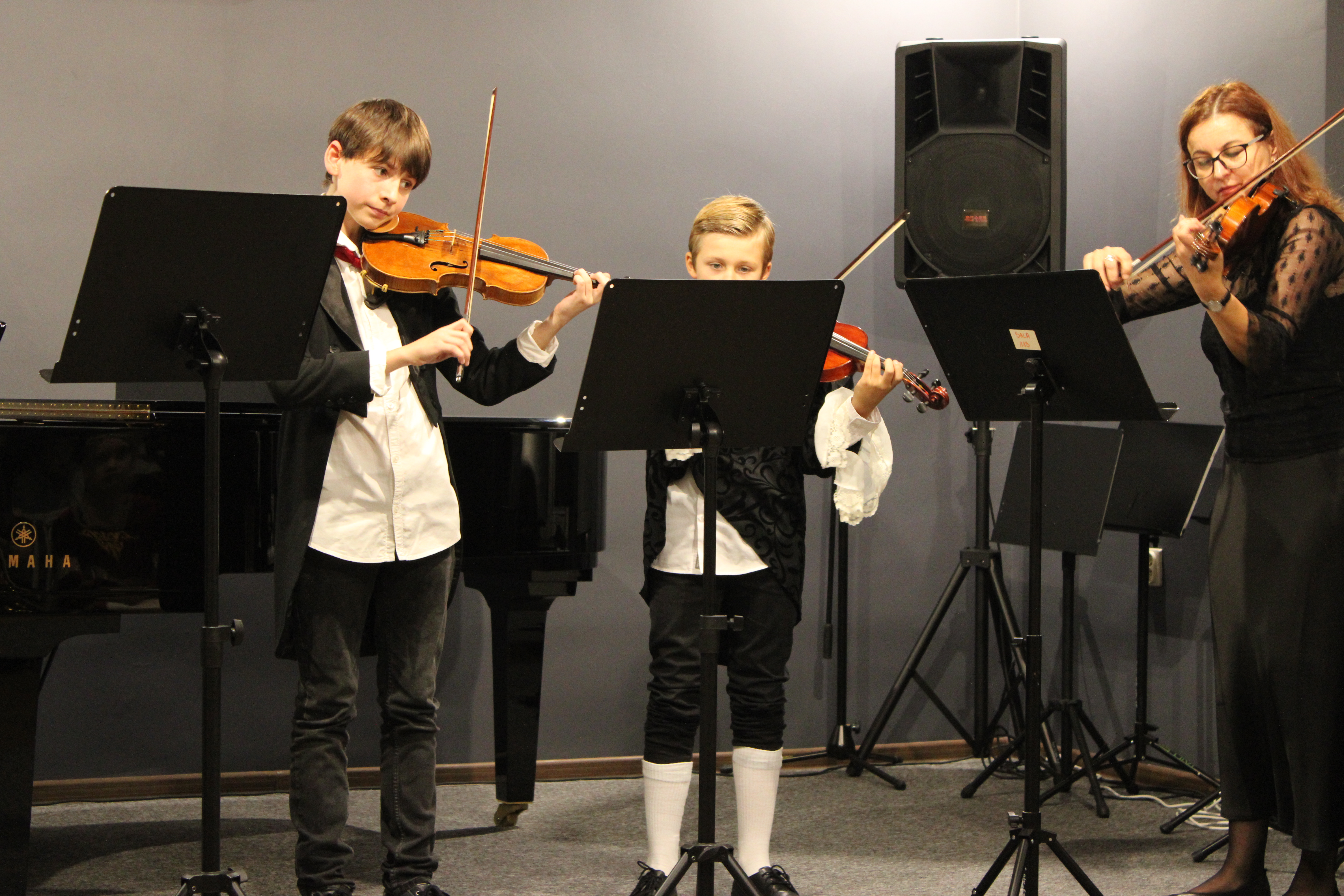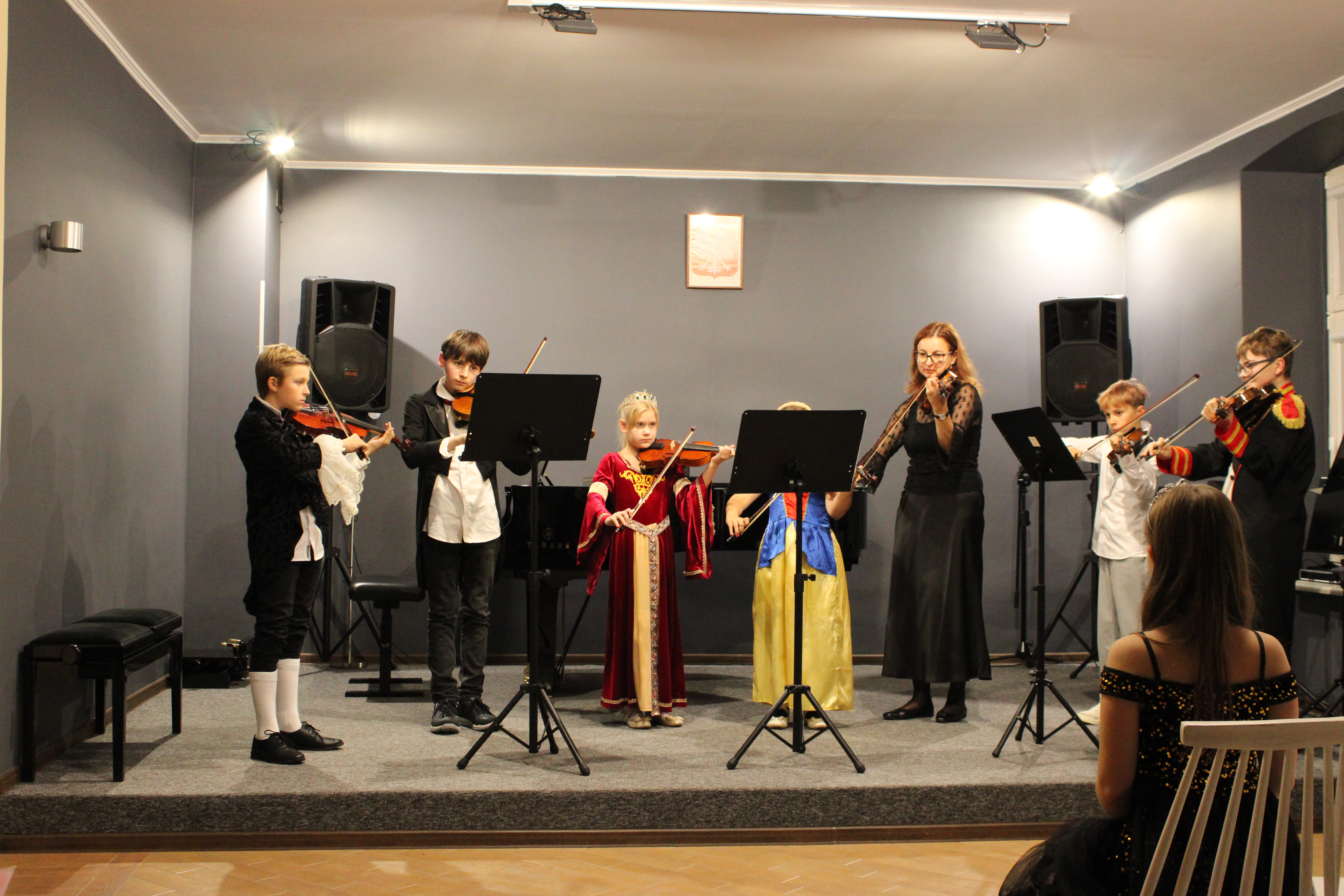 Jesień i muzyka barokowa to idealne połączenie. Właśnie tak było u nas 21 października 2025r. Skrzypkowie z Tczewa Szkoły Muzycznej i pelplińskiej Filii zagrali wspólny koncert "W barokowym stylu". Styl był słyszalny w interpretacjach uczniów i znakomitych pianistek (p. Moniki Madej-Strukiel, p. Agnieszki Stankowskiej i p. Aliny Dombrowskiej), a także w strojach wykonawców. Skrzypokowie wystąpili z repertuarem solowym, a także w zespołach (trio, kwartet, septet). Na koniec koncertu prowadząca - Marta Kołodziejska-Kacprzak - pokazała jak wyglądają i brzmią skrzypce barokowe i barokowy smyczek skrzypcowy.
