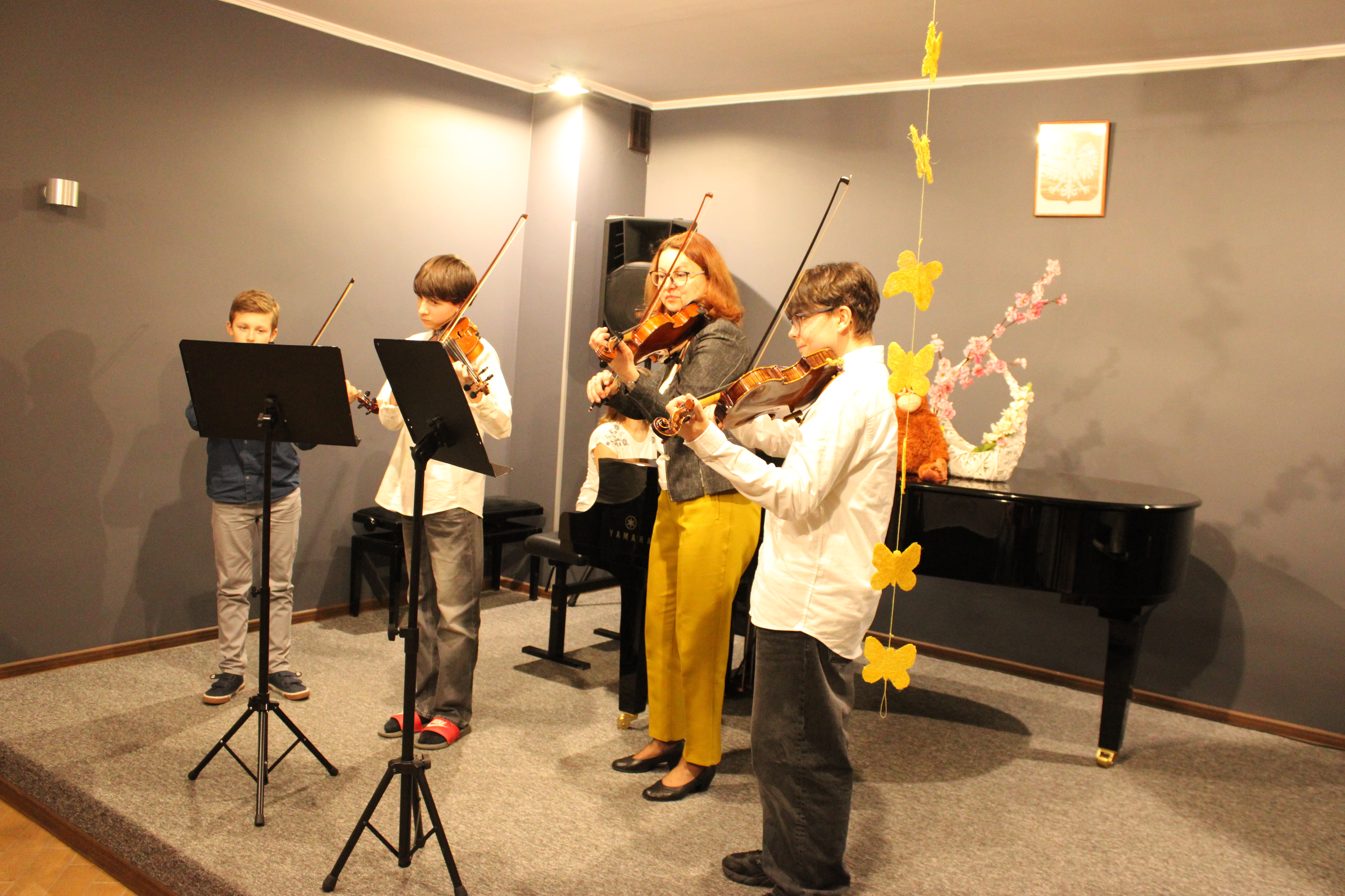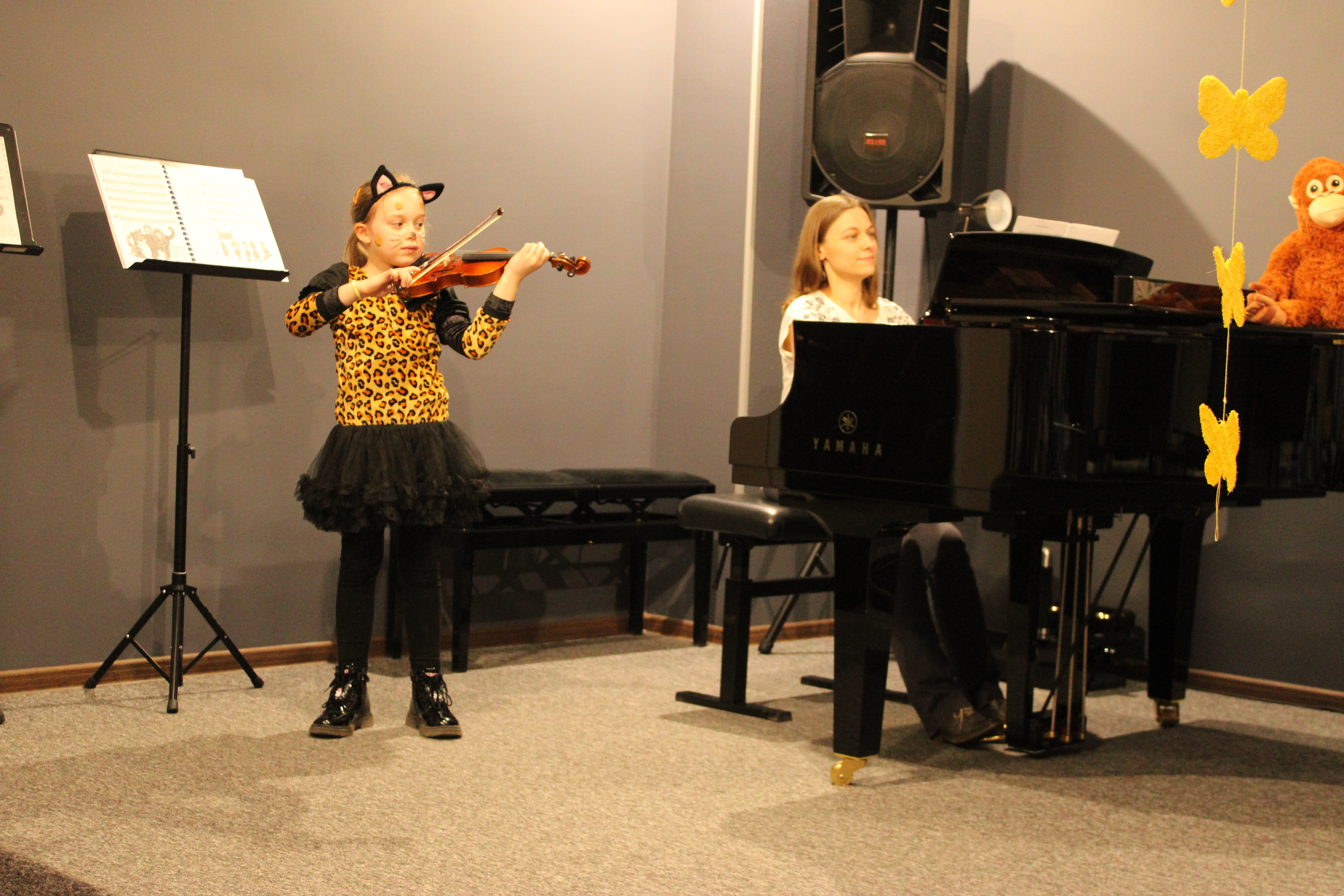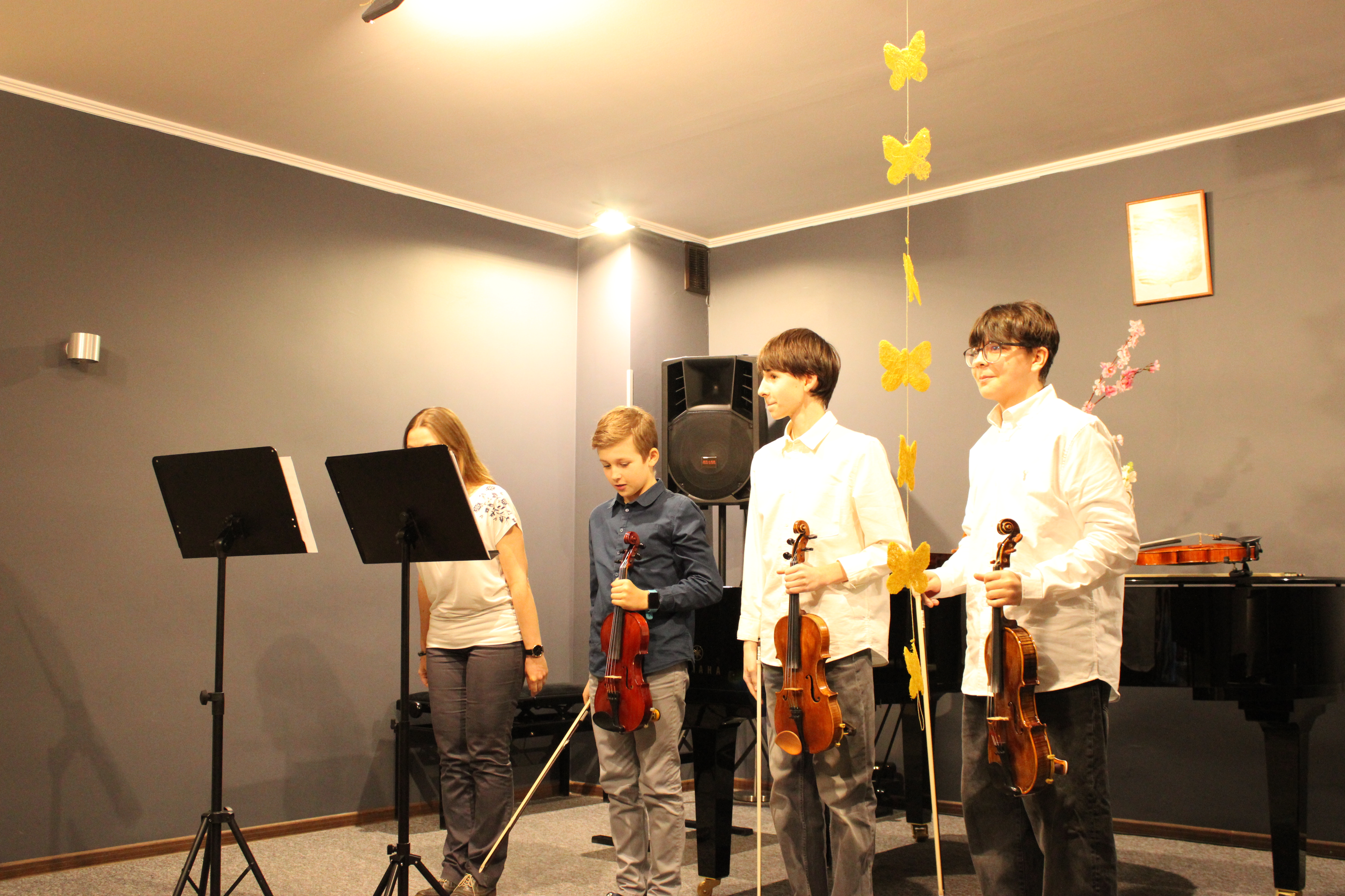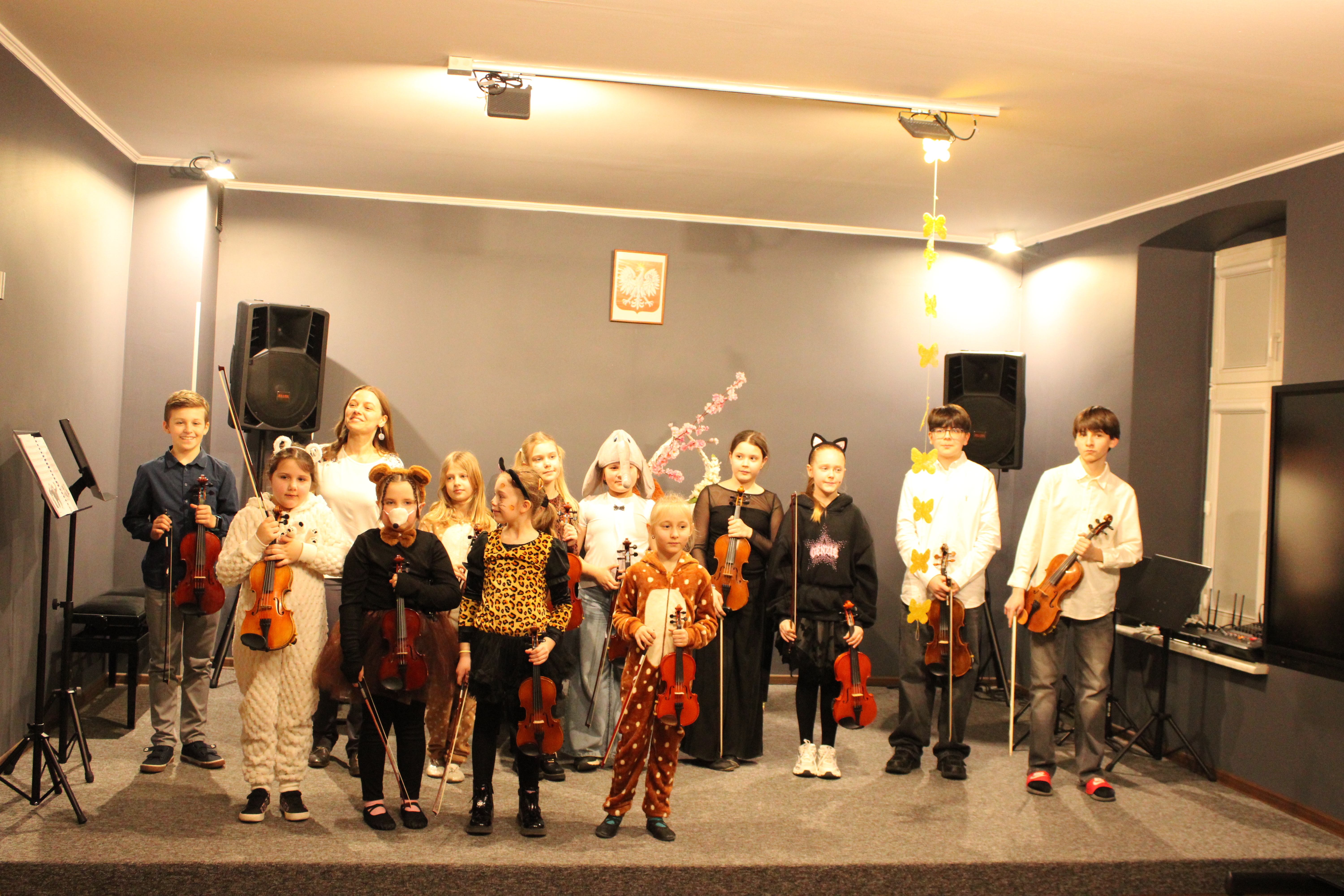 We wtorek - 10 marca 2026 - skrzypkowie z klasy p. Aldony Śmietańskiej dźwiękami i strojami pokazali licznie zgromadzonej publiczności "muzyczne ZOO". Usłyszeliśmy jak kompozytor/skrzypek - Antoni Cofalik - naśladował dźwiękiem skrzypiec i fortepianu różnych mieszkańców ZOO, a byli to: słoń, kangur, mały pingwinek, miś, renifer, kucyk, krokodyl, bóbr, lew, antylopa, foka. Wszystkim uczniom przy fortepianie towarzyszyła p. Agnieszka Stankowska. Brawa dla skrzypków i p. Aldony oraz p. Agnieszki - wiosna w muzycznym Zoo odnaleziona! Gratulujemy pięknego koncertu. Dziękujemy publiczności za liczne przybycie. Wśród naszych słuchaczy był obecny Pan Prezydent Tczewa - Łukasz Brządkowski - bardzo dziękujemy za obecność. Muzyka na wiosnę - najlepszy wybór!