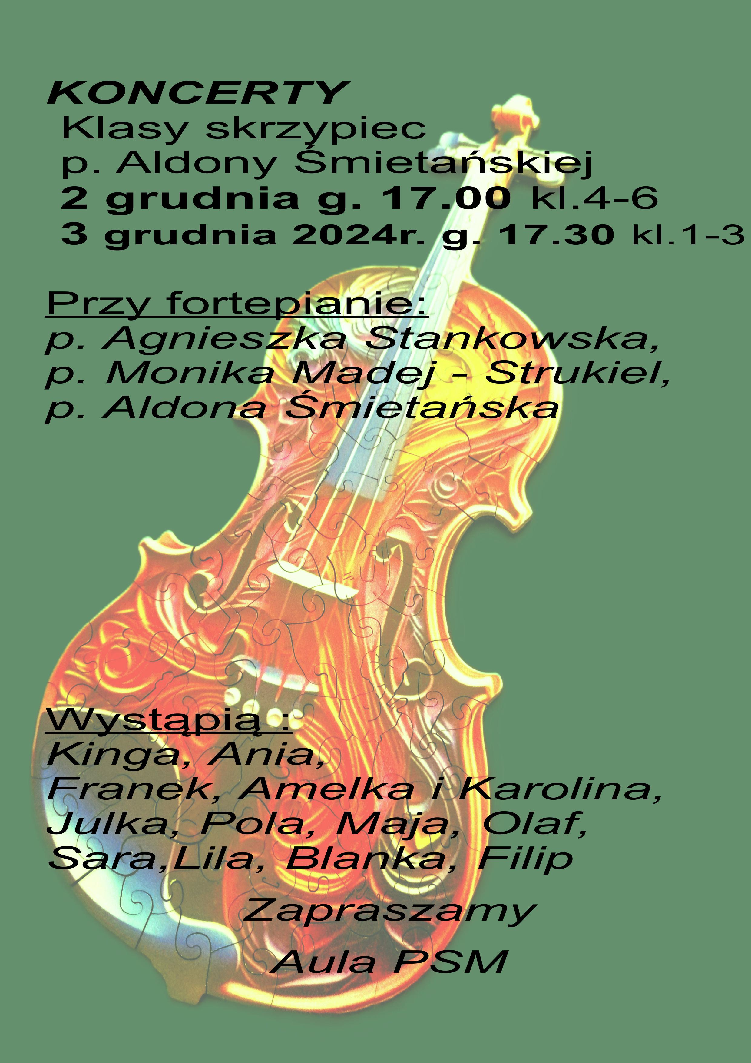 03 grudnia br. zapraszamy na godzinę 17:30 na Koncert skrzypków z klasy 1- 3, uczniów p. Aldony Śmietańskiej. Koncert odbędzie się w sali koncertowej szkoły.