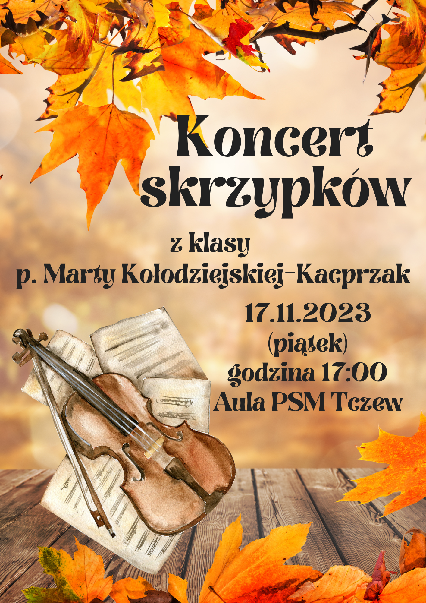 Serdecznie zapraszamy na Koncert skrzypków z klasy p. Marty Kołodziejskiej-Kacprzak, który odbędzie się 17 listopada 2023 r. o godzinie 17:00 w sali koncertowej PSM w Tczewie.