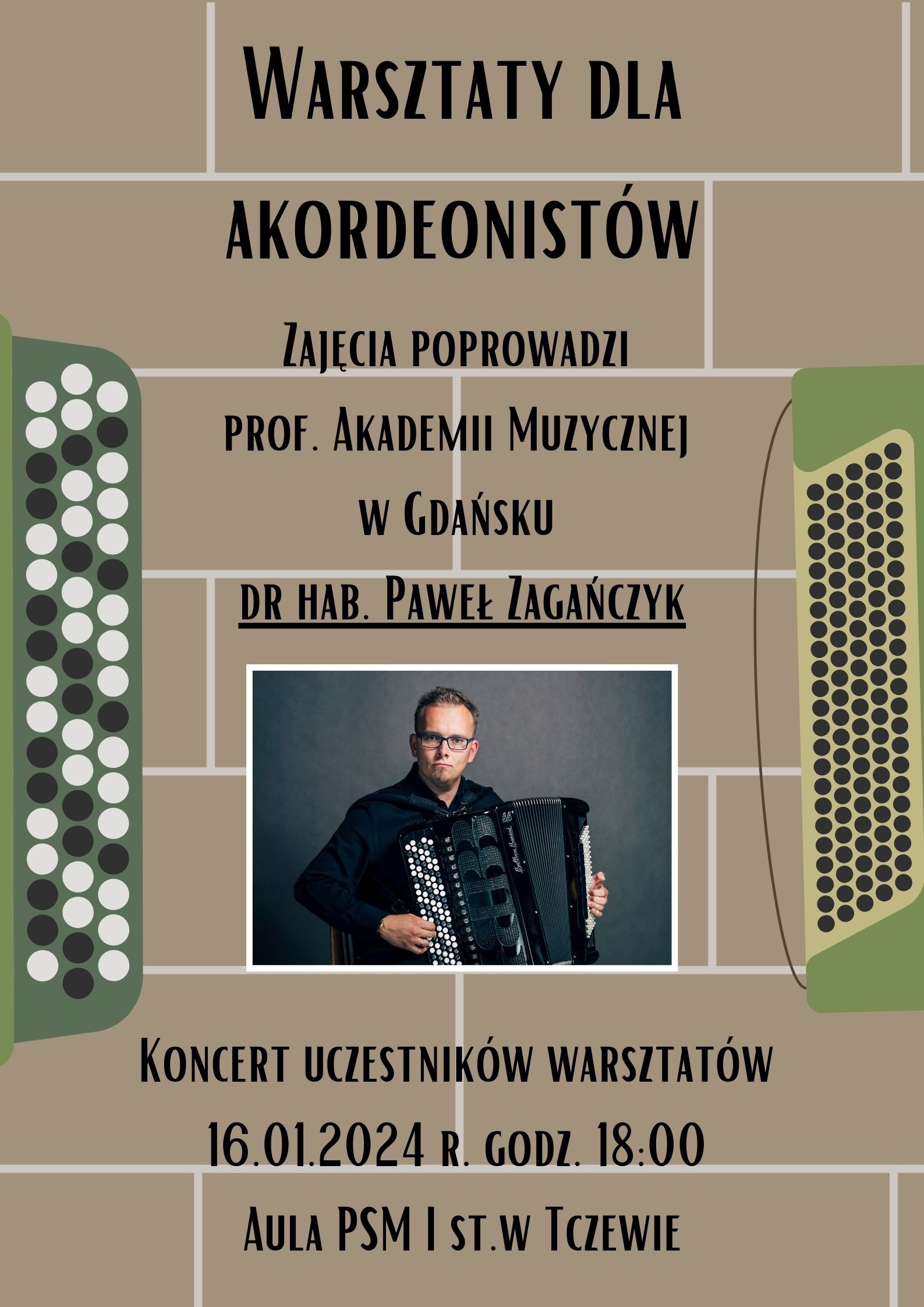 16 stycznia 2024 r. w anszej szkole odbędą się "Warsztaty akordeonowe". Lekcje mistrzowskie z dr hab. Pawłem Zagańczykiem rozpoczną się o godzinie 12:30, a cały dzień instensywnej pracy zwieńczy Koncert uczestników warsztatów, który odbędzie się o godzinie 18:00. To będzie prawdziwe święto akordeonu w PSM Tczew. Zapraszamy!
