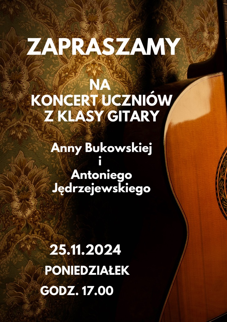 Zapraszamy na Koncert uczniów klasy gitary Anny Bukowskiej i Antoniego Jędrzejewskiego, który odbędzie się 25 listopada o godzinie 17:00 w sali koncertowej szkoły muzycznej w Tczewie.