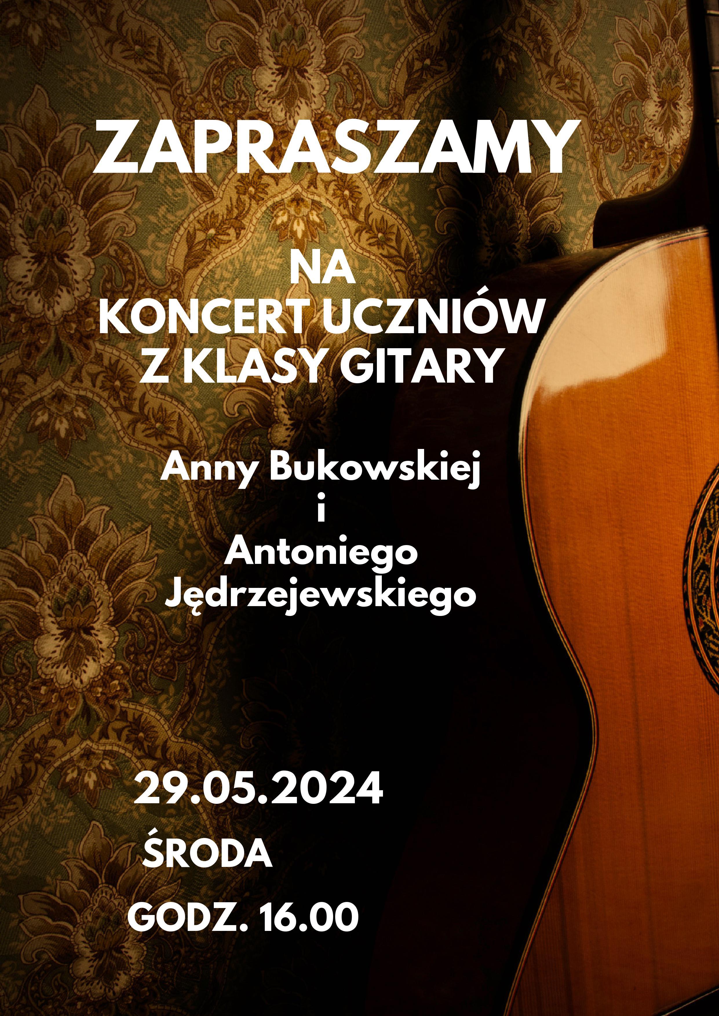 Uczniowie klasy gitary p. Anny Bukowskiej i p. Antoniego Jędrzejewskiego zapraszają na swój koncert, który odbędzie się 29 maja 2024 r. o godzinie 16:00 w sali koncertowej szkoły muzycznej. ZAPRASZAMY!
