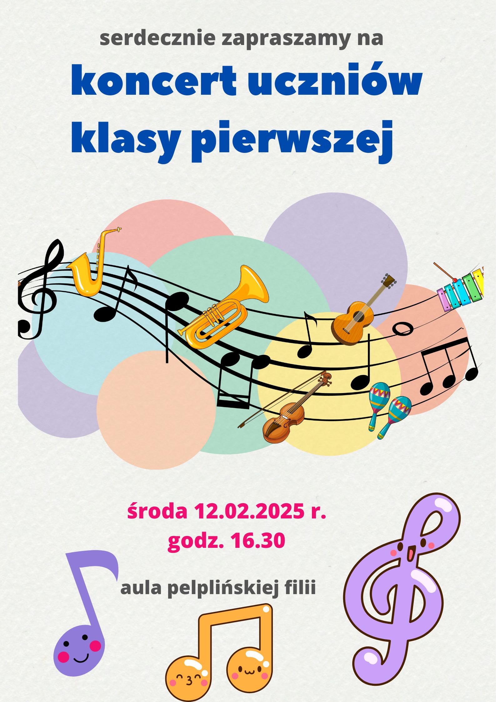 W środę 12 lutego 2025 r. o godzinie 16:30 w auli naszej szkoły odbędzie się koncert, którego wykonawcami będą uczniowie klasy pierwszej.