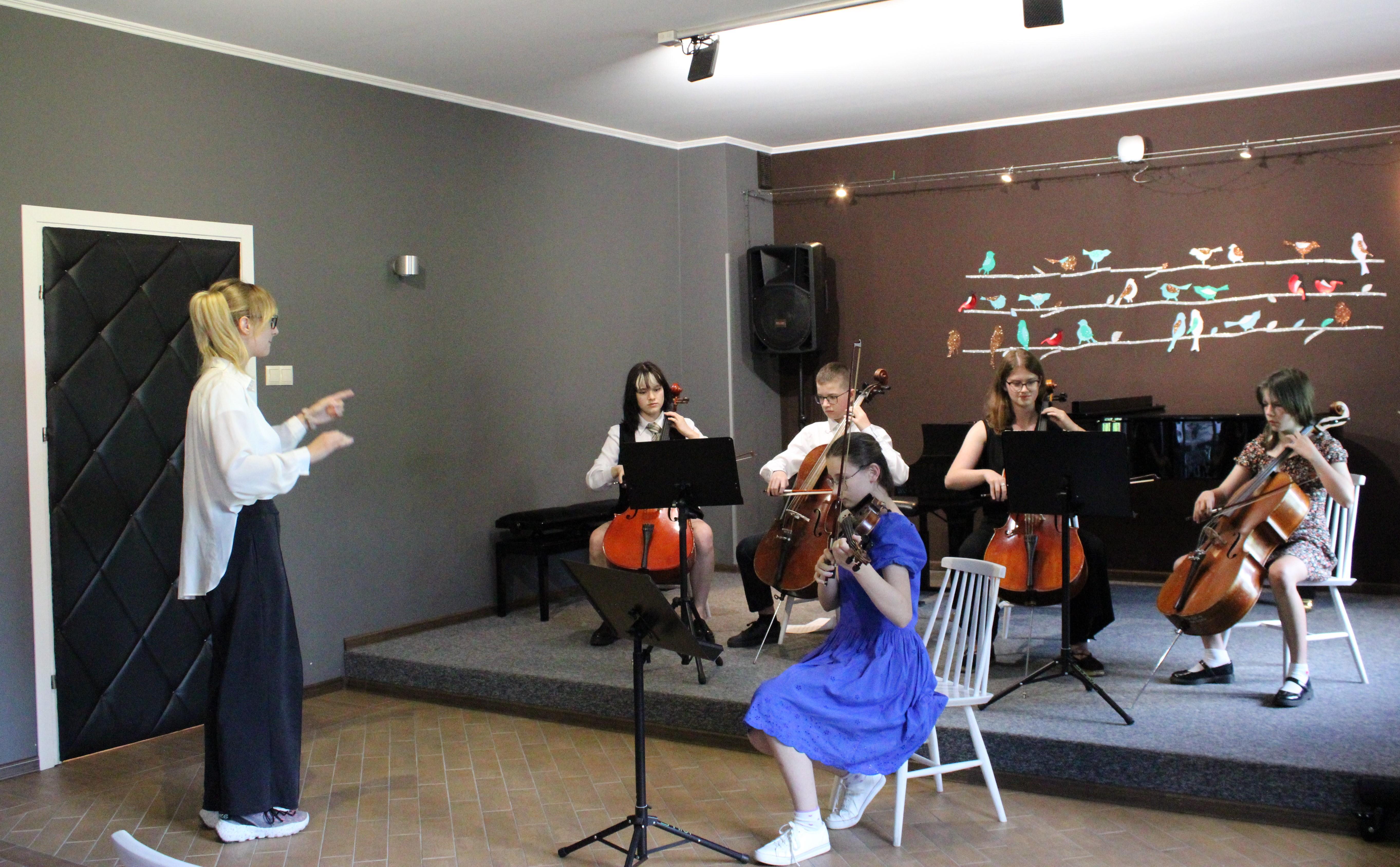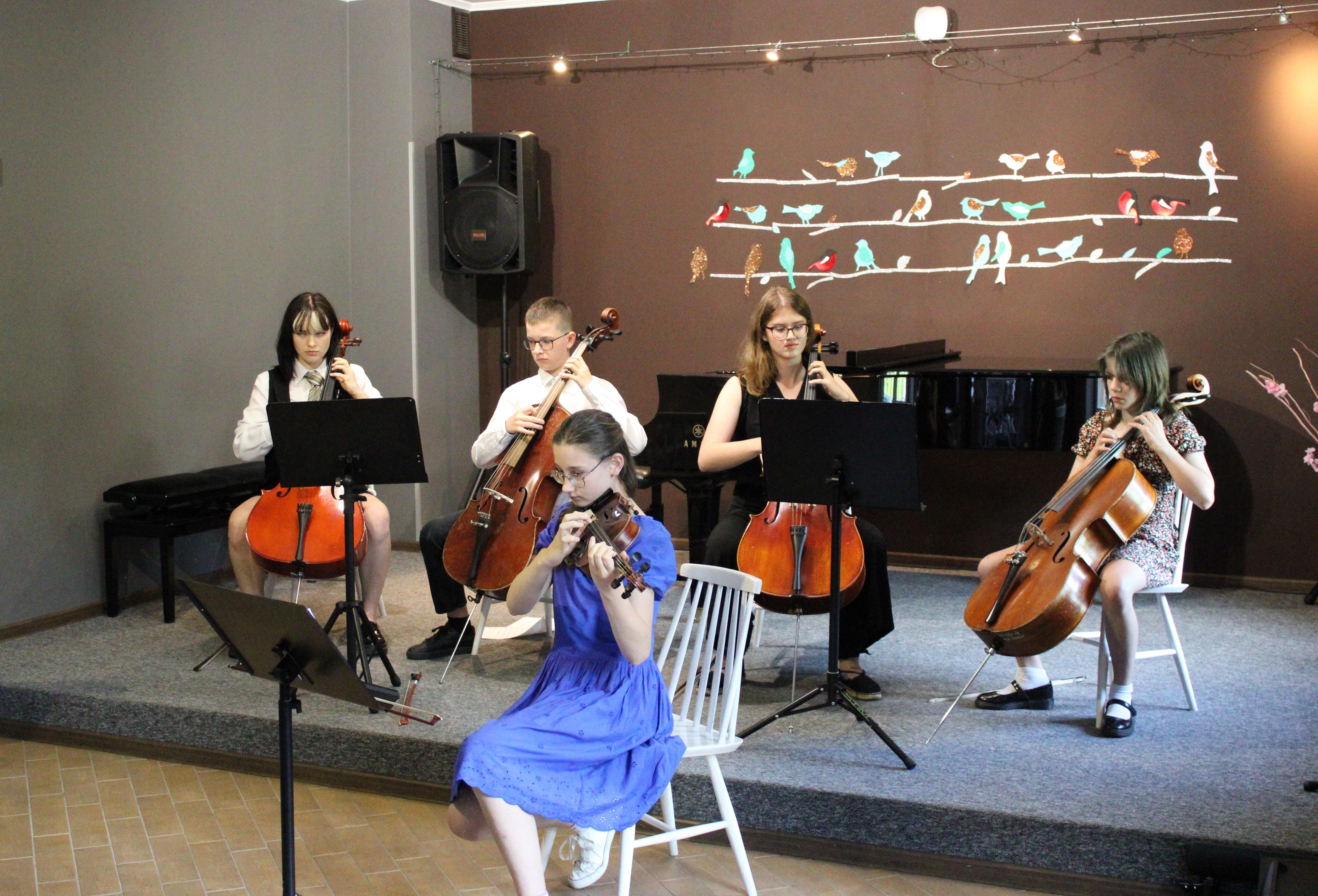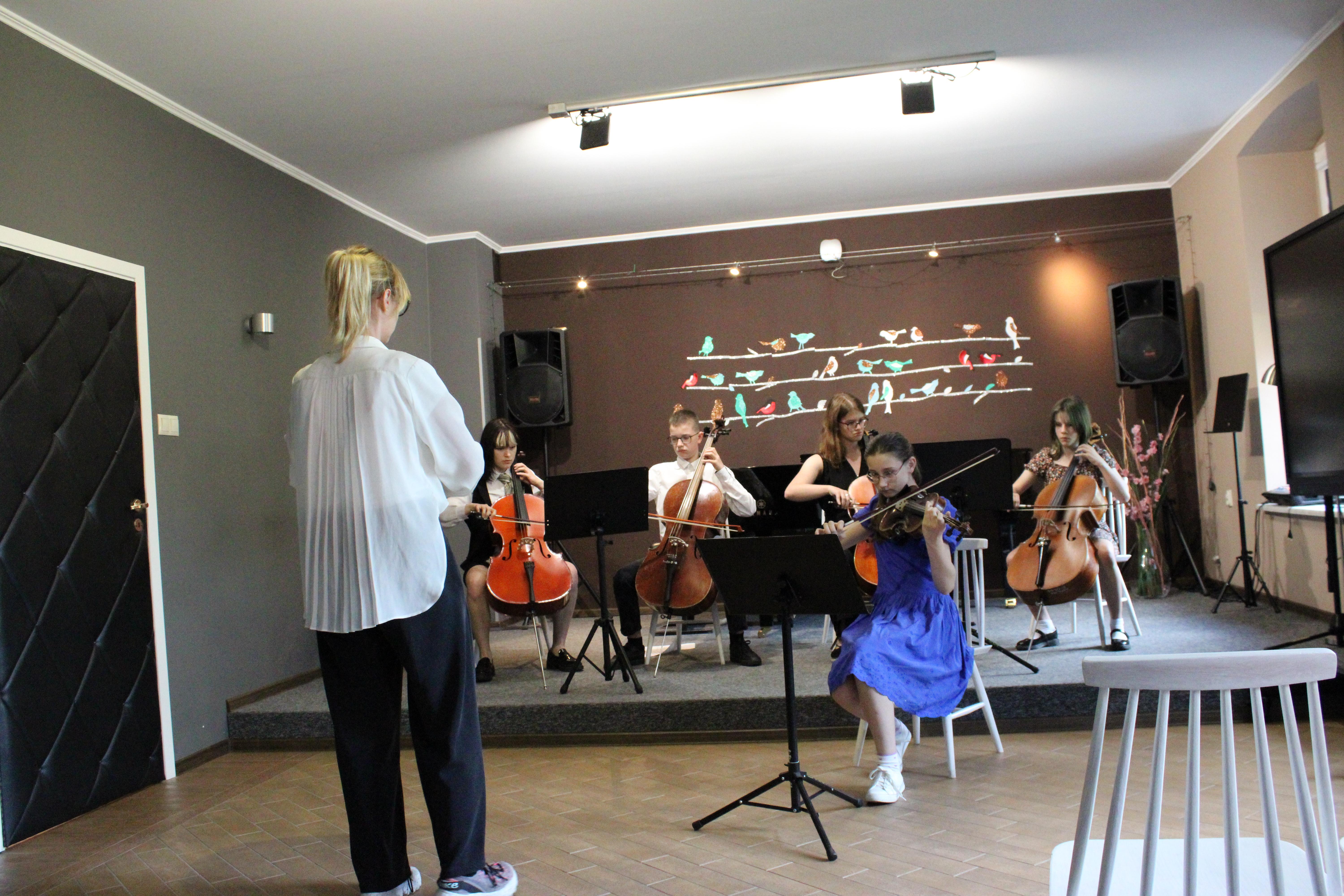 Gdy większość uczniów już snuje plany wakacyjne nasze trzy zespoły zagrały 18.06.2024 piękny koncert. Instrumentaliści pokazali owoce swojej pracy w II semestrze. Zaprezentowały się dwa duety gitarowe oraz zespół smyczkowy. Nasi uczniowie uwielbiają grać razem i na scenie czuli się jak ryby w wodzie. Wielkie gratulacje dla wykonawców, nauczycieli i prowadzącej koncerty - p. Nikoli Fredy.