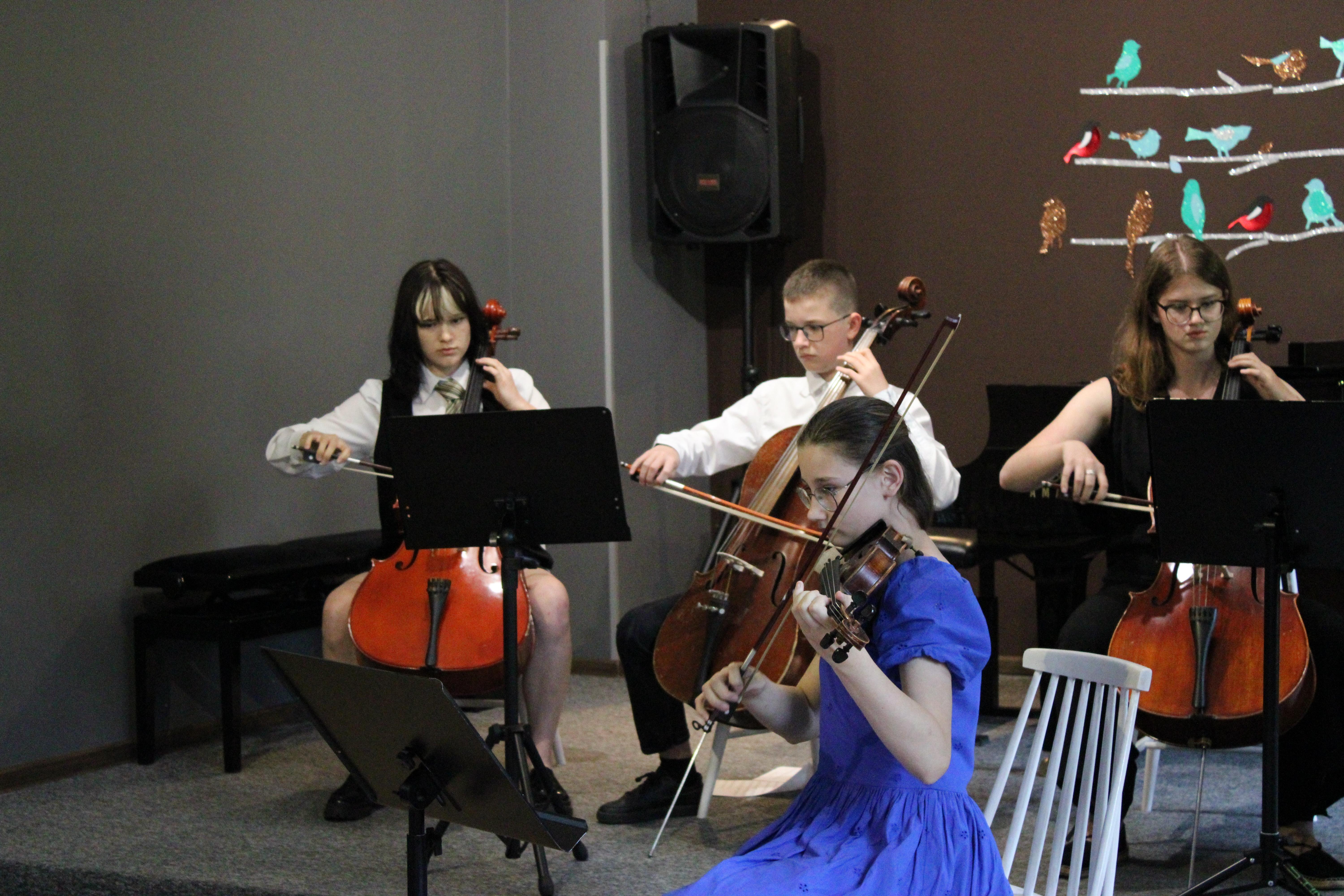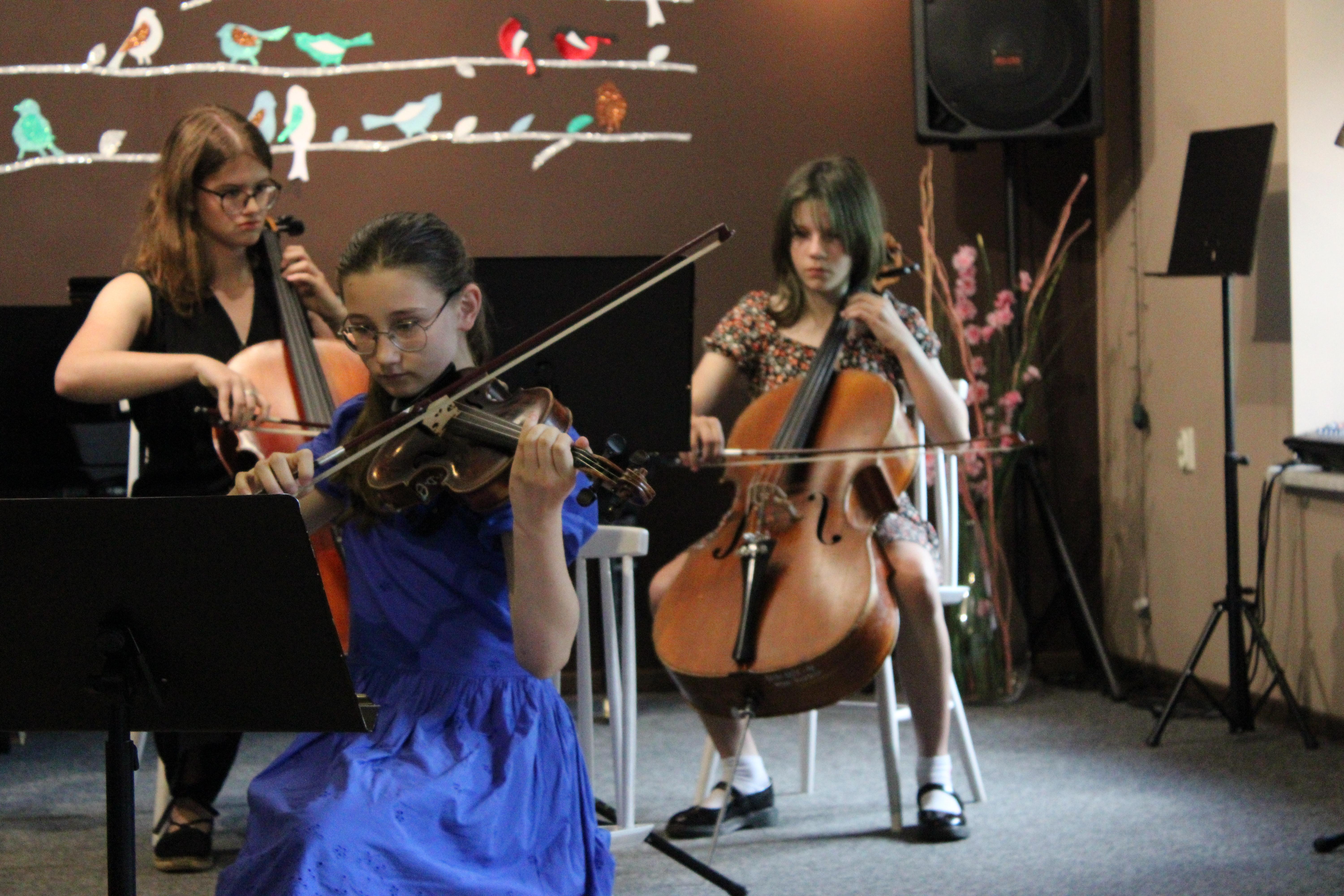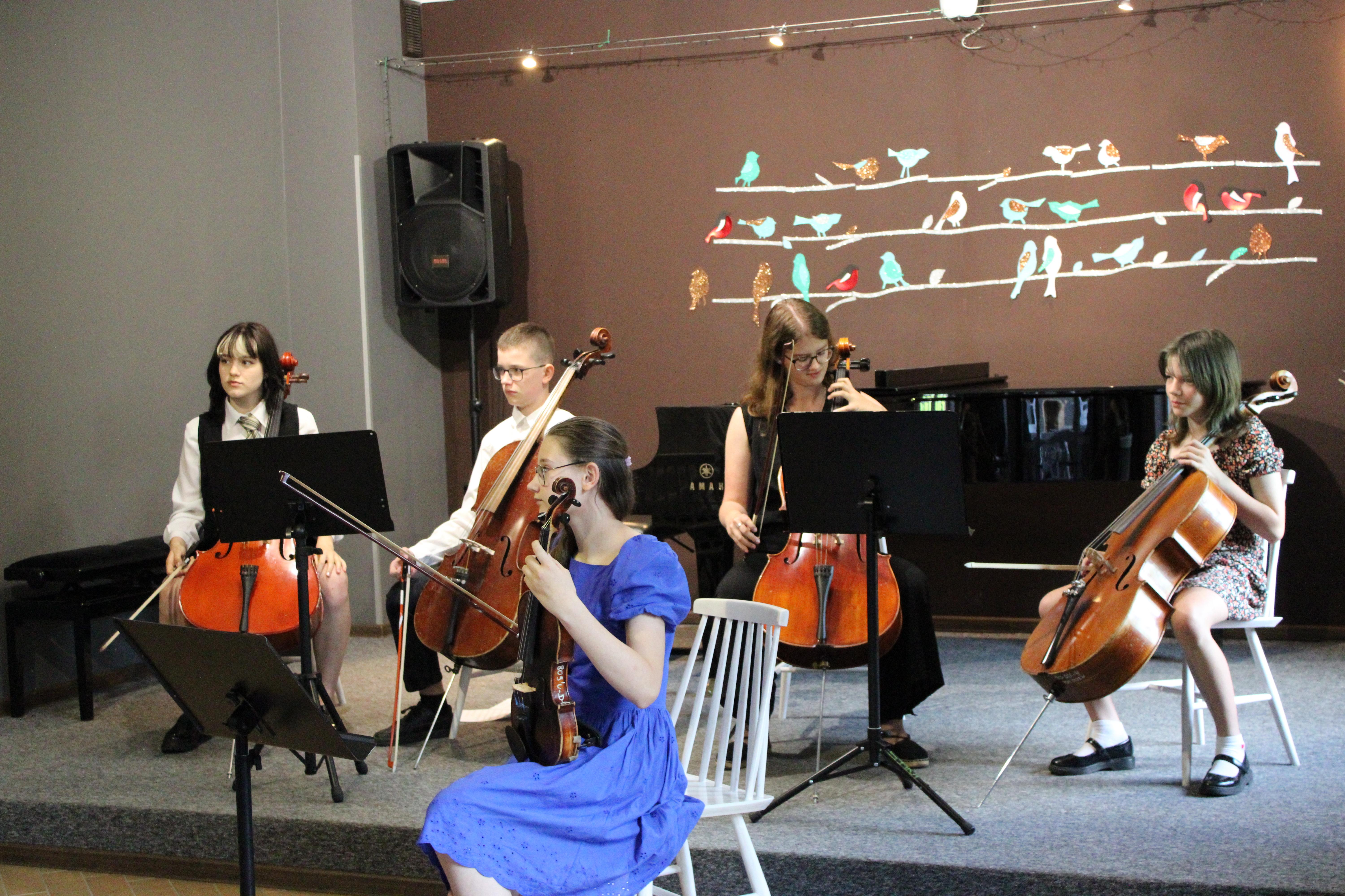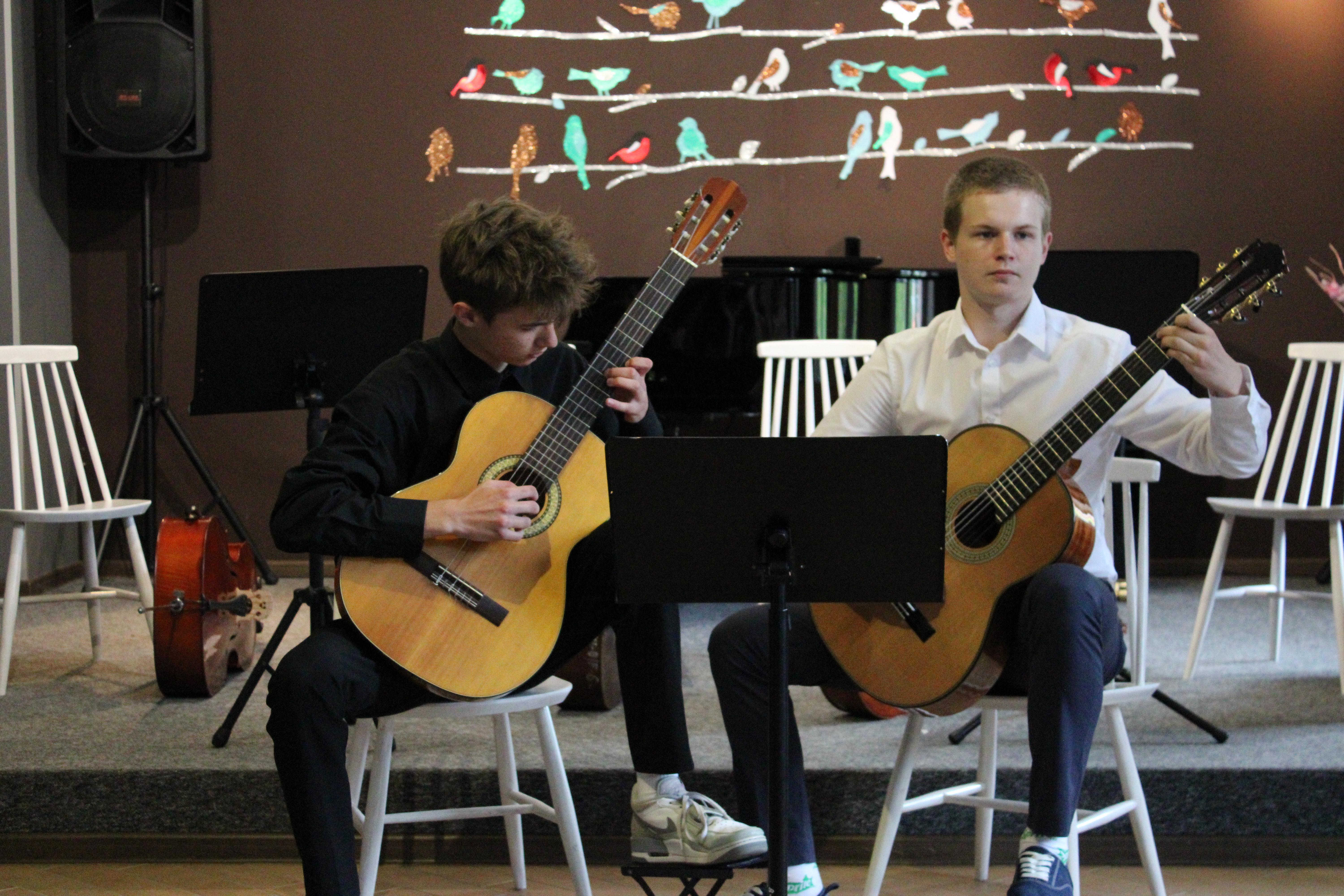 Gdy większość uczniów już snuje plany wakacyjne nasze trzy zespoły zagrały 18.06.2024 piękny koncert. Instrumentaliści pokazali owoce swojej pracy w II semestrze. Zaprezentowały się dwa duety gitarowe oraz zespół smyczkowy. Nasi uczniowie uwielbiają grać razem i na scenie czuli się jak ryby w wodzie. Wielkie gratulacje dla wykonawców, nauczycieli i prowadzącej koncerty - p. Nikoli Fredy.