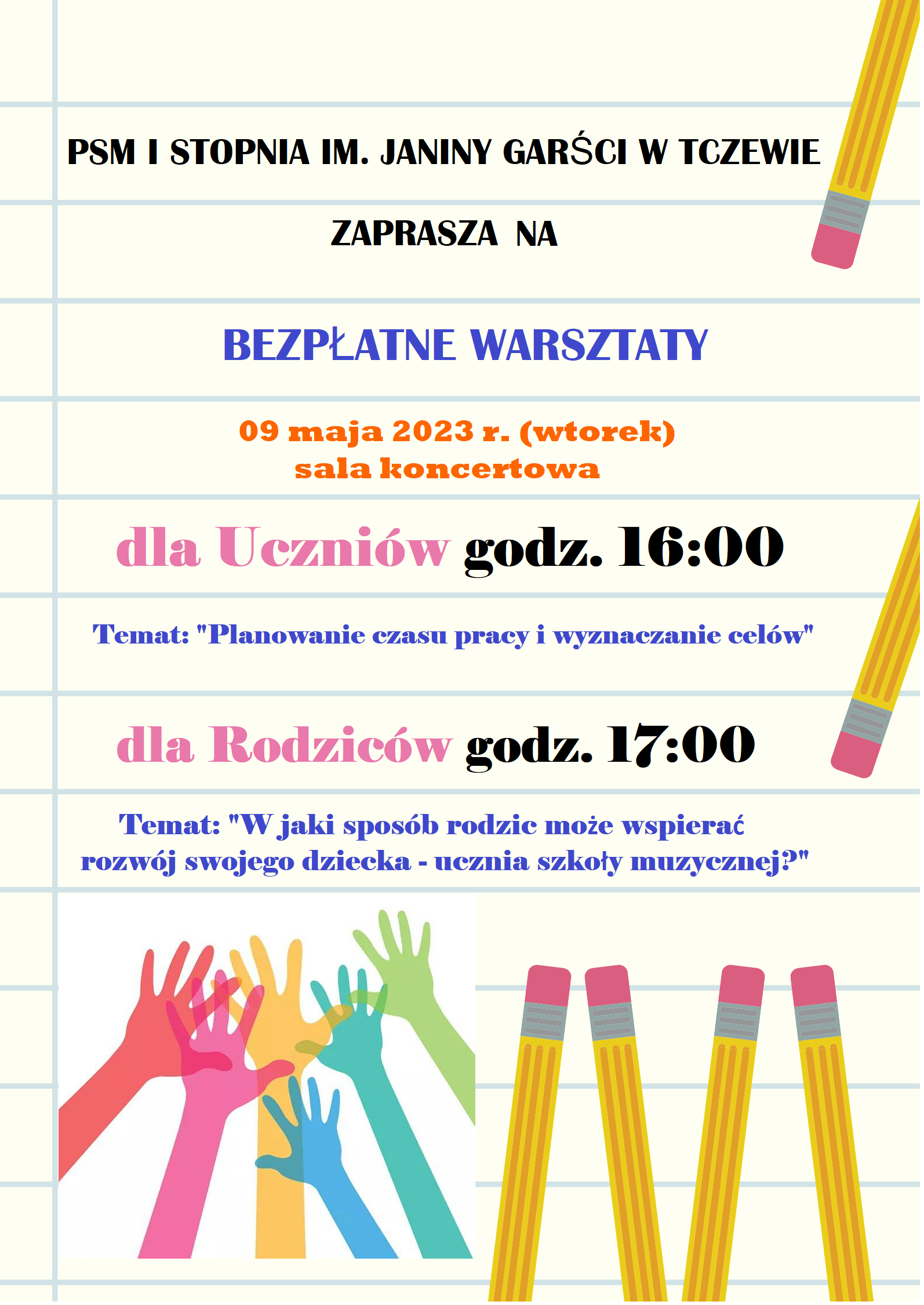 - godz. 17:00 - warsztaty dla rodziców "W jaki sposób rodzic może pomóc wspierać rozwój swojego dziecka- ucznia szkoły muzycznej?"