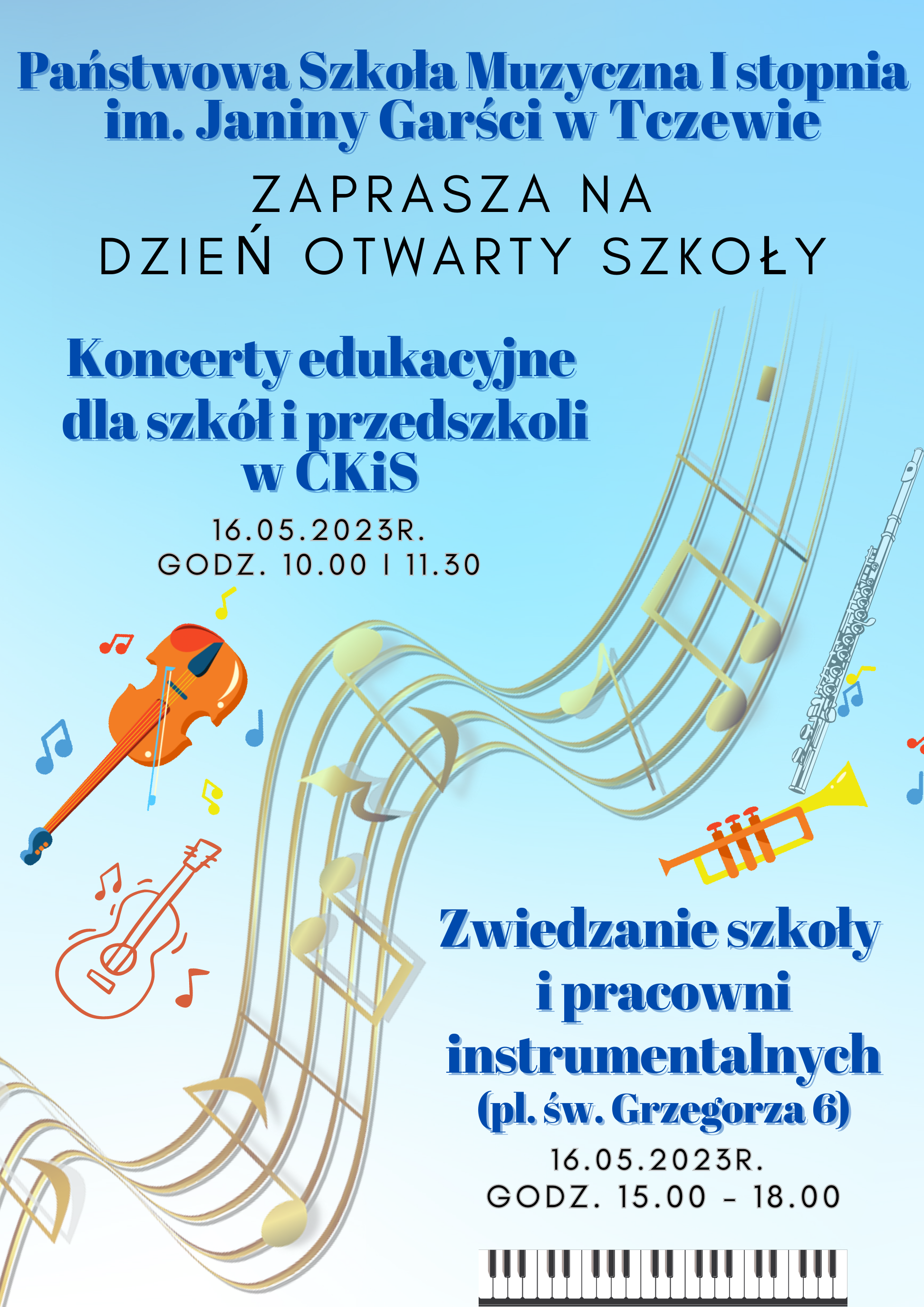 - 15:00 - 18:00 zwiedzanie szkoły i pracowni instrumentalnych - zapraszamy Kandydatów do szkoły muzycznej wraz z rodzicami.