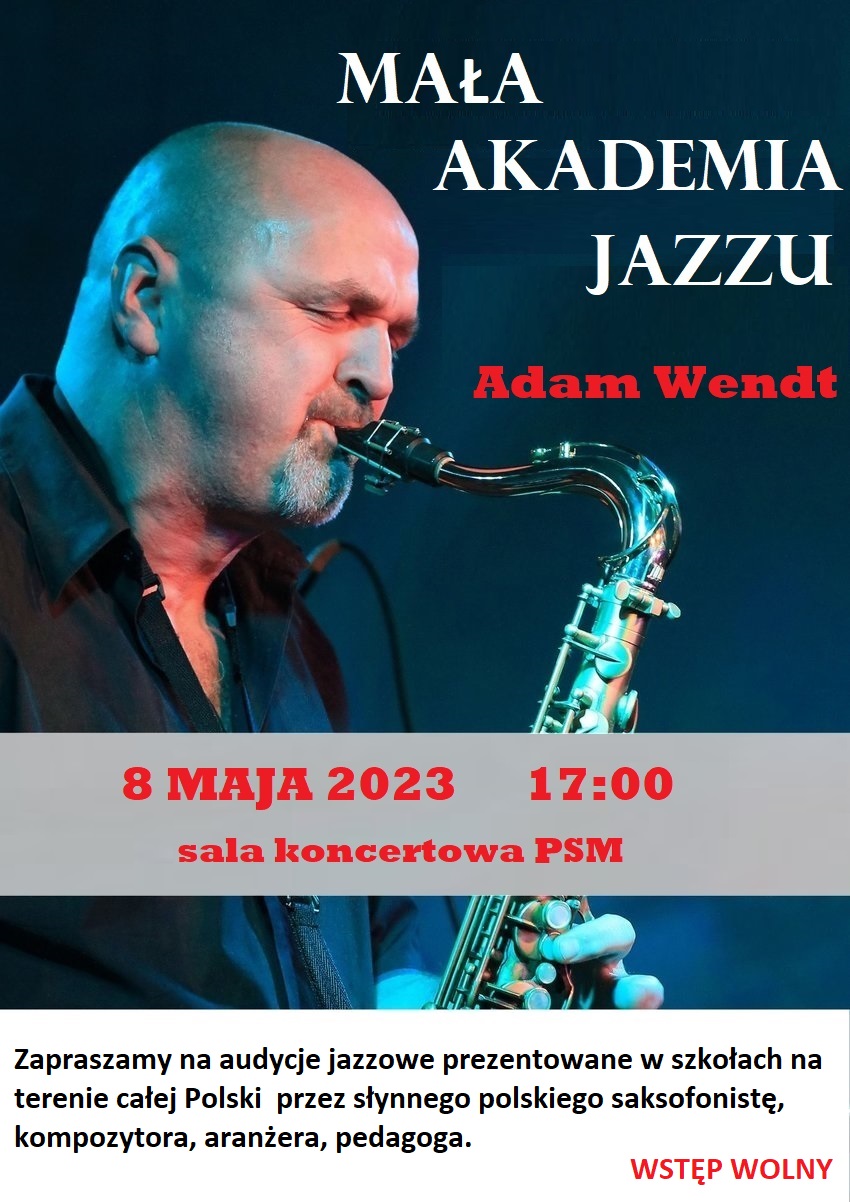 08 maja 2023 r., godzina 17:00 - Mała Akademia Jazzu - prowadzona przez p. Adama Wendta - saksofonistę, kompozytora, aranżera, pedagoga naszej szkoły.