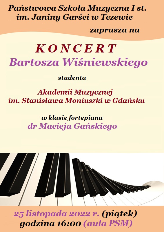25.11.2022 (piątek) godz. 16:00 - Koncert gościnny Bartosza Wiśniewskiego - studenta Akademii Muzycznej w Gdańsku w klasie fortepianu dr Macieja Gańskiego🎹