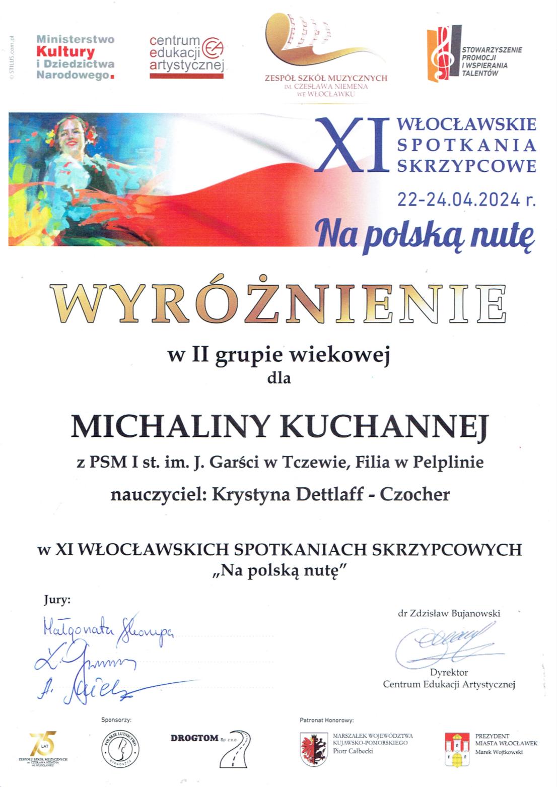 22-24 kwietnia odbyły się XI Włocławskie Spotkania Skrzypcowe "Na polską nutkę". Tu także zanotowaliśmy sukces: Michalina Kuchanna z klasy skrzypiec Pani Krystyny Dettlaff-Czocher zdobyła wyróżnienie w II grupie wiekowej.