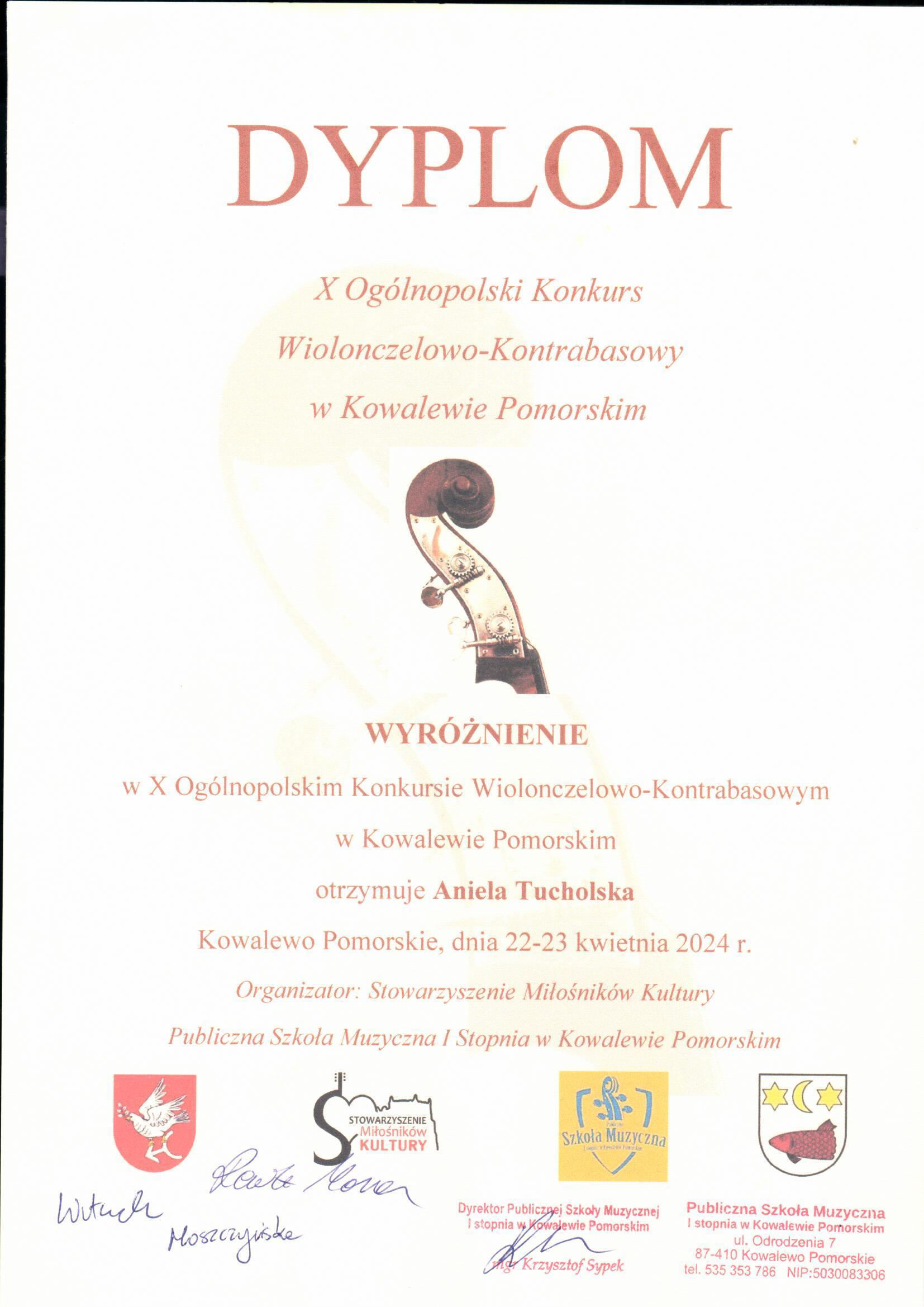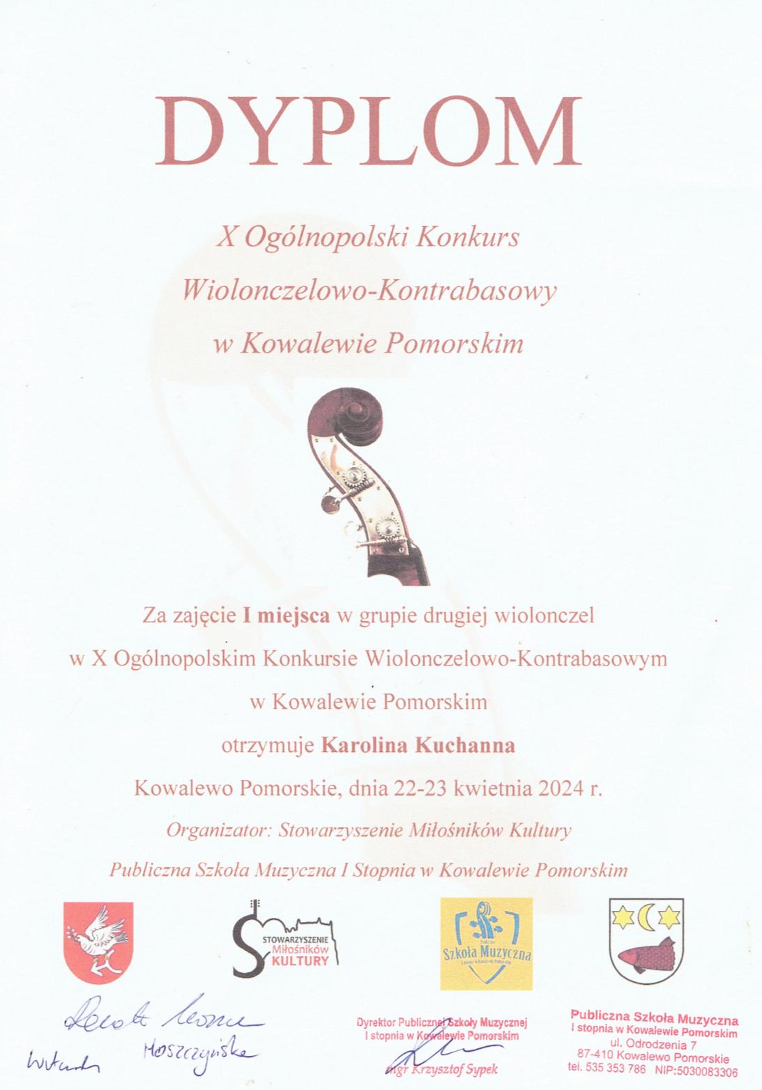 Końcówka kwietnia przyniosła nam wspaniałe wieści z konkursowych estrad. W dnich 22-23 kwietnia 2024 r. wiolonczelistki z klasu Pani Agnieszki Sucheckiej-Maćko odniosły sukcesy na X Ogólnopolskim Konkursie Wiolonczelowo-Kontrabasowym w Kowalewie Pomorskim: