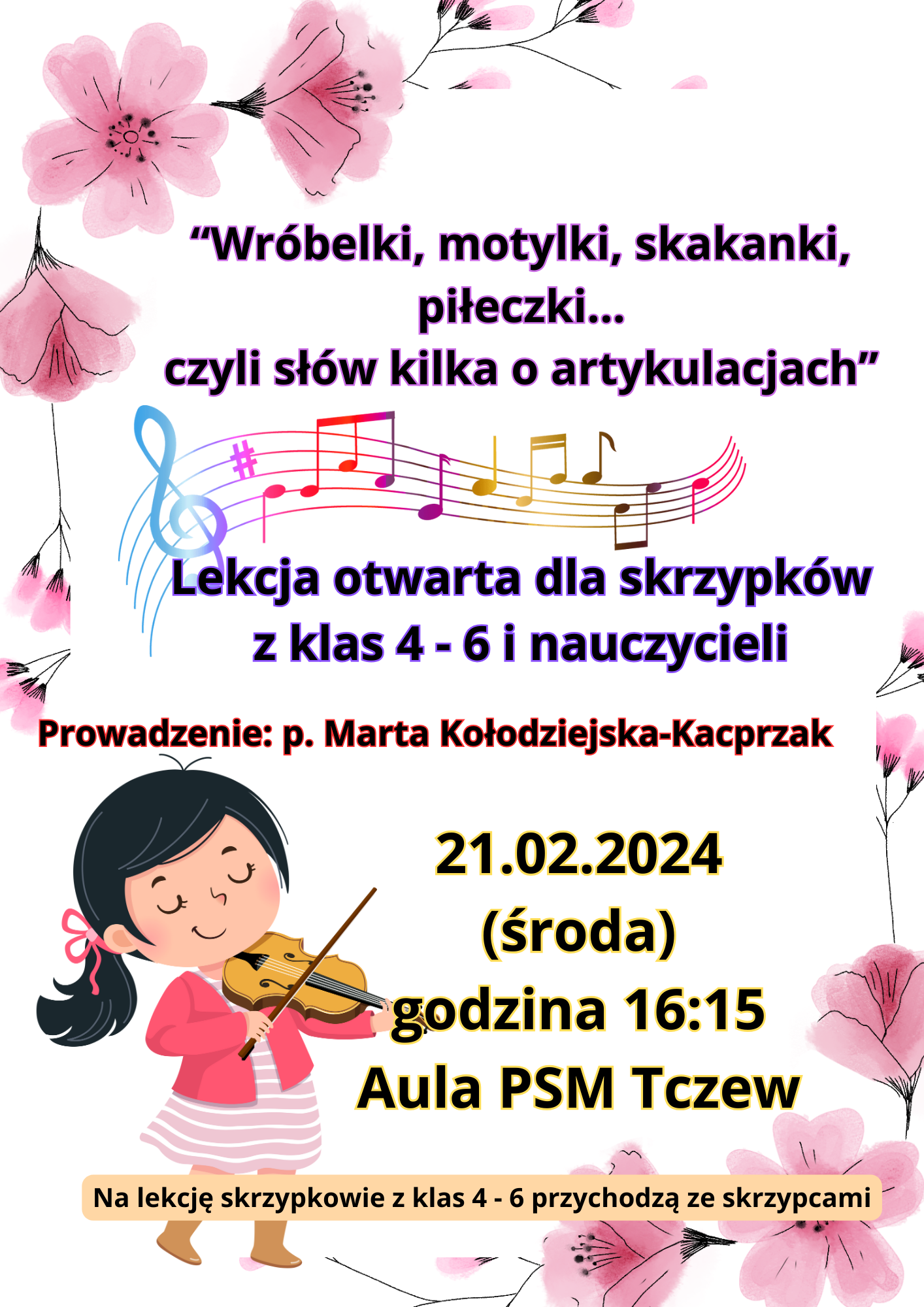 21 lutego 2024 na godzinie 16:15 zapraszamy skrzypków z klas 4 - 6 oraz nauczycieli i wszystkich innych chętnych, na lekcję otwartą prowadzoną przez p. Martę Kołodziejską-Kacprzak. Podczas tego spotkania rozmawiać będziemy o artykulacji w grze na skrzypcach - "Wróbelki, motylki, skakanki, piłeczki... czyli słów kilka o artykulacjach". Lekcja odbędzie się w auli PSM. Przypominamy, że jak na każdą lekcję, warto wziąć przybory, czyli w tym wypadku skrzypce. Zapraszamy.