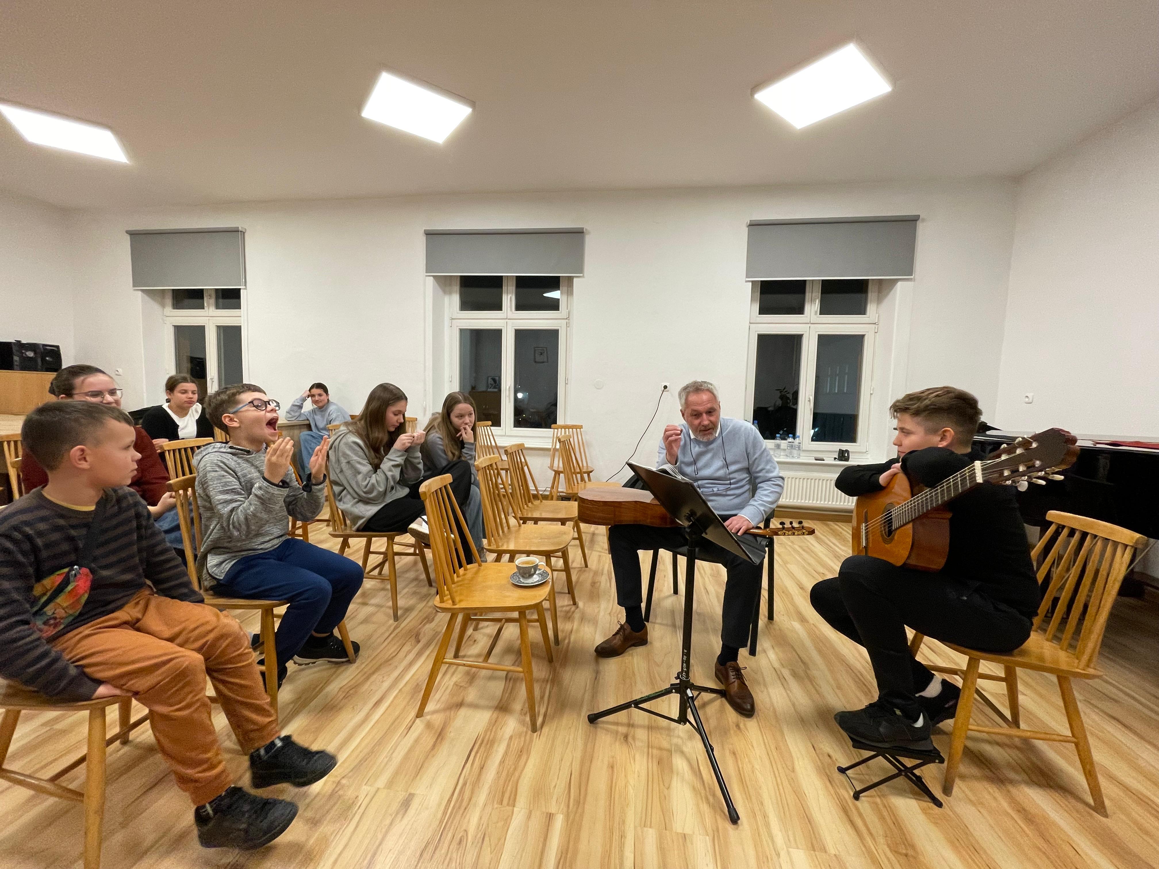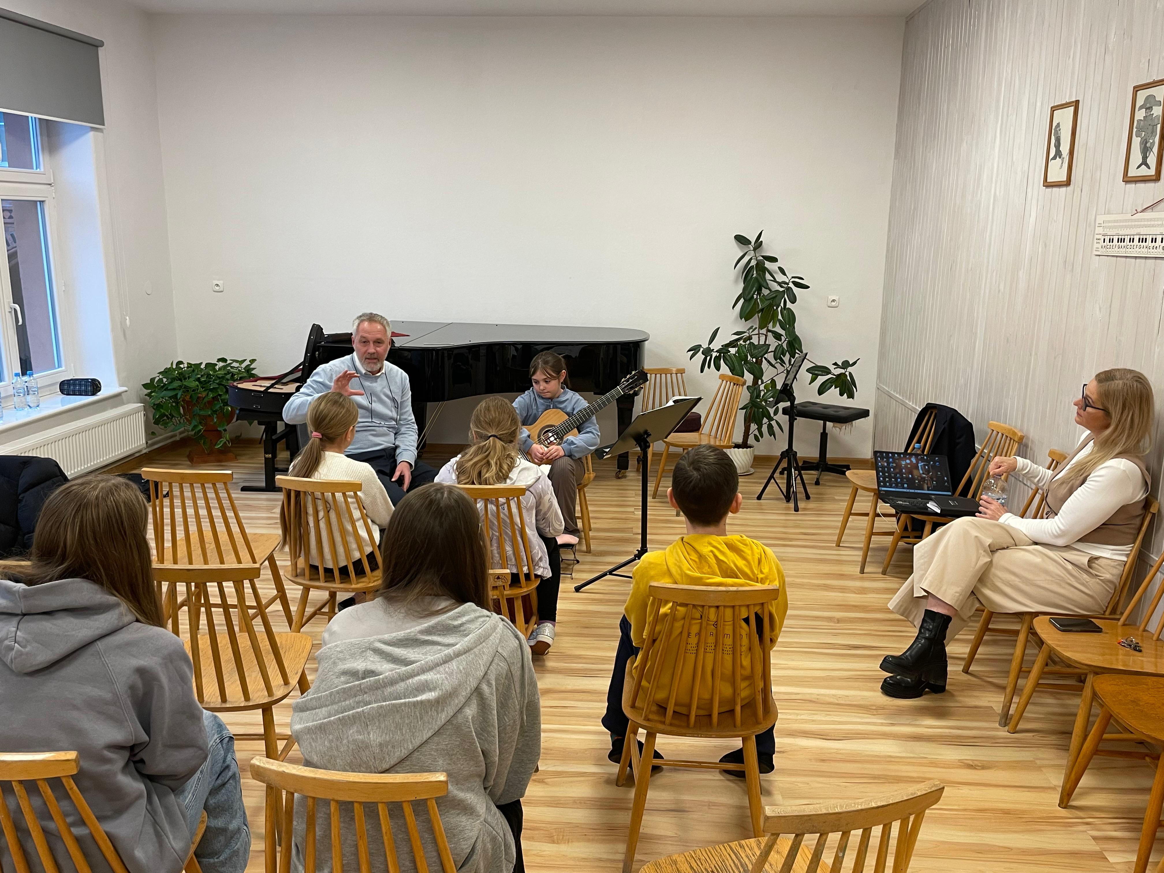 27 listopada br. odbyły się w naszej szkole warsztaty gitarowe - lekcje mistrzowskie z mgr Piotrem Nowakowskim. Dla naszych uczniów i nauczycieli było to niezwykle cenne spotkanie, podczas którego w przyjaznej i bardzo radosnej atmosferze uczniowie mogli zgłębiać tajniki sztuki gitarowej. Było bardzo dużo wskazówek technicznych, warsztatowych i muzycznych, za które bardzo serdecznie dziękujemy panu Piotrowi Nowakowskiemu.