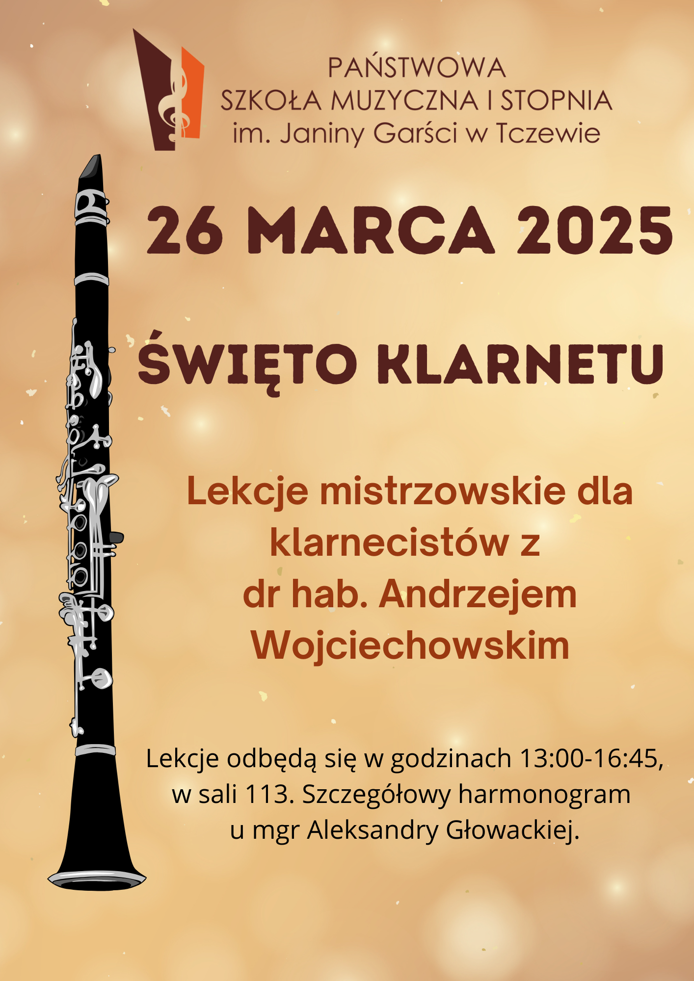 Wszystkich uczniów klasy klarnetu zapraszamy 26 marca 2025r. na ŚWIĘTO KLARNETU. Tego dnia w godzinach 13:00 - 16:45 odbędą się Lekcje mistrzowskie z dr hab. Andrzejem Wojciechowskim - sala 113. Dokładny harmonogram dostępny u mgr Aleksandry Głowackiej.