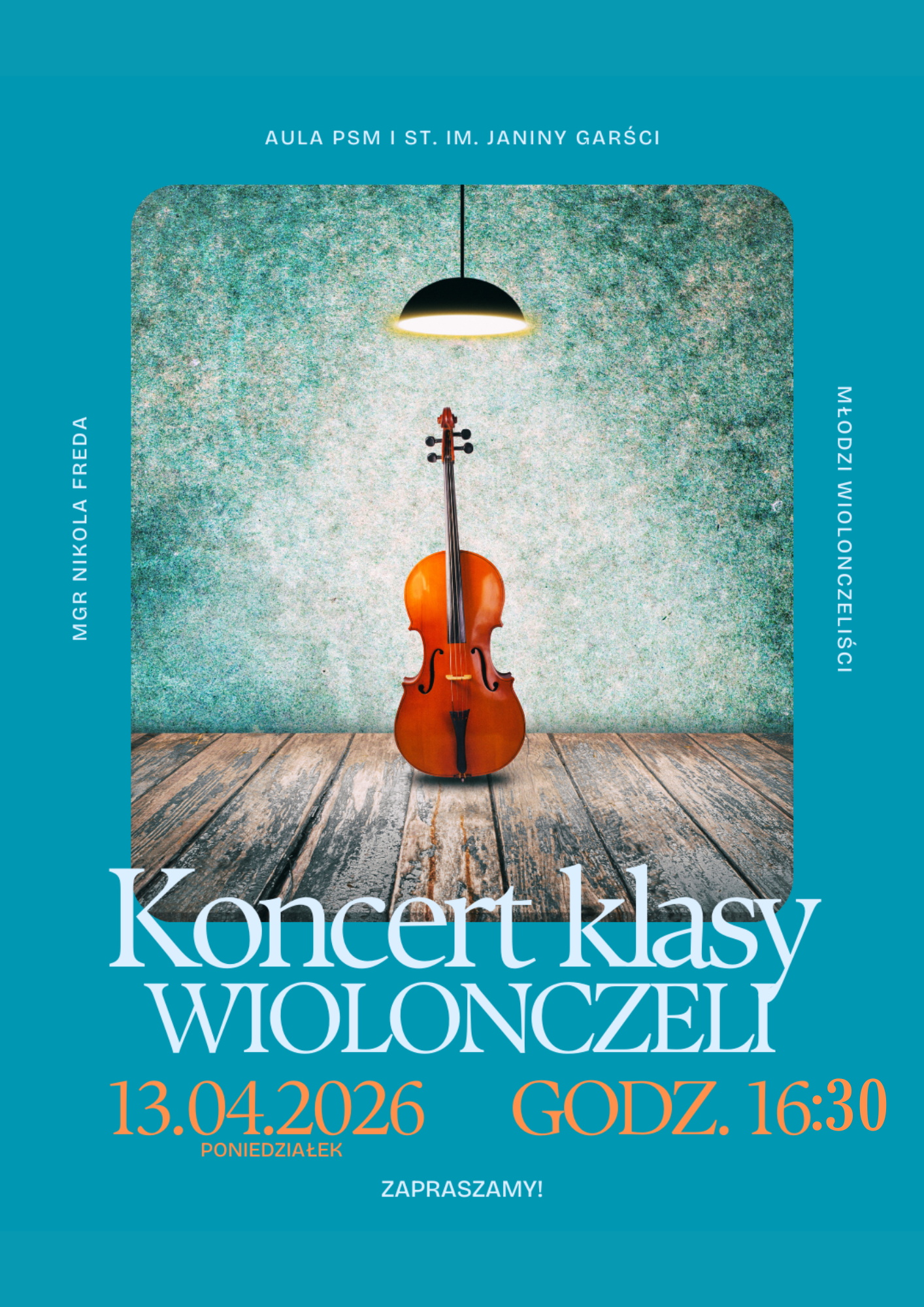 13.04.2026 (poniedziałek), godz. 16:30 - Koncert klasy wiolonczeli mgr Nikoli Fredy - sala koncertowa PSM,