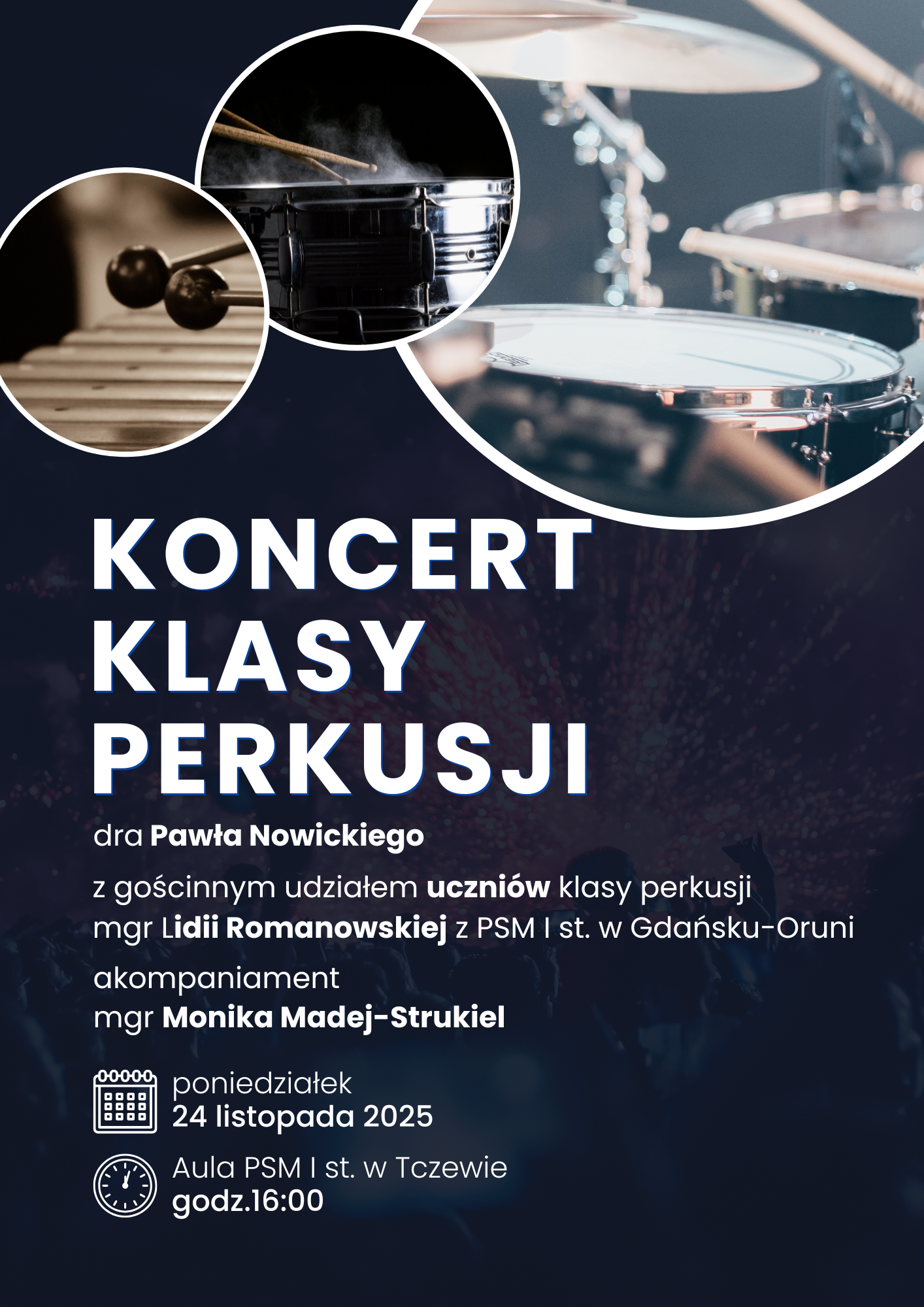 24.11.2025 (poniedziałek), godz. 16:00 - Koncert klasy perkusji dra Pawła Nowickiego z gościnnym udziałem klasy perkusji mgr Lidii Romanowskiej z PSM I st. w Gdańsku Oruni - sala koncertowa PSM Tczew