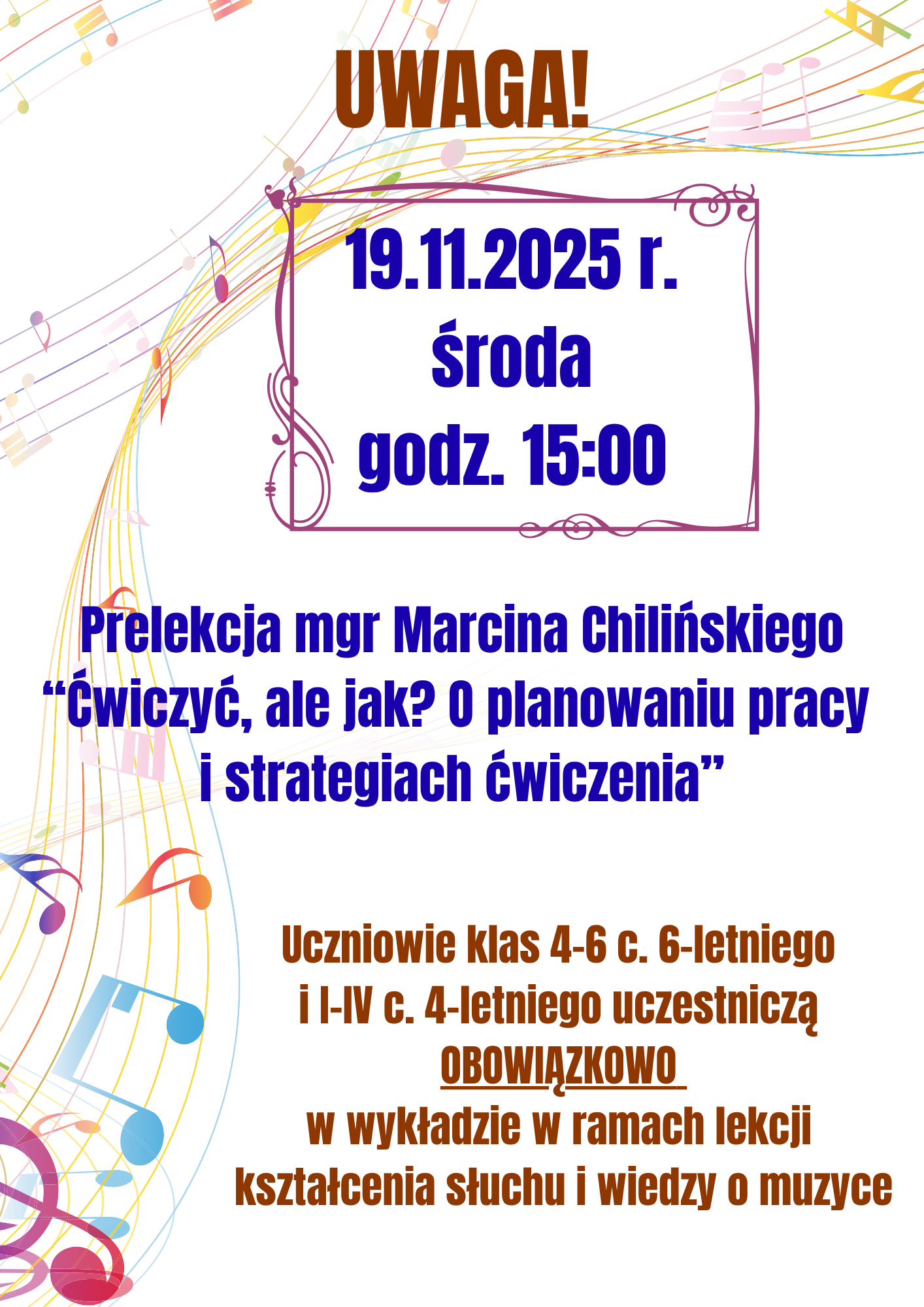 19.11.2025 (środa), godz. 15:00 - Prelekcja mgr Marcina Chilińskiego - "Ćwiczyć, ale jak? O planowaniu pracy i strategiach ćwiczenia" - Uczniowie klas 4-6 c. 6-letniego i I-IV c. 4-letniego uczestniczą OBOWIĄZKOWO w wykładzie w ramach zajęć kształcenia słuchu i wiedzy o muzyce.