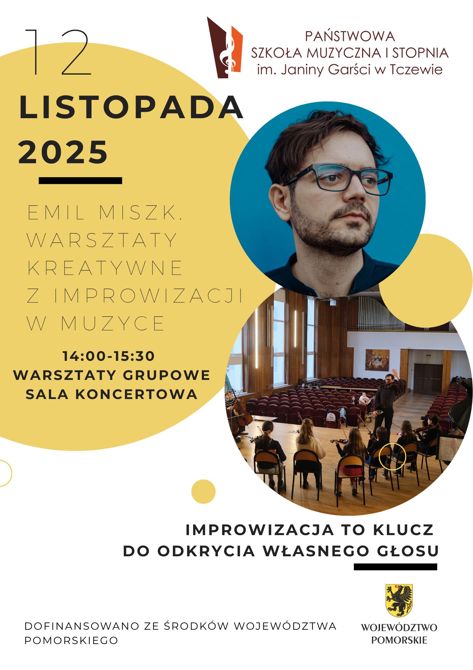 12.11.2025 (środa), godz. 14:00-15:30 - Warsztaty kreatywne z improwizacji w muzyce - prowadzenie Emil Miszk - sala koncertowa PSM Tczew; dla chętnych zapraszamy na KONCERT muzyki improwizowanej 12.11.2025 godz. 18:00 w CKiS