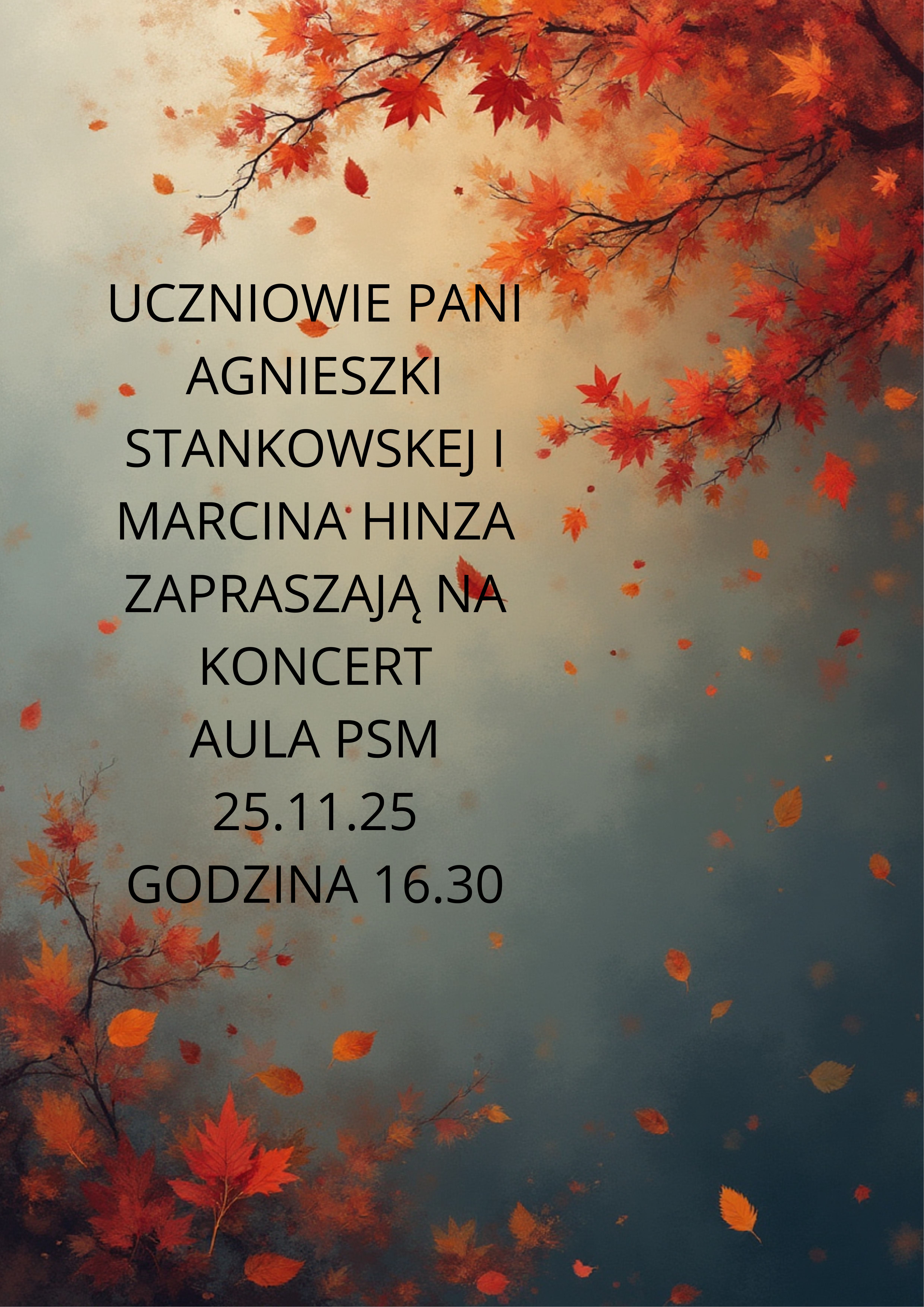 25.11.2025 (wtorek), godz. 16:30 - Koncert klasy fortepianu mgr Agnieszki Stankowskiej i mgr Marcina Hinza oraz klasy akordeonu mgr Pawła Ratajka - sala koncertowa PSM Tczew