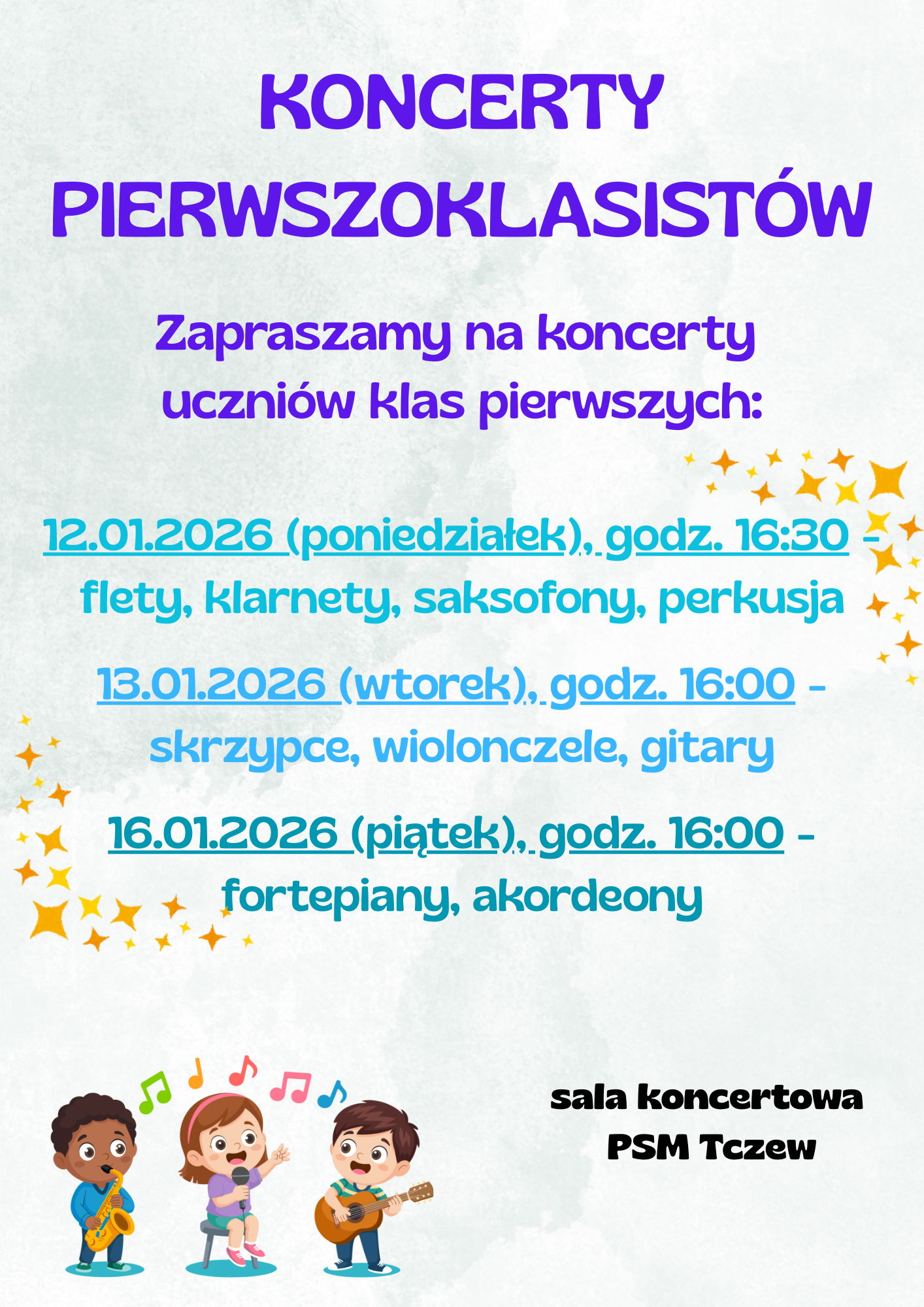 12 stycznia 2026 (poniedziałek), godz. 16:30 - KONCERT PIERWSZOKLASITSÓW - flety, klarnety, saksofony, perkusja - sala koncertowa PSM Tczew,