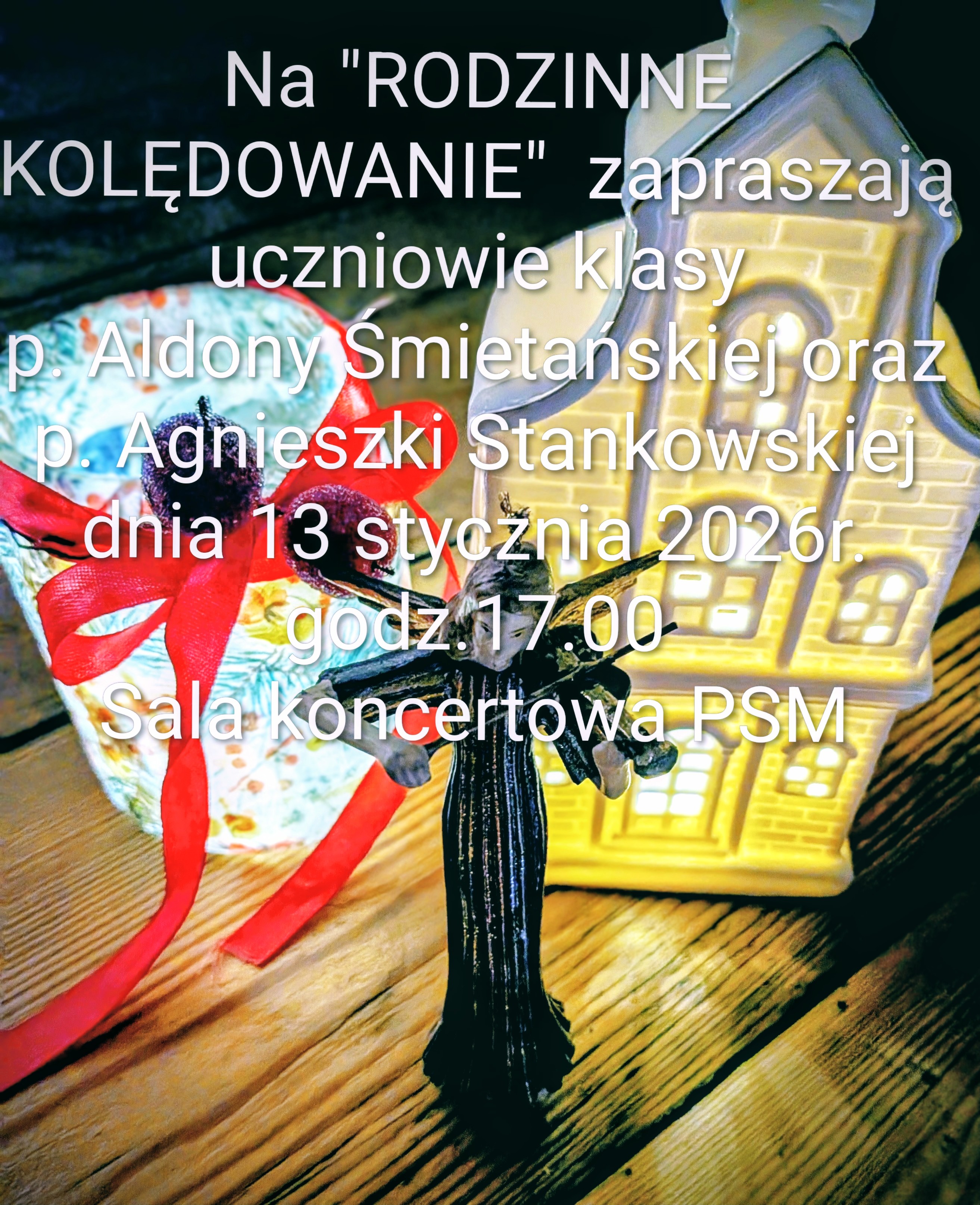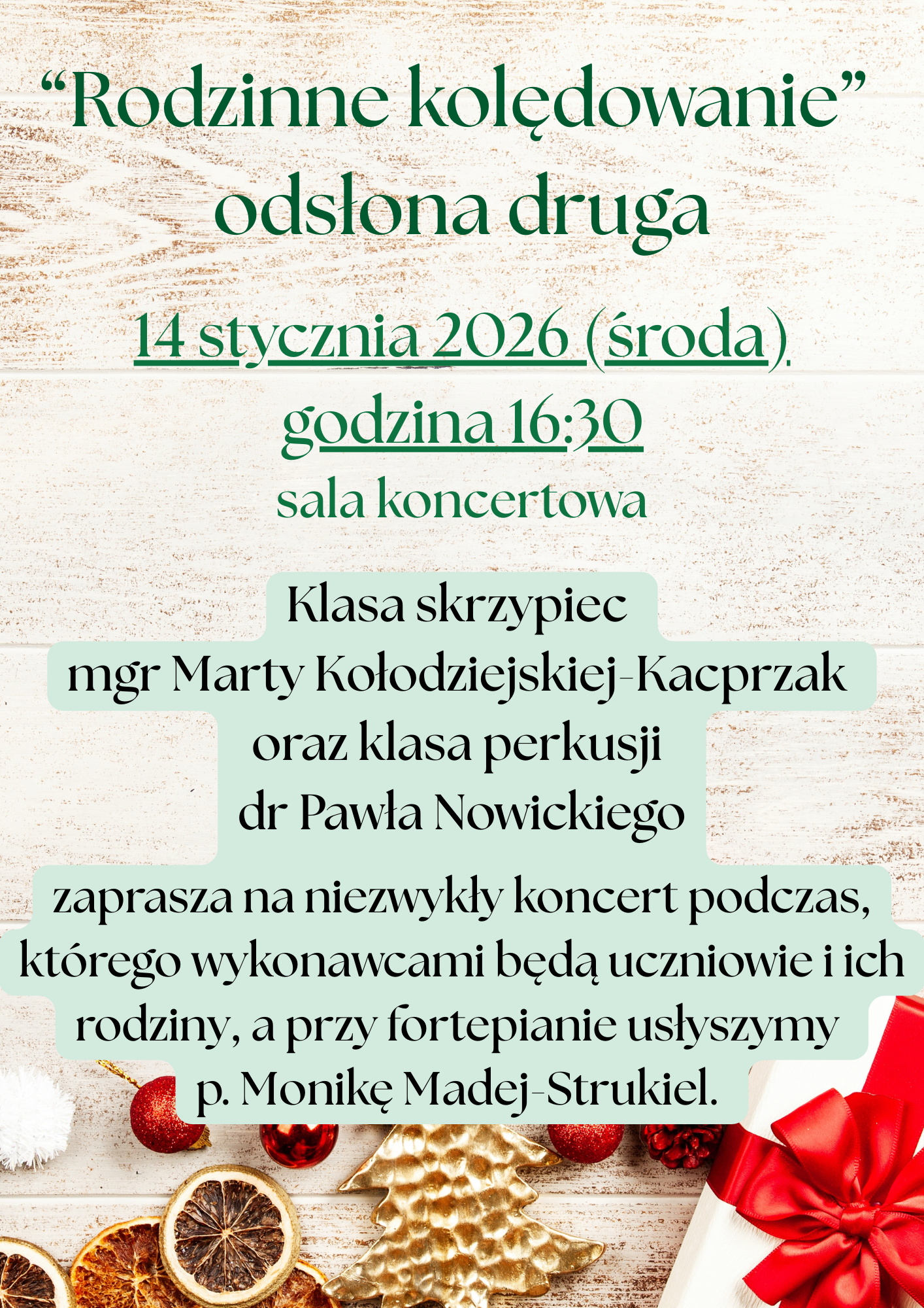 14 stycznia 2026 (środa), godz. 16:30 - Koncert "Rodzinne kolędowanie - odsłona druga" - uczniowie p. Marty Kołodziejskiej-Kacprzak i p. Pawła Nowickiego - sala koncertowa PSM Tczew,