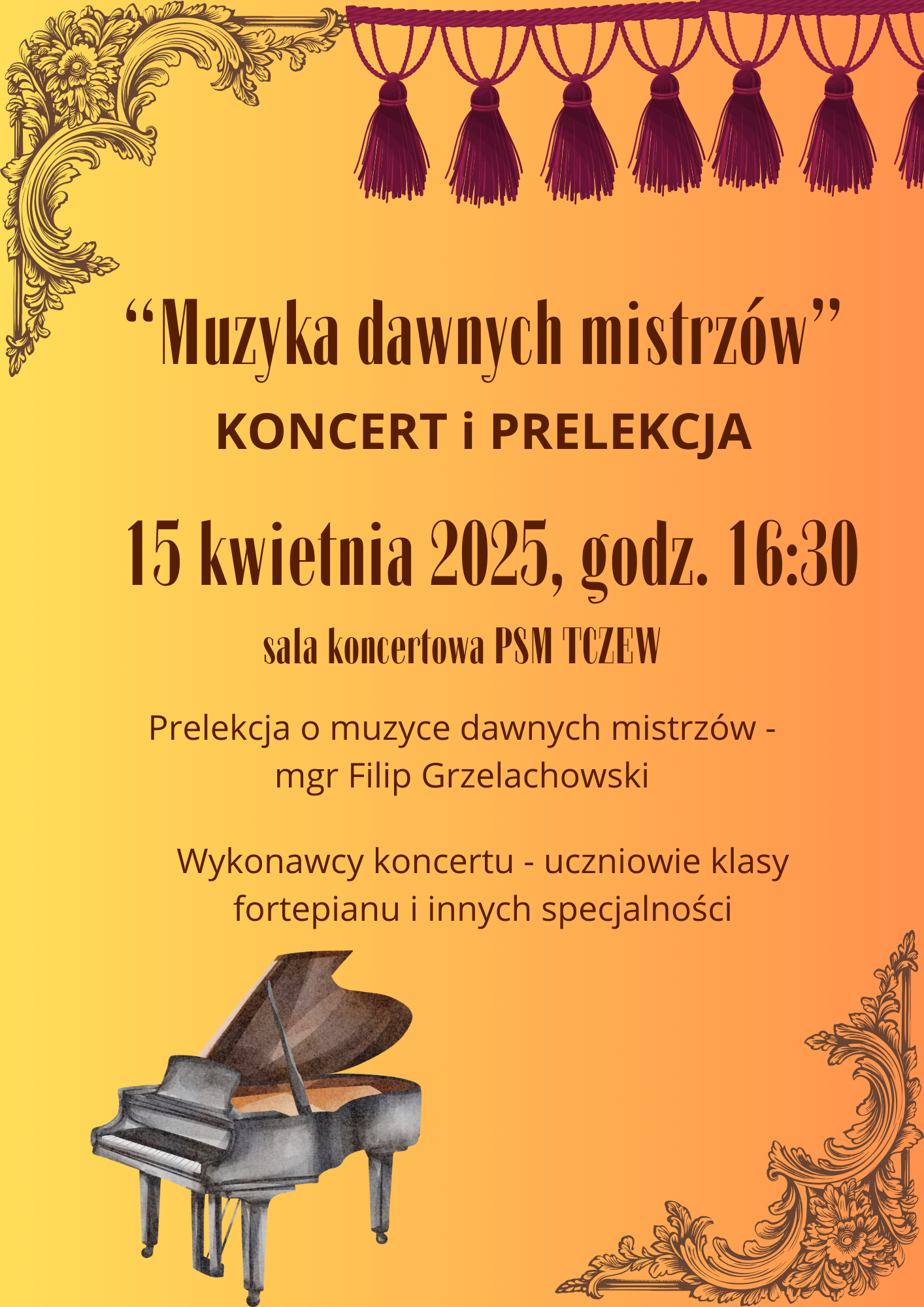 15 kwietnia 2025 (wtorek) na godzinę 16:30 do sali koncertowej szkoły muzycznej zapraszamy na KONCERT i PRELEKCJĘ - "Muzyka dawnych mistrzów". Prelekcję wygłosi mgr Filip Grzelachowski, a podczas koncertu wystąpią uczniowie klasy fortepianu i innych specjalności.