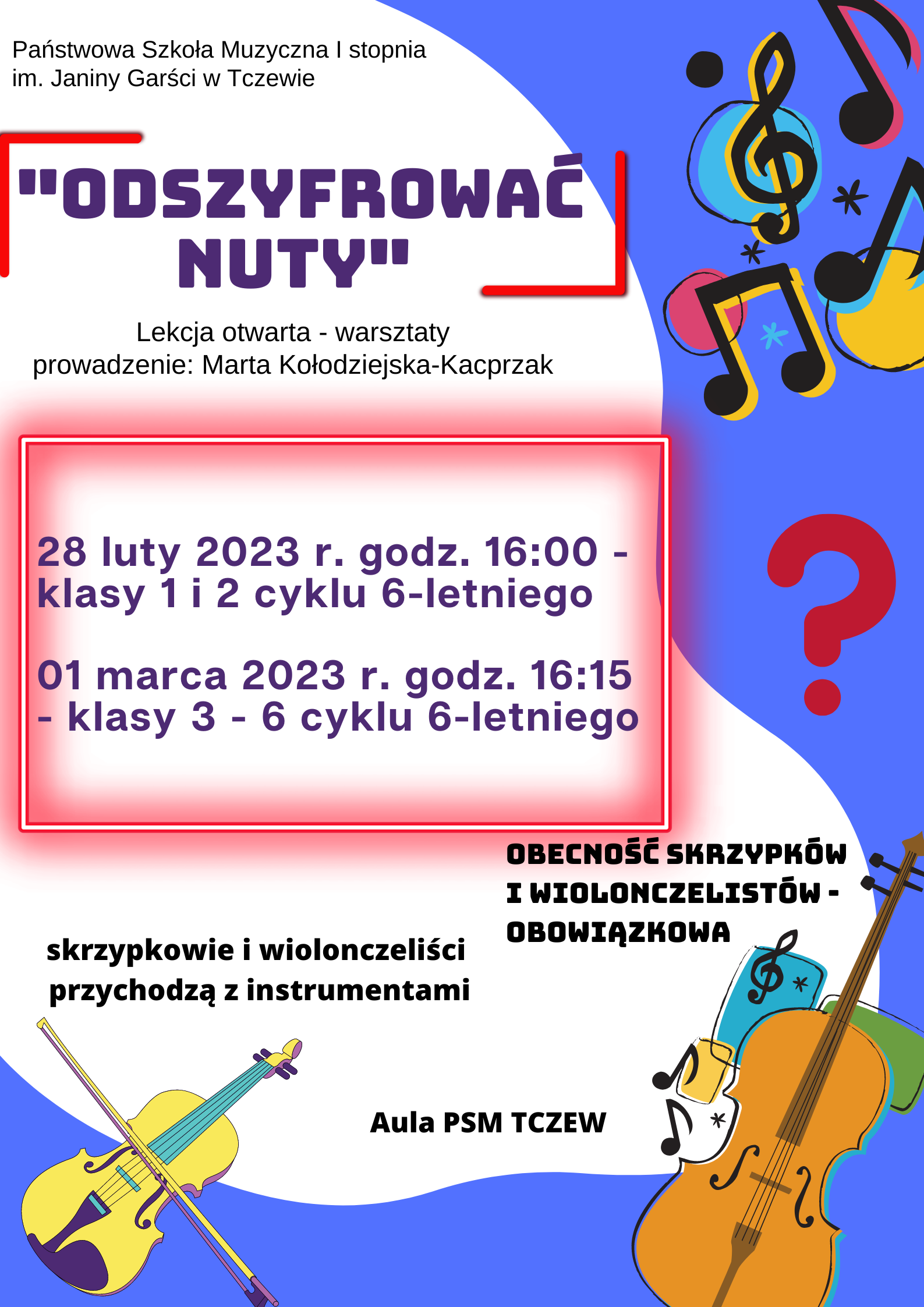 28 lutego 2023 r. (wtorek) na godzinę 16:00 zapraszamy uczniów klas 1 i 2 cyklu 6-letniego na lekcję otwartą - warsztaty dotyczące "odszyfrowania tekstu nutowego". Na tych zajęciach prowadząca - Marta Kołodziejska-Kacprzak - razem z uczniami rozkoduje różne muzyczne znaczki, by finalnie wszyscy usłyszeli znany utwór. Warsztaty przewidziane są dla wszystkich uczniów z klasy 1 i 2 cyklu 6-letniego. Obecność skrzypków i wiolonczelistów wraz ze swoimi instrumentami jest obowiązkowa.