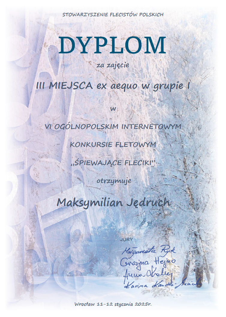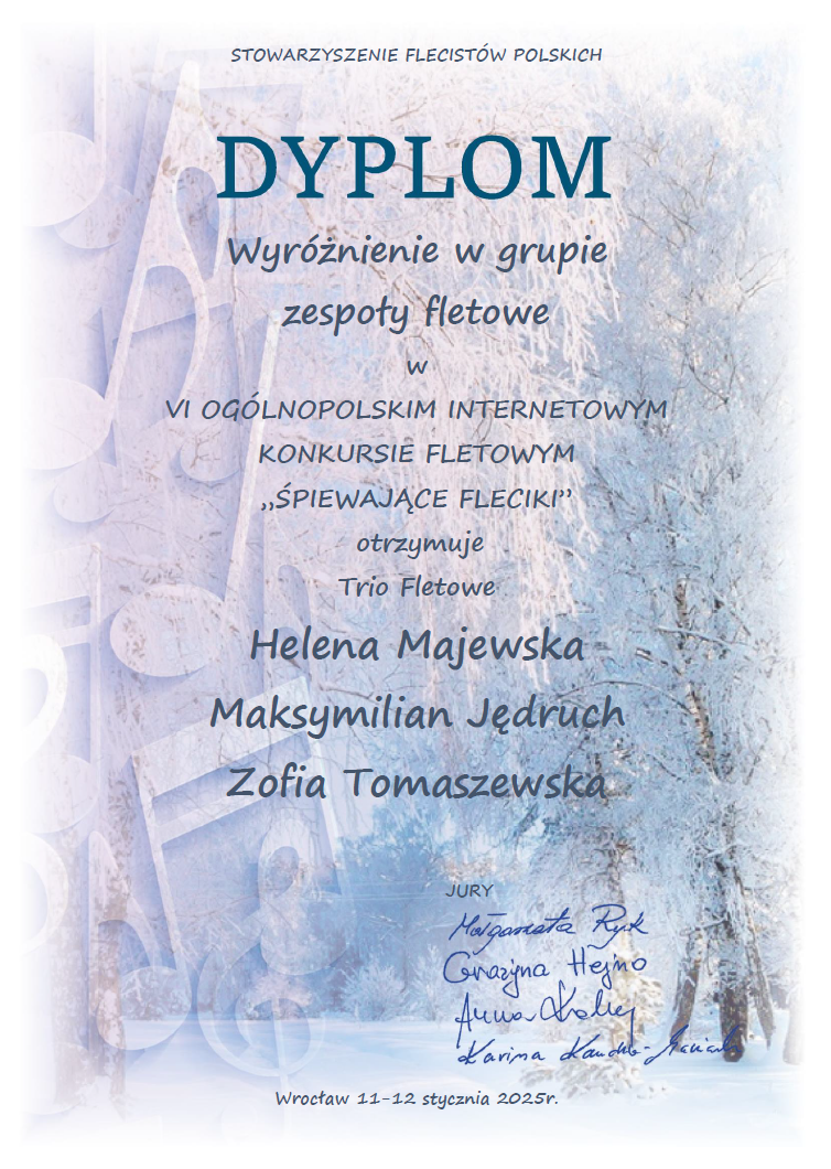 Podczas VI Ogólnopolskiego Internetowego Konkursu Fletowego "Śpiewające Fleciki" (11-12.01.2025, Wrocław) nasi uczniowie za swą wytrwałość w codziennym ćwiczeniu i rozwój talentów otrzymali nagrody: