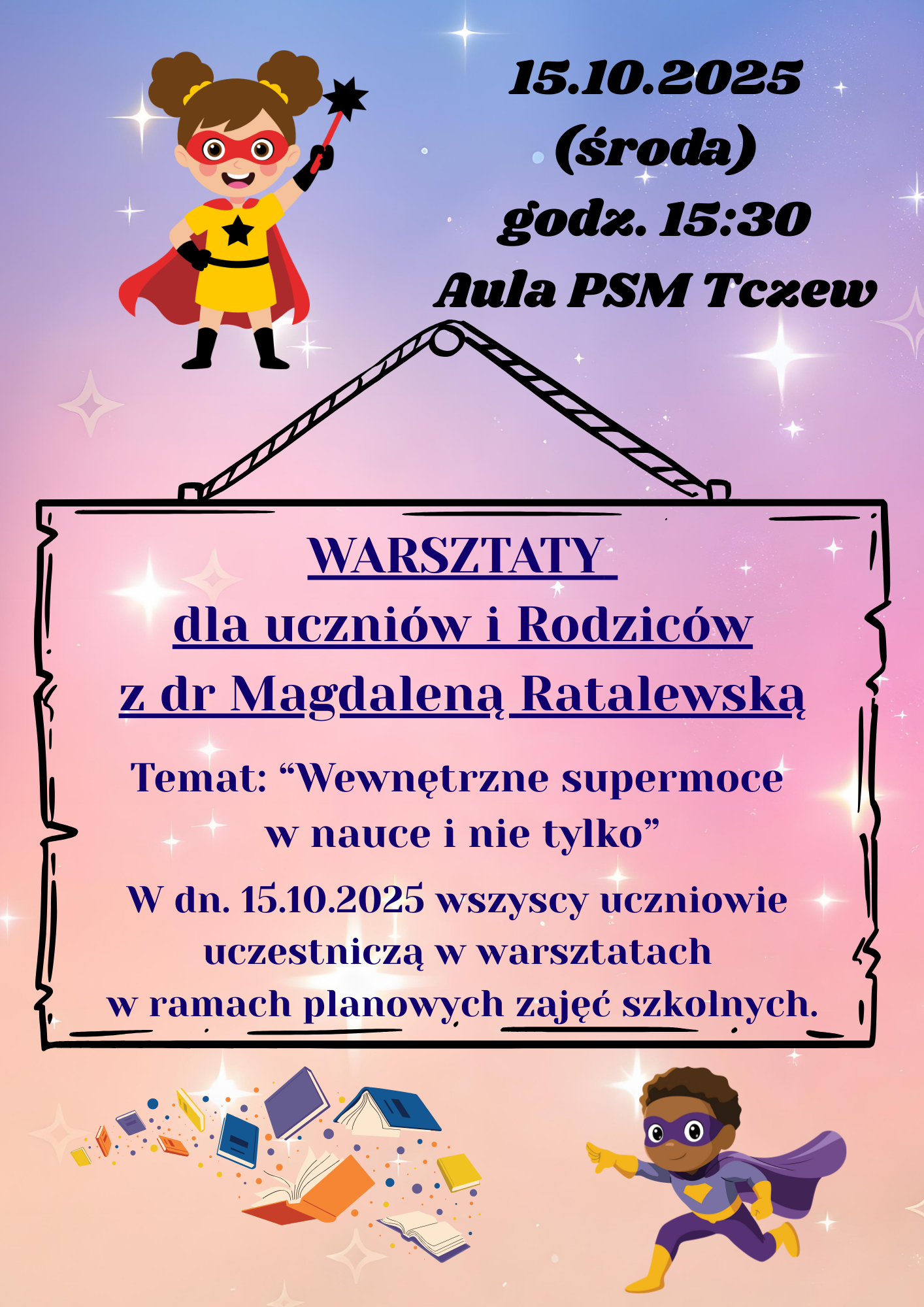 15 października 2025 (środa), godz. 15:30 - Spotkanie z dr Magdaleną Ratalewską - Warsztaty dla uczniów i Rodziców "Wewnętrzne supermoce w nauce i nie tylko". Tego dnia planowe zajęcia zostają zawieszone (grupowe i indywidualne), a uczniowie w ramach zajęć uczestniczą w warsztatach z ekspertem o godzinie 15:30 (sala koncertowa PSM Tczew).
