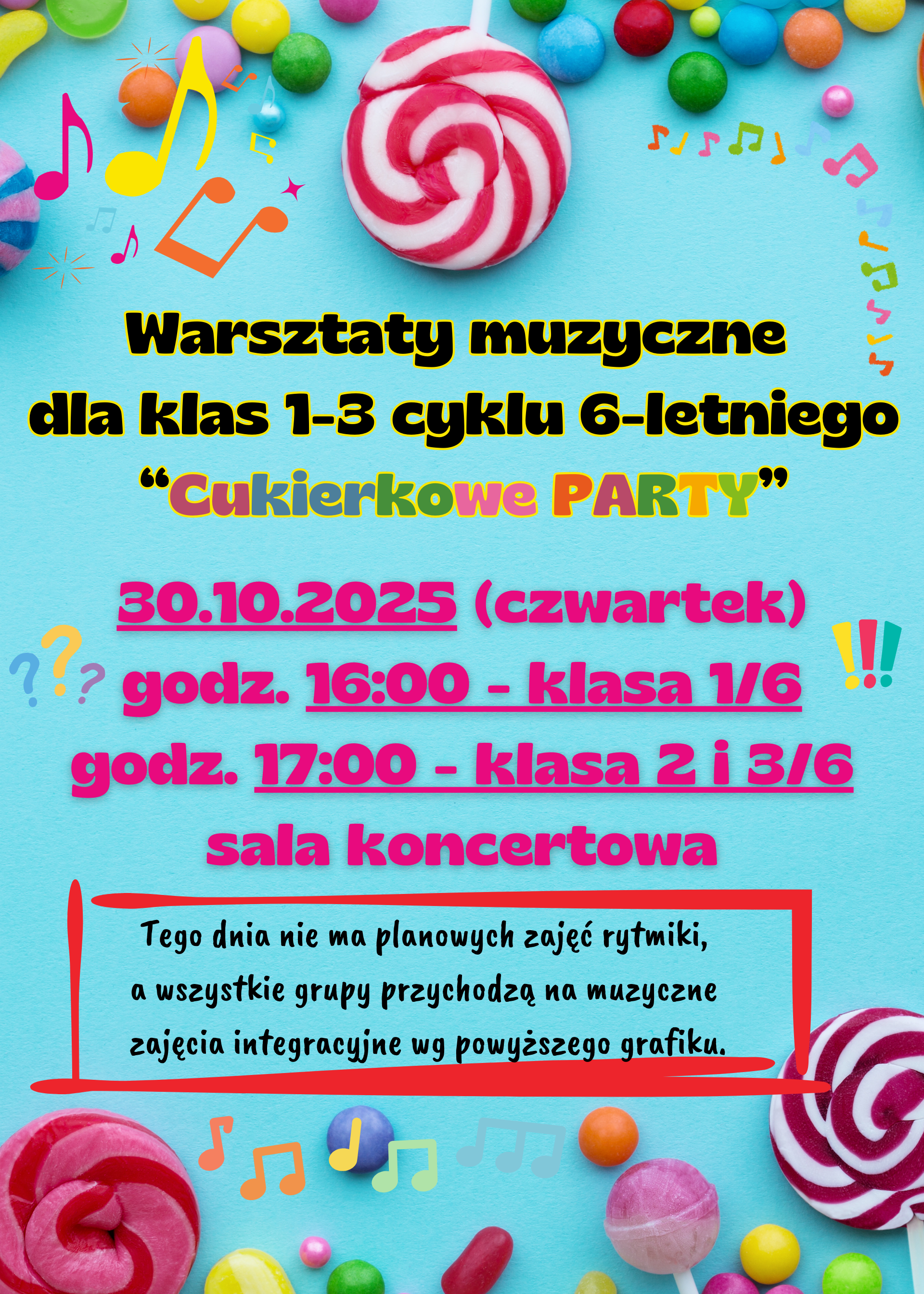 30 października 2025 (czwartek) - "Cukierkowe PARTY" - Zajęcia integracyjne dla klas 1-3 cyklu 6-letniego. Tego dnia nie ma planowych zajęć rytmiki i kształcenia słuchu, a uczniowie przychodzą w grupach: godz. 16:00 - klasa 1/6, godz. 17:00 - klas 2 i 3/6 (sala koncertowa PSM Tczew).