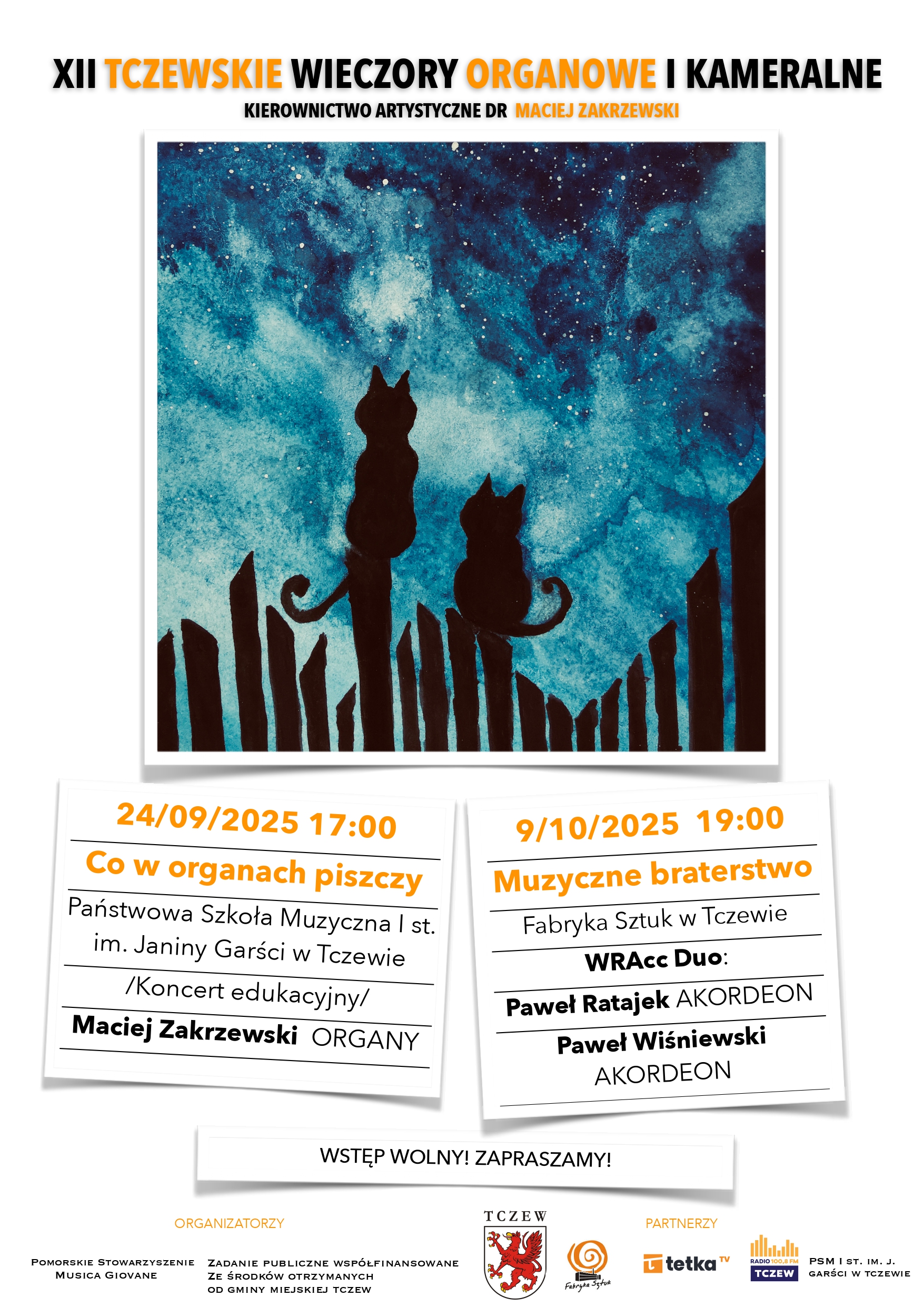 09 października 2025 (czwartek) - "Muzyczne braterstwo" - Koncert w ramach XII Tczewskich wieczorów organowych i kameralnych - wykonawcami koncertu będzie zespół WRAcc Duo: Paweł Ratajek (akordeon) i Paweł Wiśniewski (akordeon). Pan Paweł Ratajek jest nauczycielem naszej szkoły, zatem bardzo zachęcamy do udziału w Koncercie (Fabryka Sztuk w Tczewie).