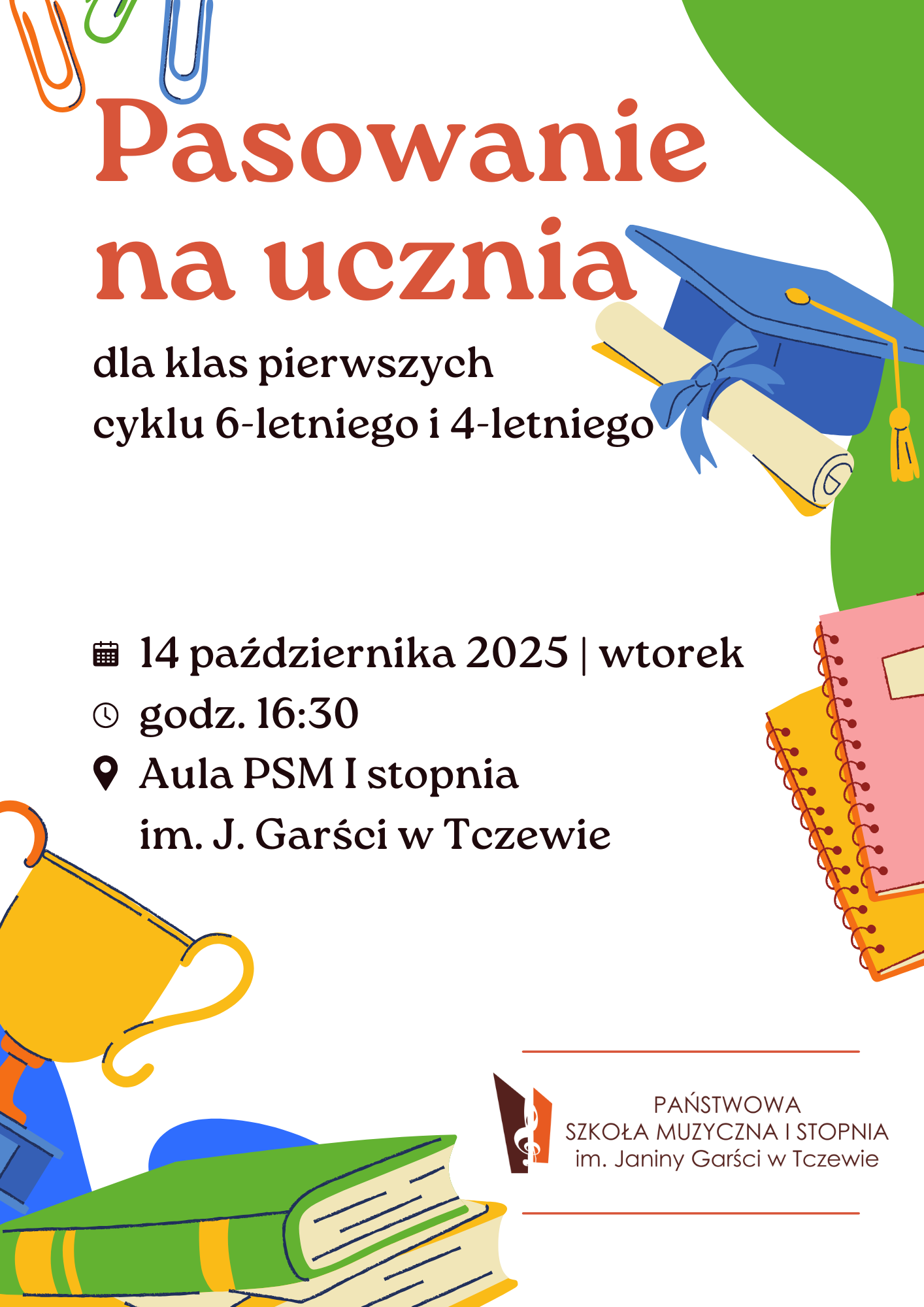 14 października 2025 (wtorek), godz. 16:30 - Uroczyste Pasowanie na ucznia Szkoły Muzycznej - wszyscy uczniowie klas 1/6 i I/4 oraz wyznaczeni uczniowie z klas starszych uczestniczą w Koncercie o godz. 16:30. Tego dnia nie ma zajęć. (sala koncertowa PSM Tczew)