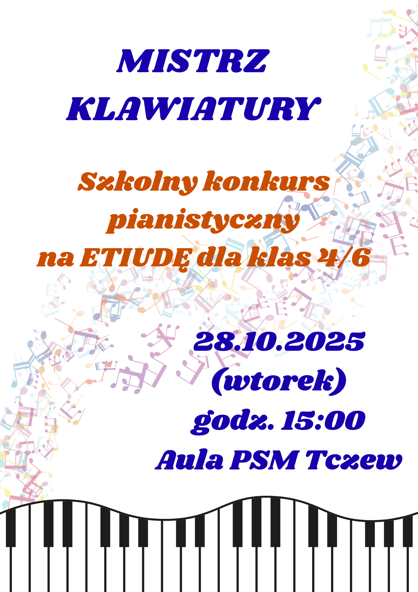 28 października 2025 (wtorek), godz. 15:00 - MISTRZ KLAWIATURY - Szkolny konkurs pianistyczny na ETIUDĘ dla klasy 4/6 (sala koncertowa PSM Tczew)