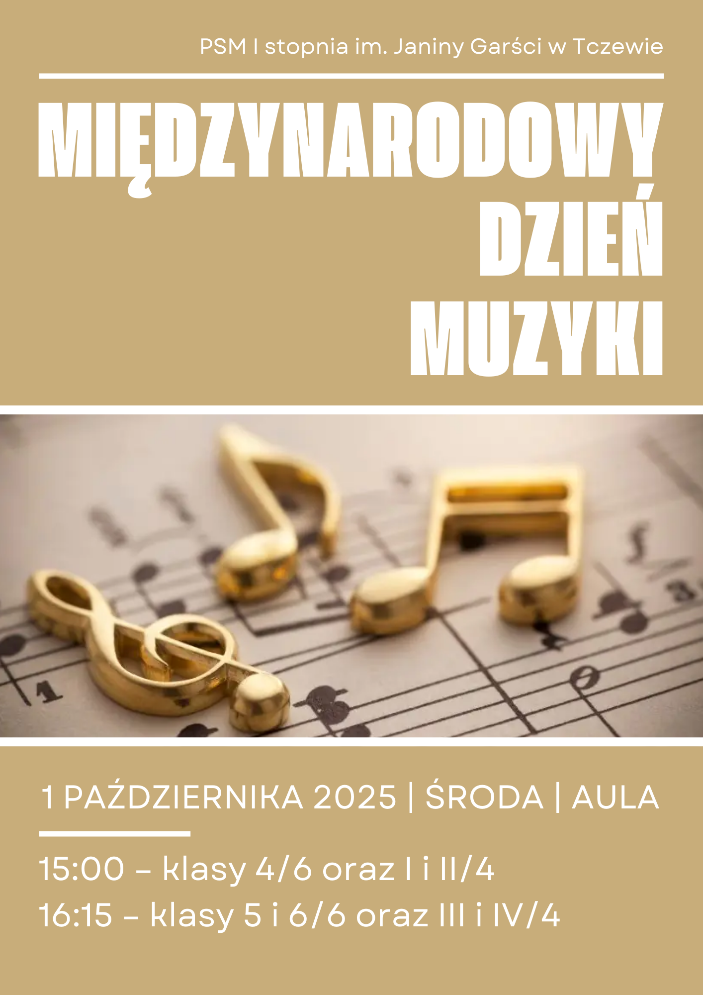 01 października 2025 (środa) - Międzynarodowy Dzień Muzyki - w ramach lekcji kształcenia słuchu i wiedzy o muzyce tego dnia uczniowie przychodzą na integracyjne zajęcia w grupach: godz. 15:00 - klasy 4/6, I/4 i II/4, godz. 16:15 - klasy 5/6, 6/6, III/4 i IV/4 (sala koncertowa PSM Tczew).