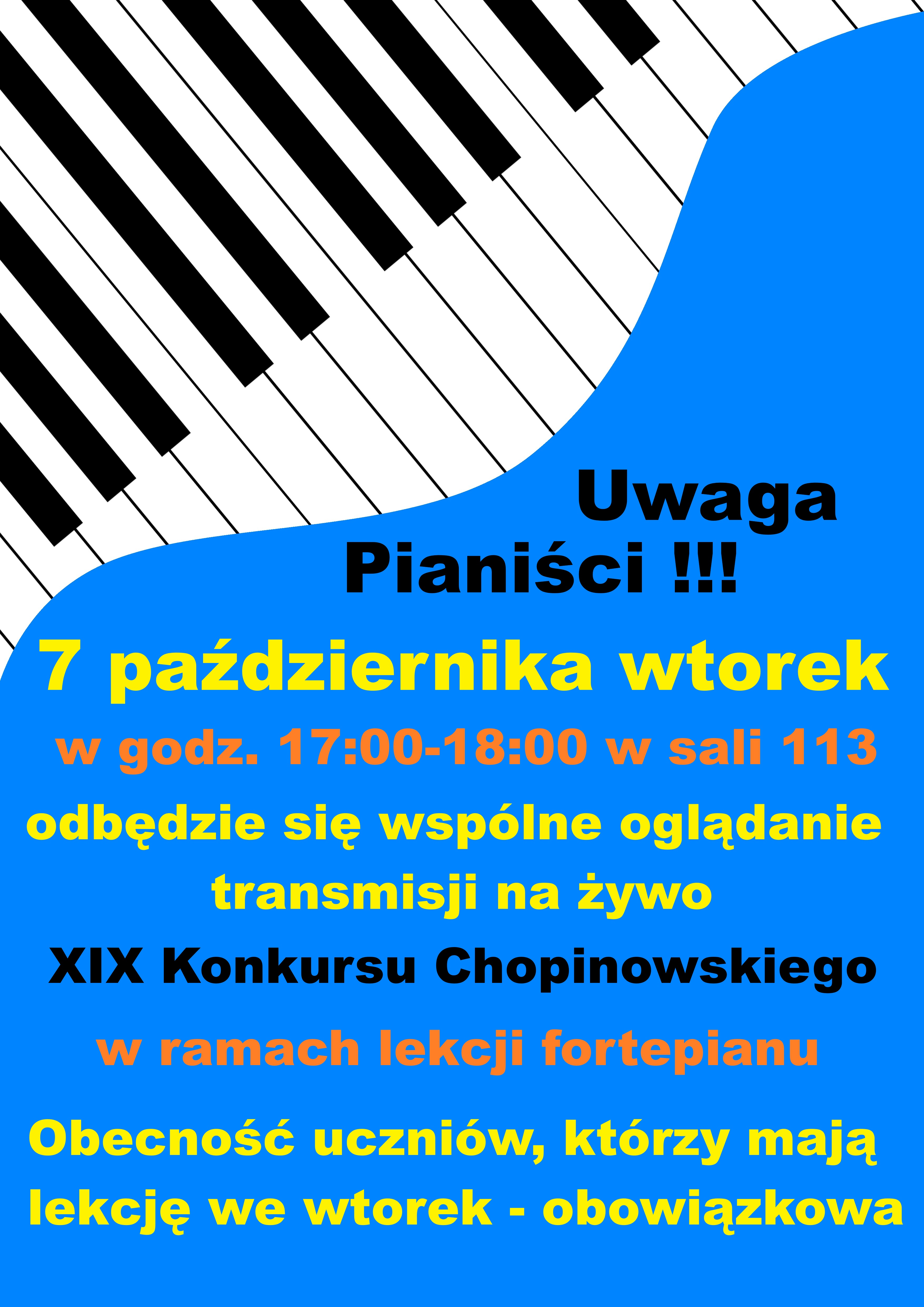 07 października 2025 (wtorek) - w godz. 17:00-18:00 w sali 113 - Wspólne oglądanie transmisji XIX Konkursu Chopinowskiego. Obecność pianistów - obowiązkowa.