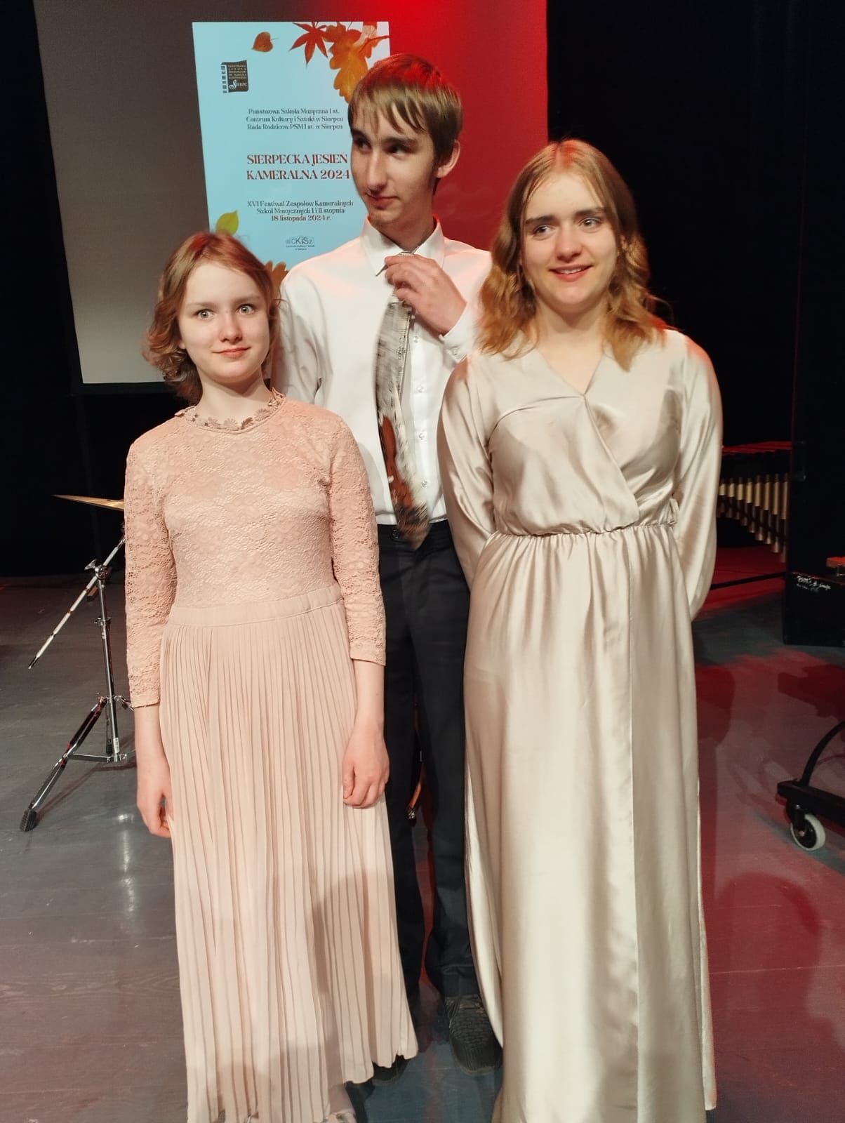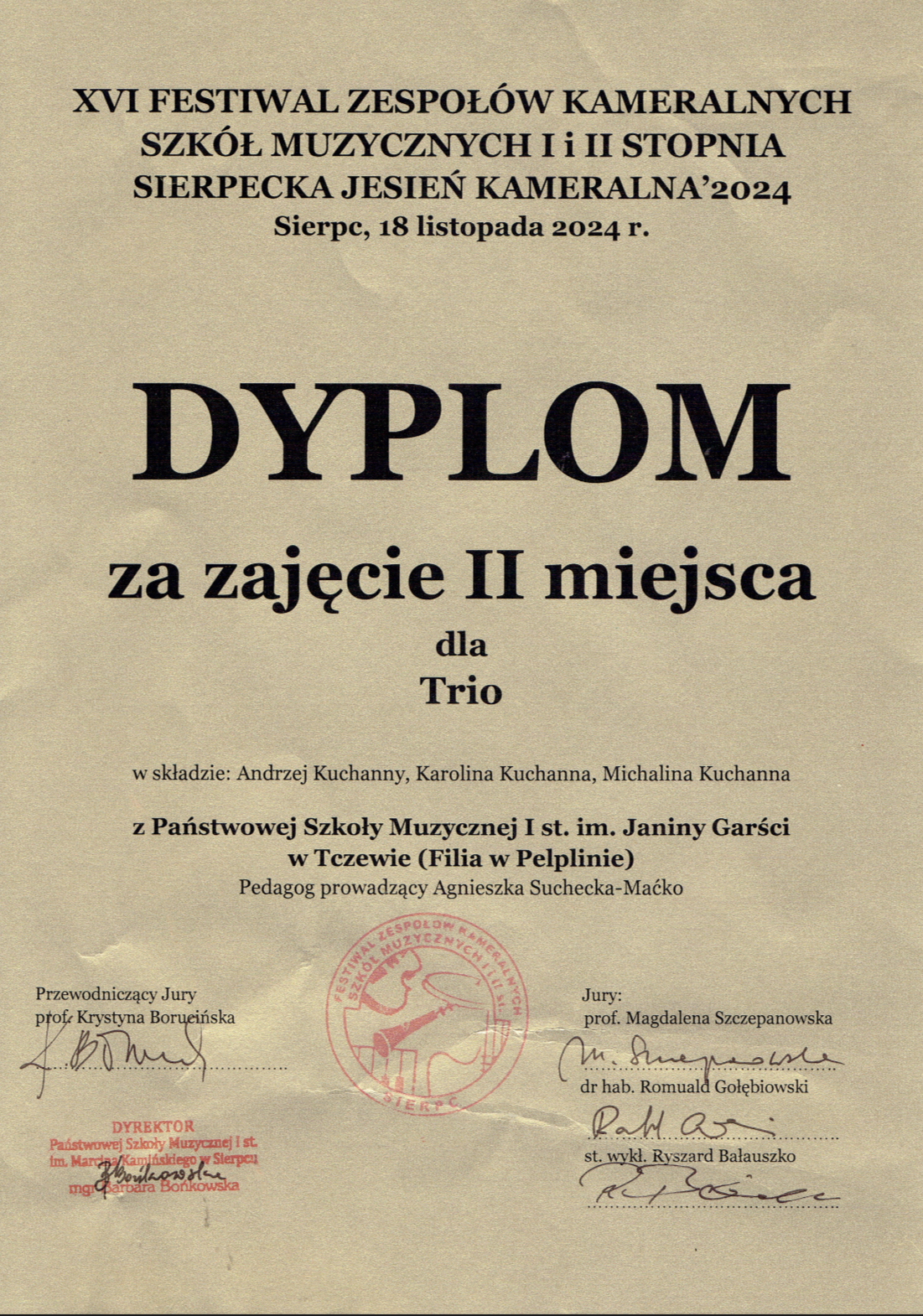 Z kolei dnia 18 listopada 2024 r. w Sierpcu podczas XVI Festiwalu Zespołów Kameralnych Szkół Muzycznych I i II Stopnia "Sierpecka Jesień Kameralna" nasze trio w składzie Michalina, Karolina, Andrzej Kuchanni zdobyli II miejsce. Zespół przygotowały pani Agnieszka Suchecka-Maćko oraz pani Krystyna Dettlaff-Czocher.